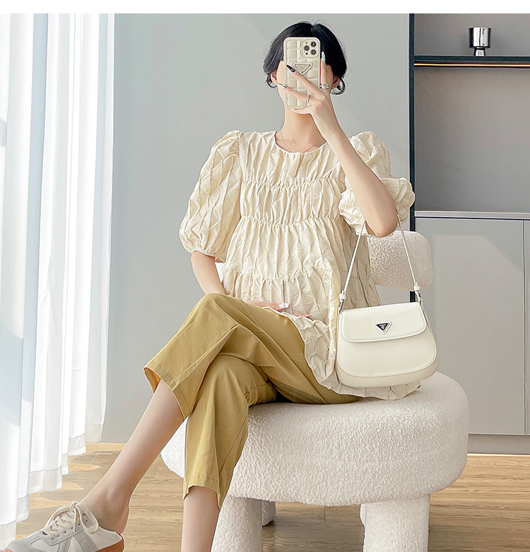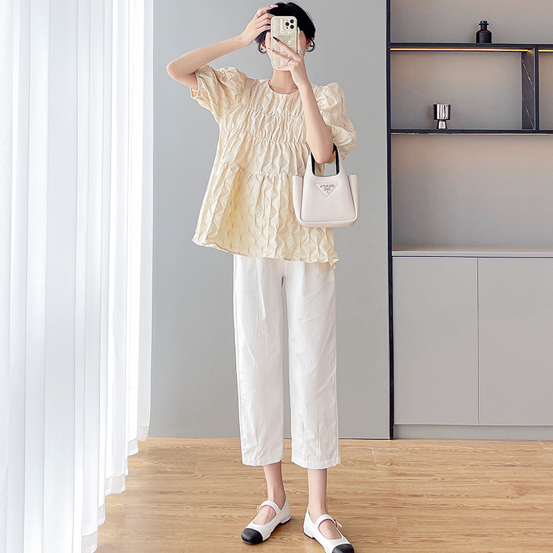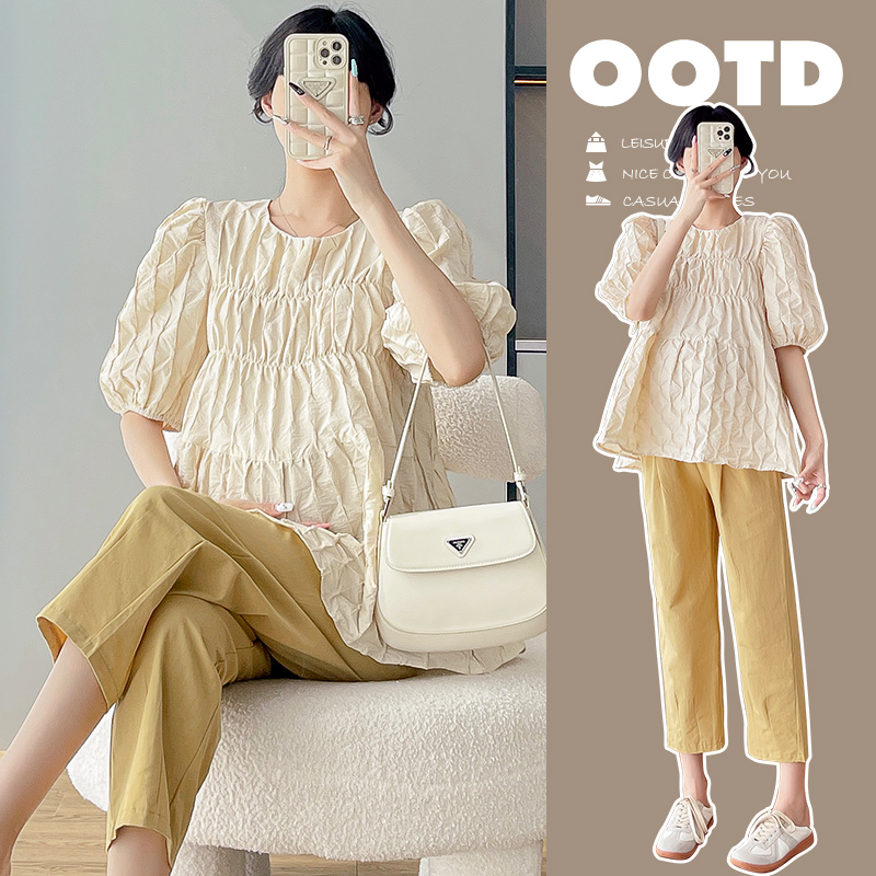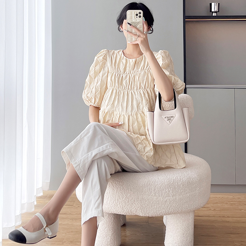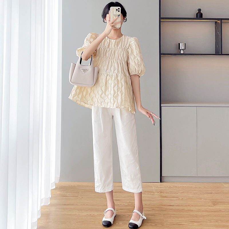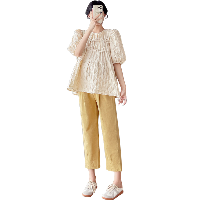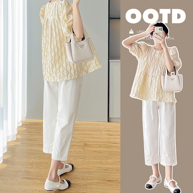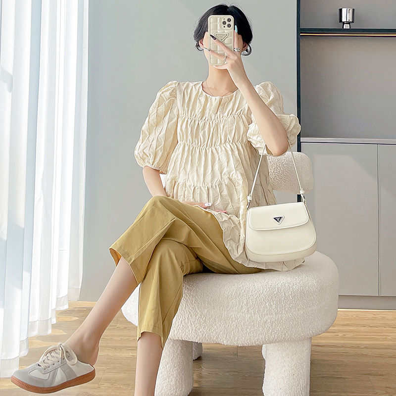 주간 고양이 품질 실사 여름 임산부 프랑스식 디자인 센스 주름 거품 소매 맨위 베이지 색 넓은 다리가 짧다. 바지