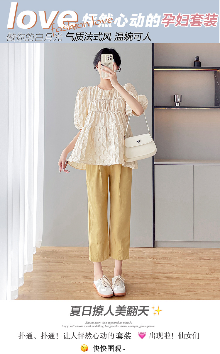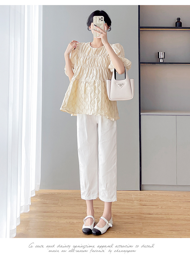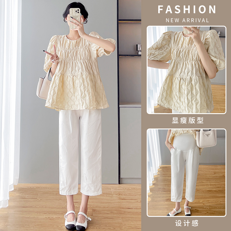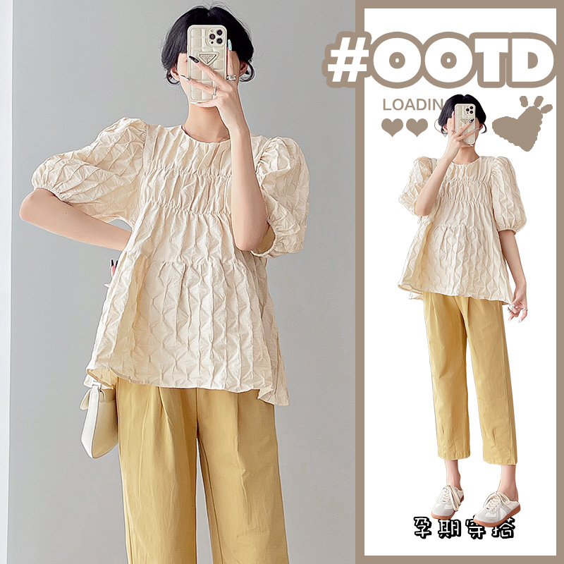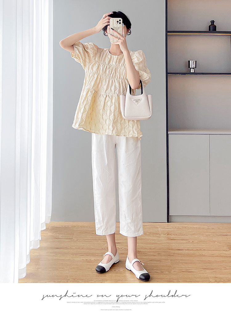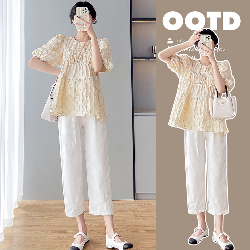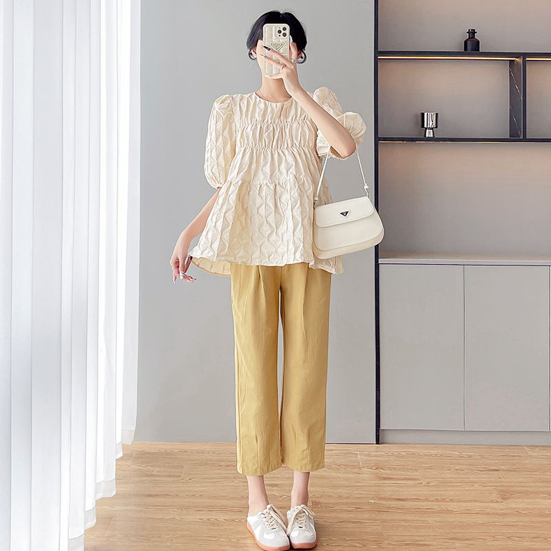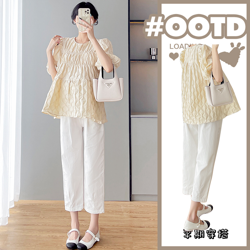 주간 고양이 품질 실사 여름 임산부 프랑스식 디자인 센스 주름 거품 소매 맨위 베이지 색 넓은 다리가 짧다. 바지