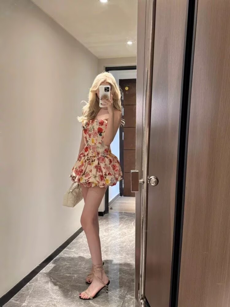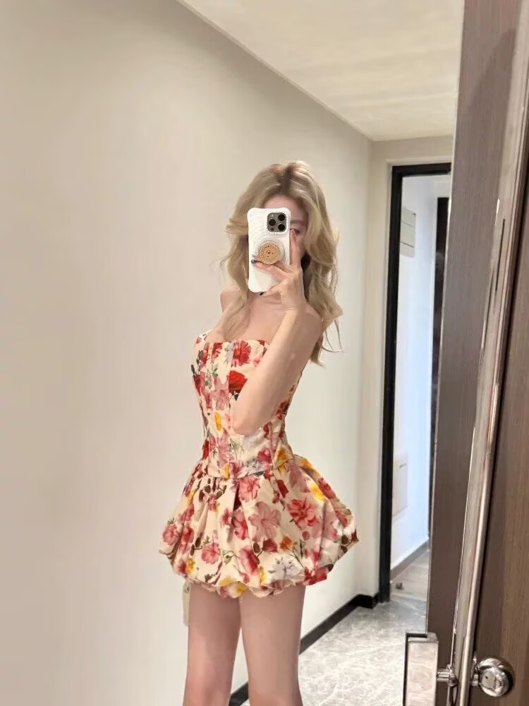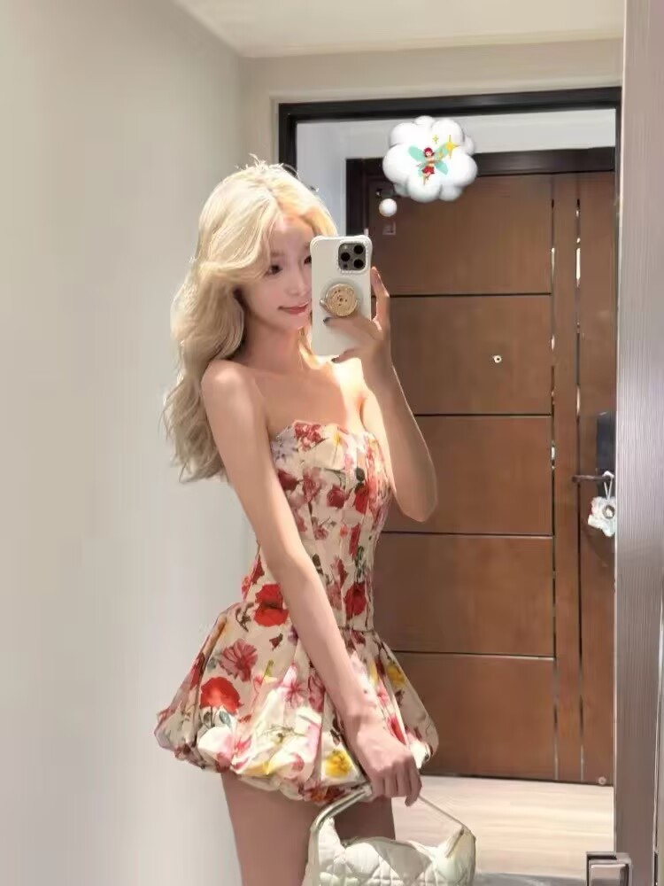 프랑스식 순수한 욕망 바람 품격 꽃무늬 세트 드레스 섹시함 몸매 가꾸기 튜브탑 맨위 슬림해 보이는 퍼프 반신 스커트 투피스 세트