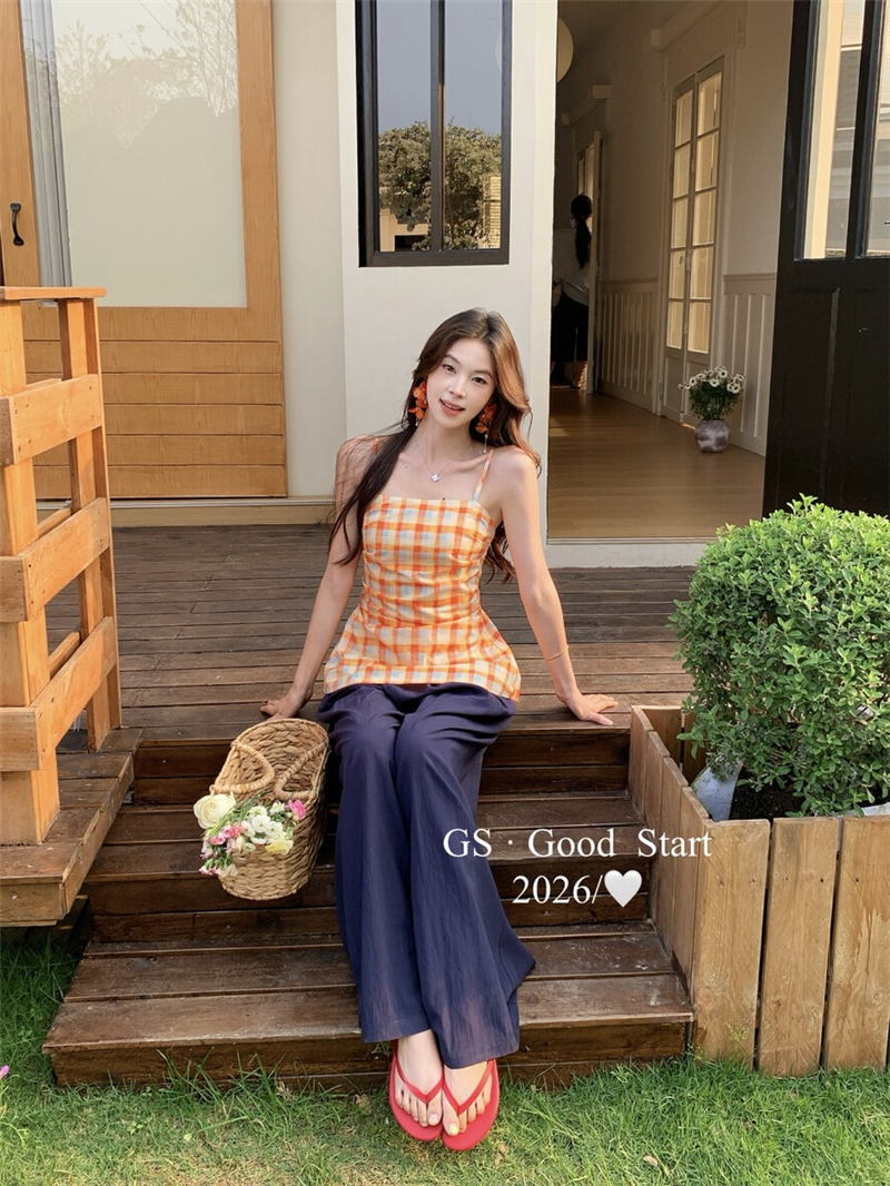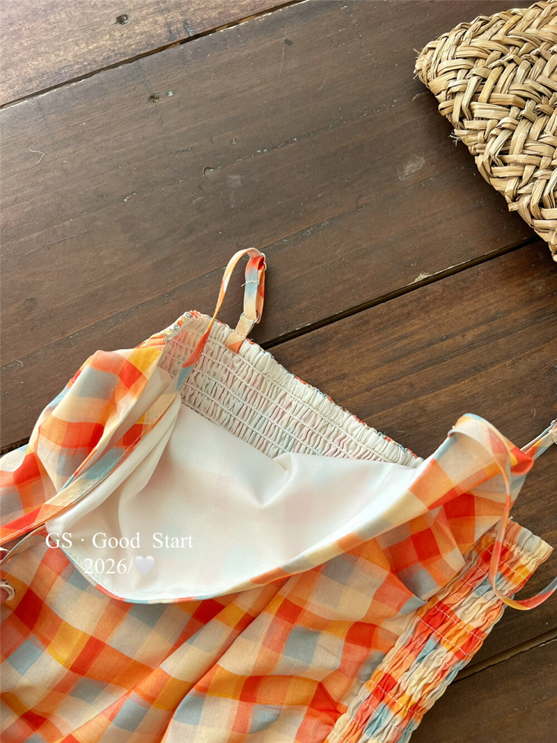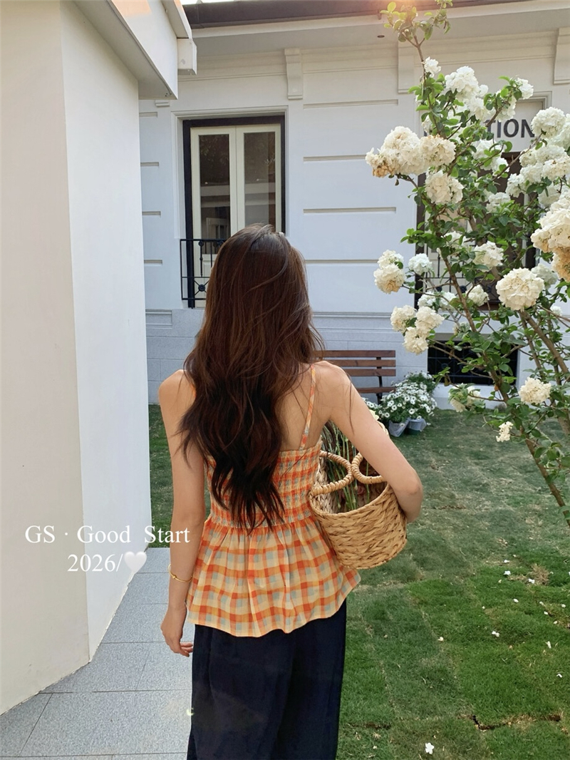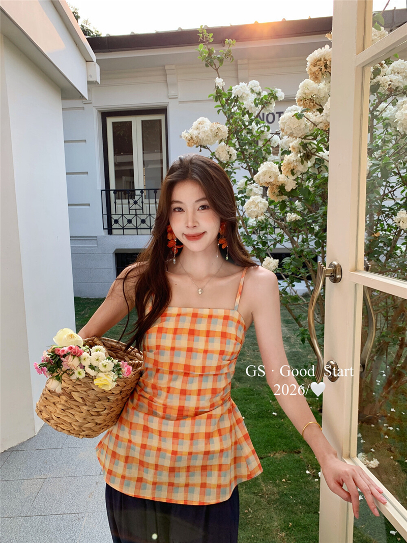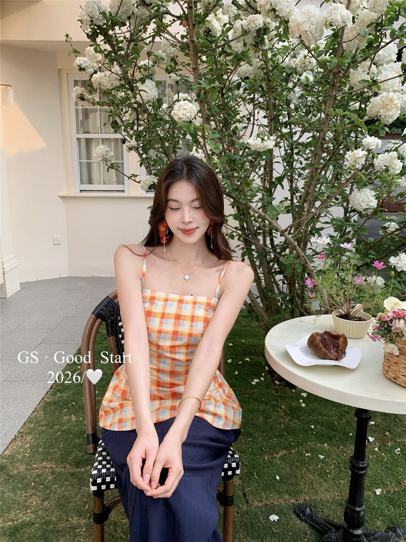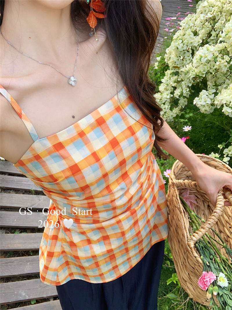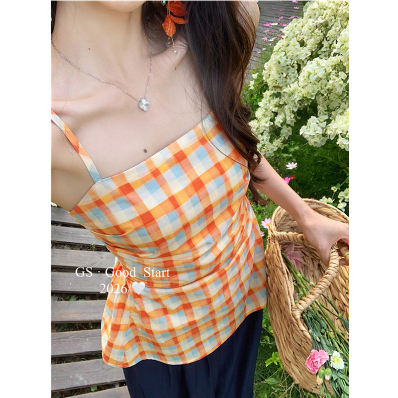 밝은 소녀 군중 속에서 독점적 인 c 조금 디스플레이 화이트 햇빛 주황색 여름 달콤함 배색 체크무늬 허리 수축 슬립 작은 셔츠