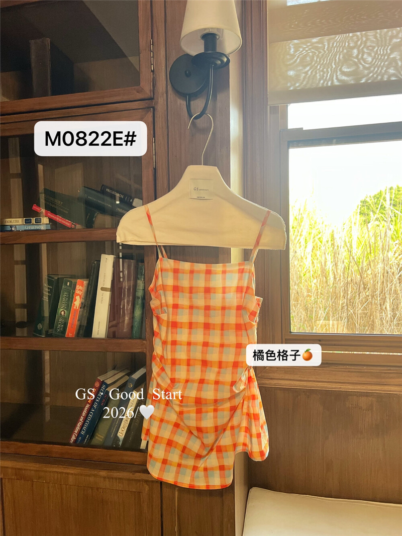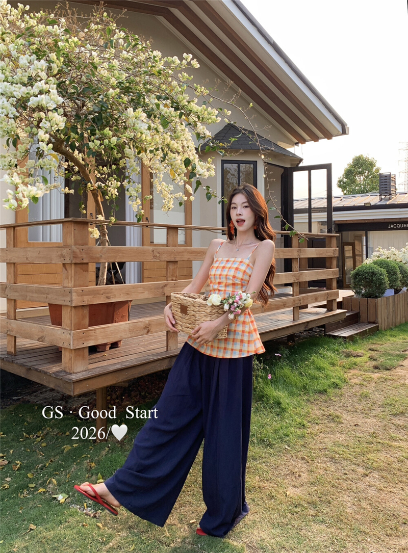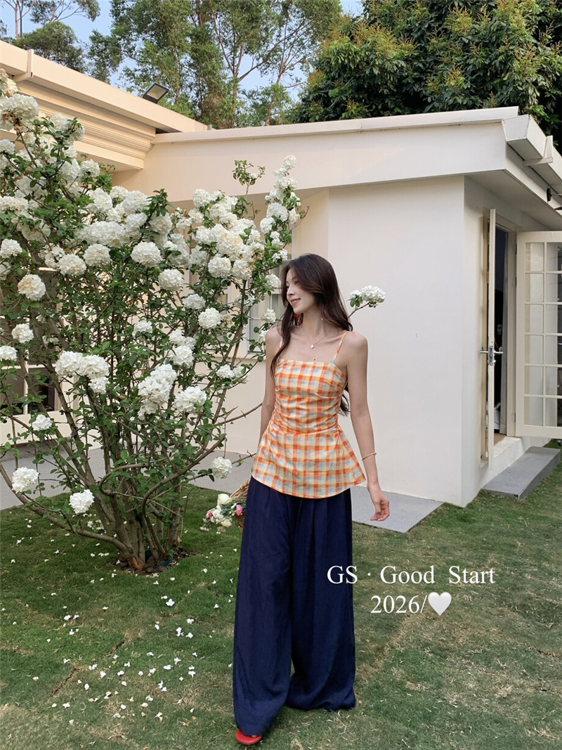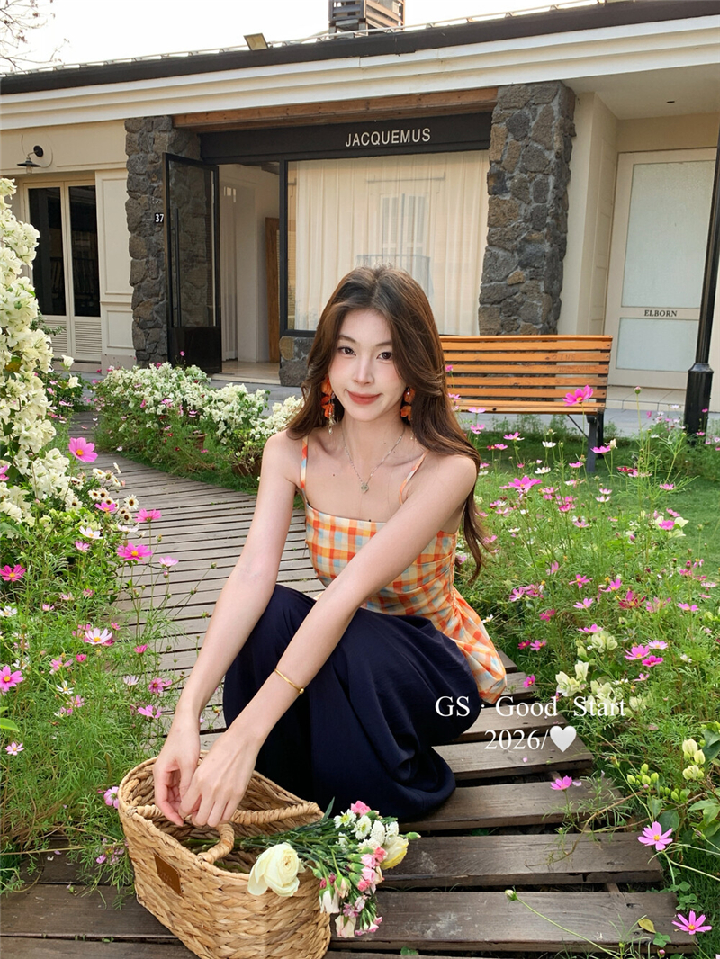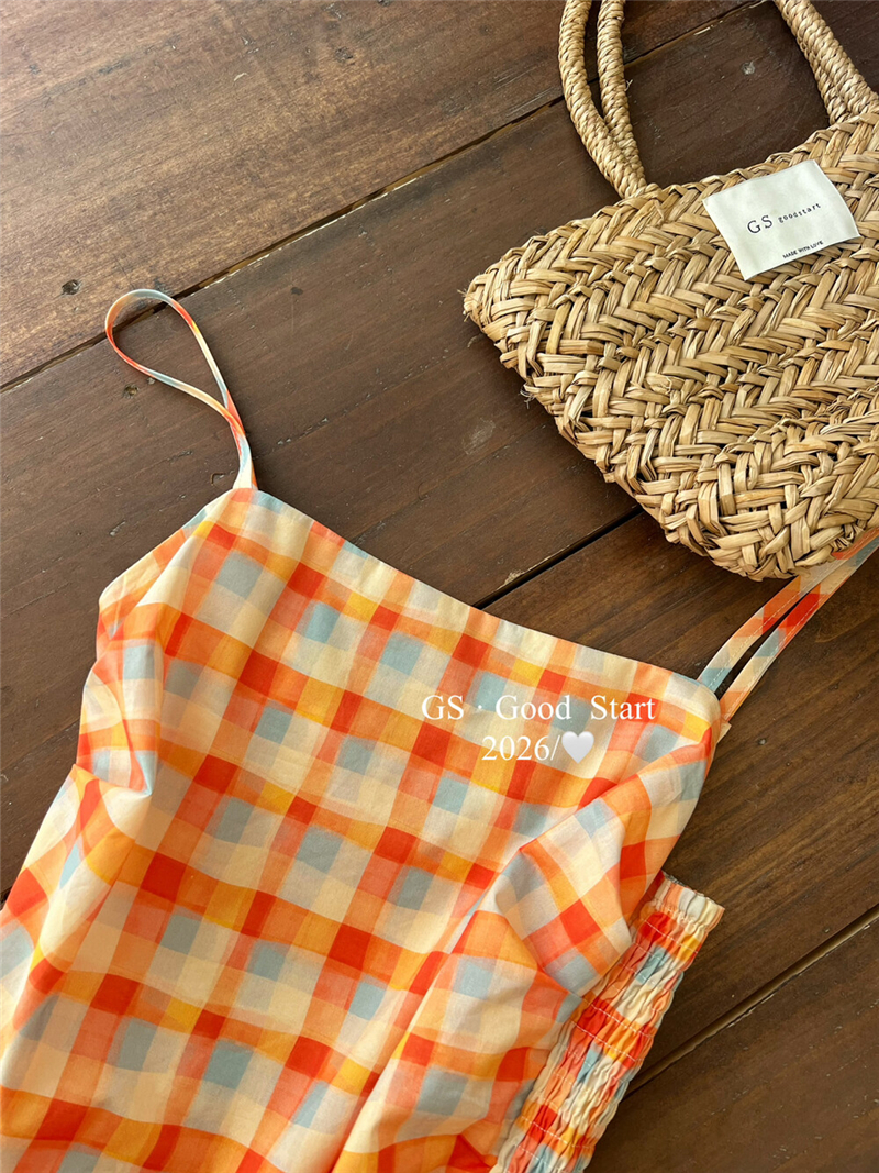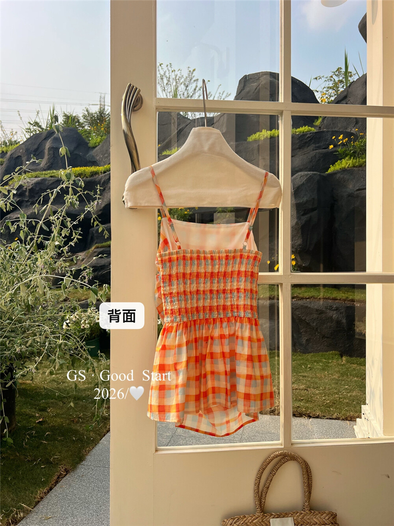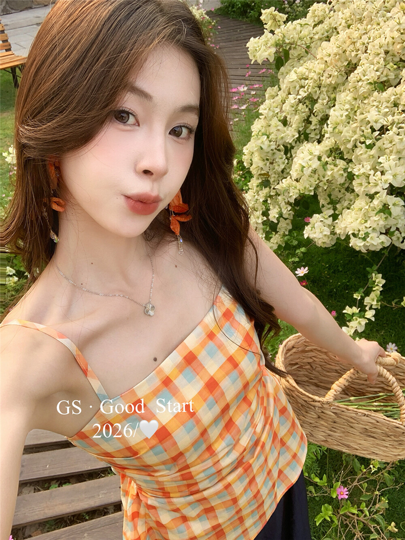 밝은 소녀 군중 속에서 독점적 인 c 조금 디스플레이 화이트 햇빛 주황색 여름 달콤함 배색 체크무늬 허리 수축 슬립 작은 셔츠