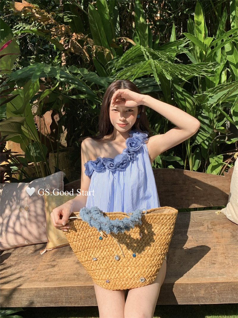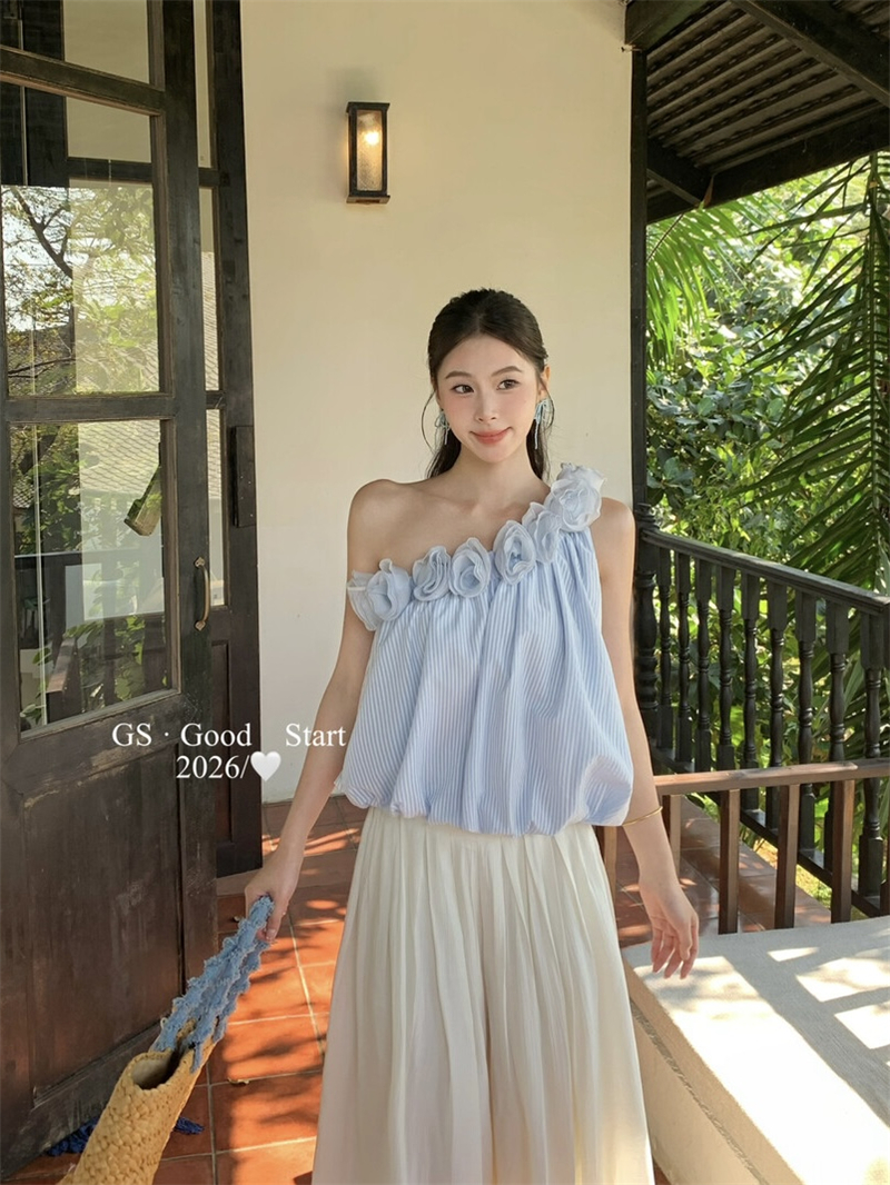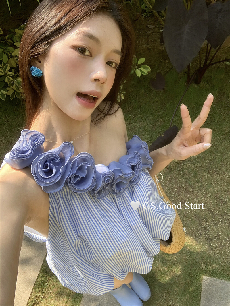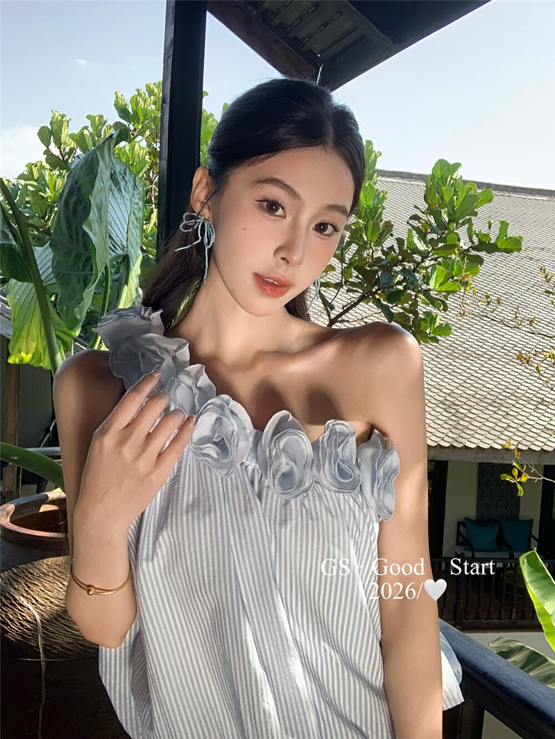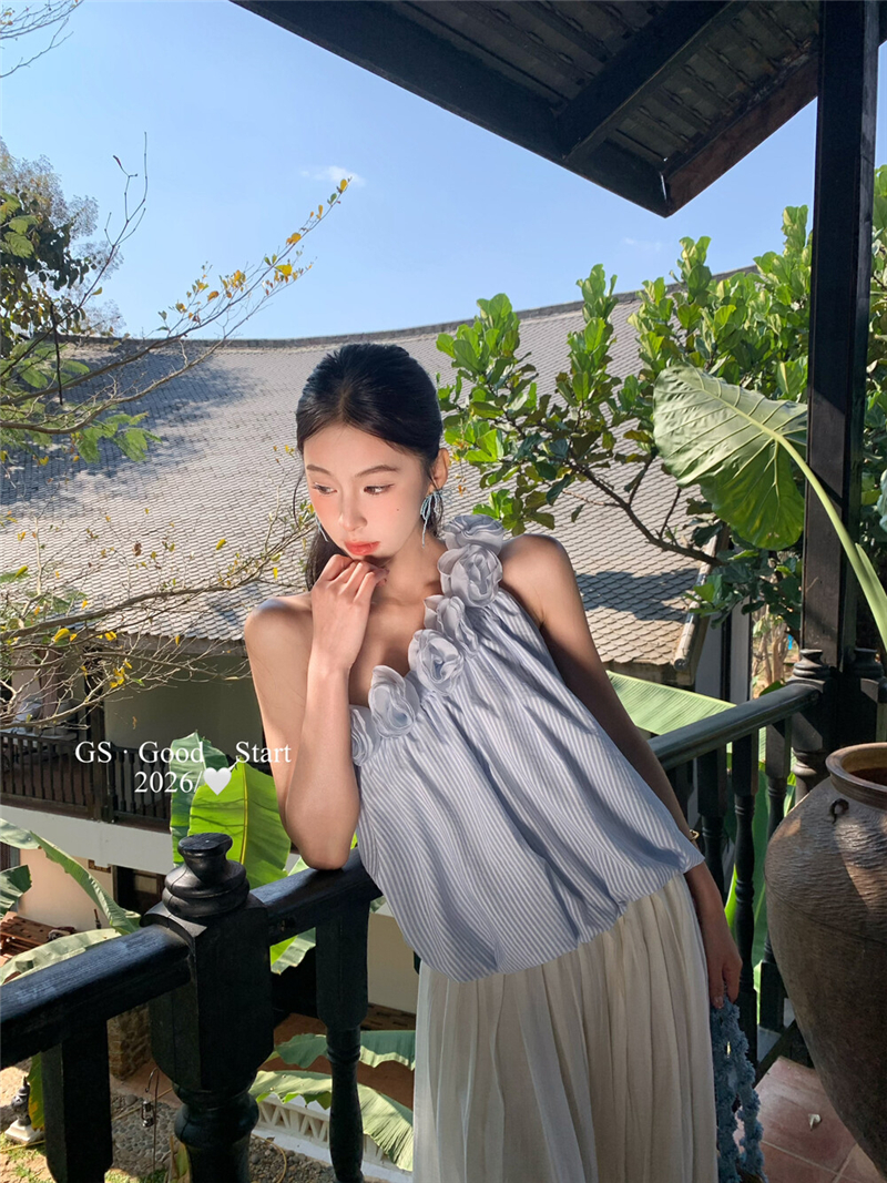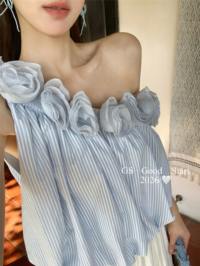 중국 전나무 숲 장미 있으라. 추적 묻기 봄 여름 프랑스식 낭만주의 3 차원 꽃 비스듬한 어깨 휴가 바람 스트라이프 작은 셔츠