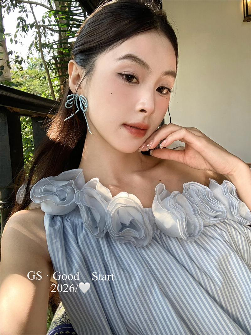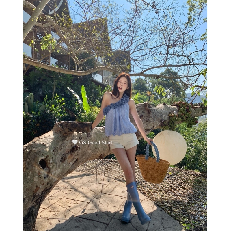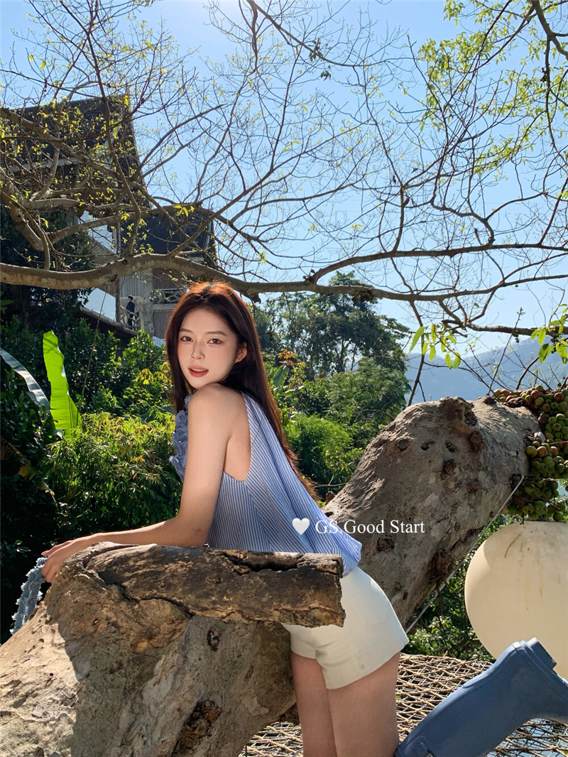 실사 정가 스트라이프 행침 목 백리스 조끼 품격 핫걸 흔들다 칼라 디자인 센스 쇼트 스타일 맨위 여성