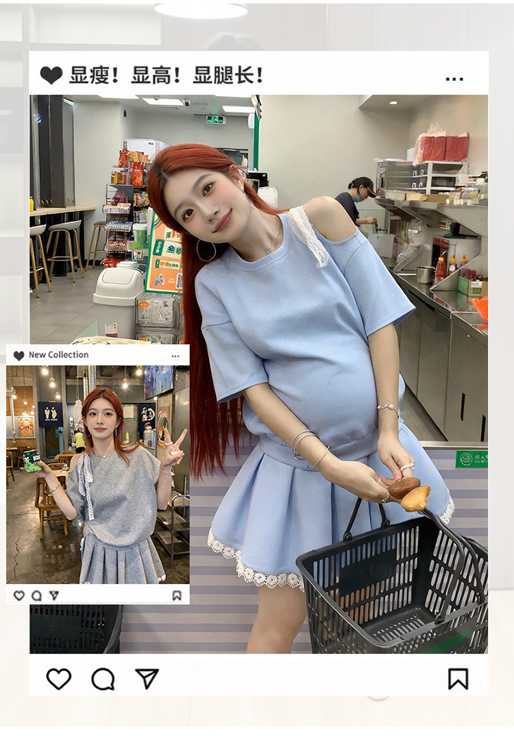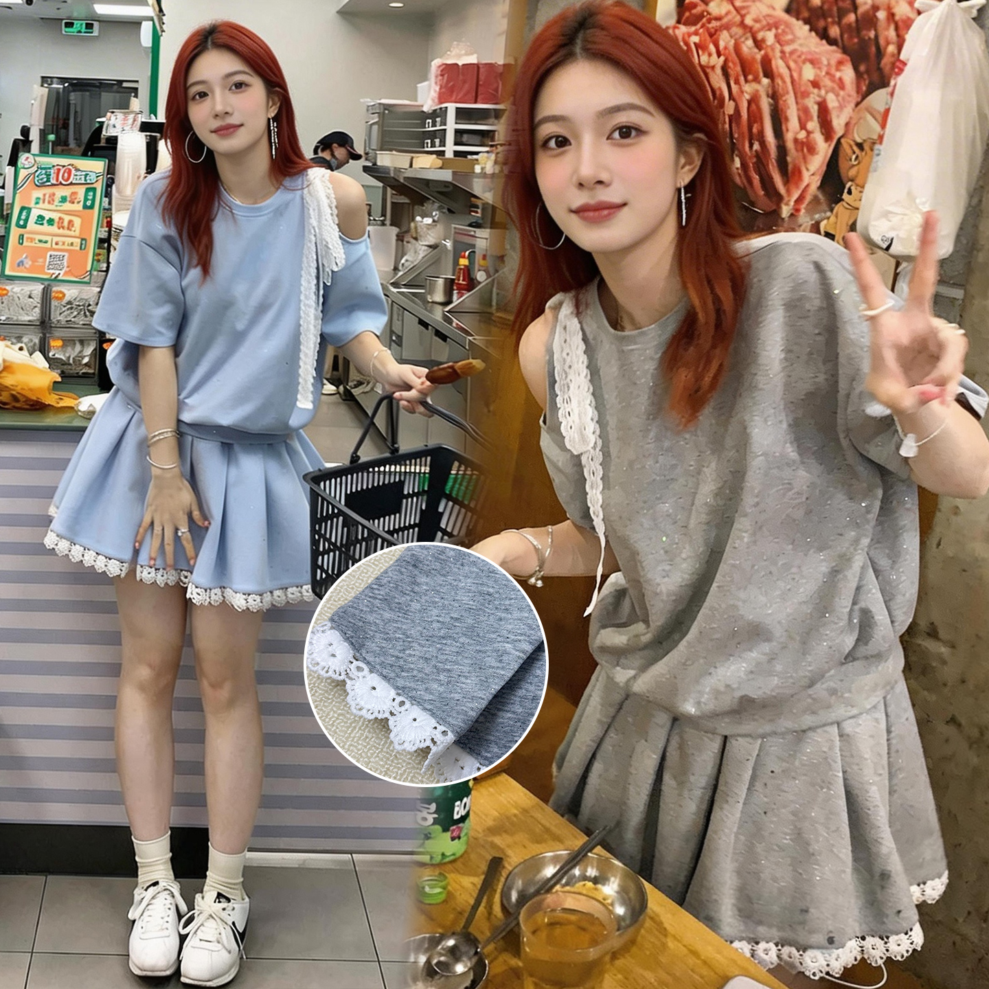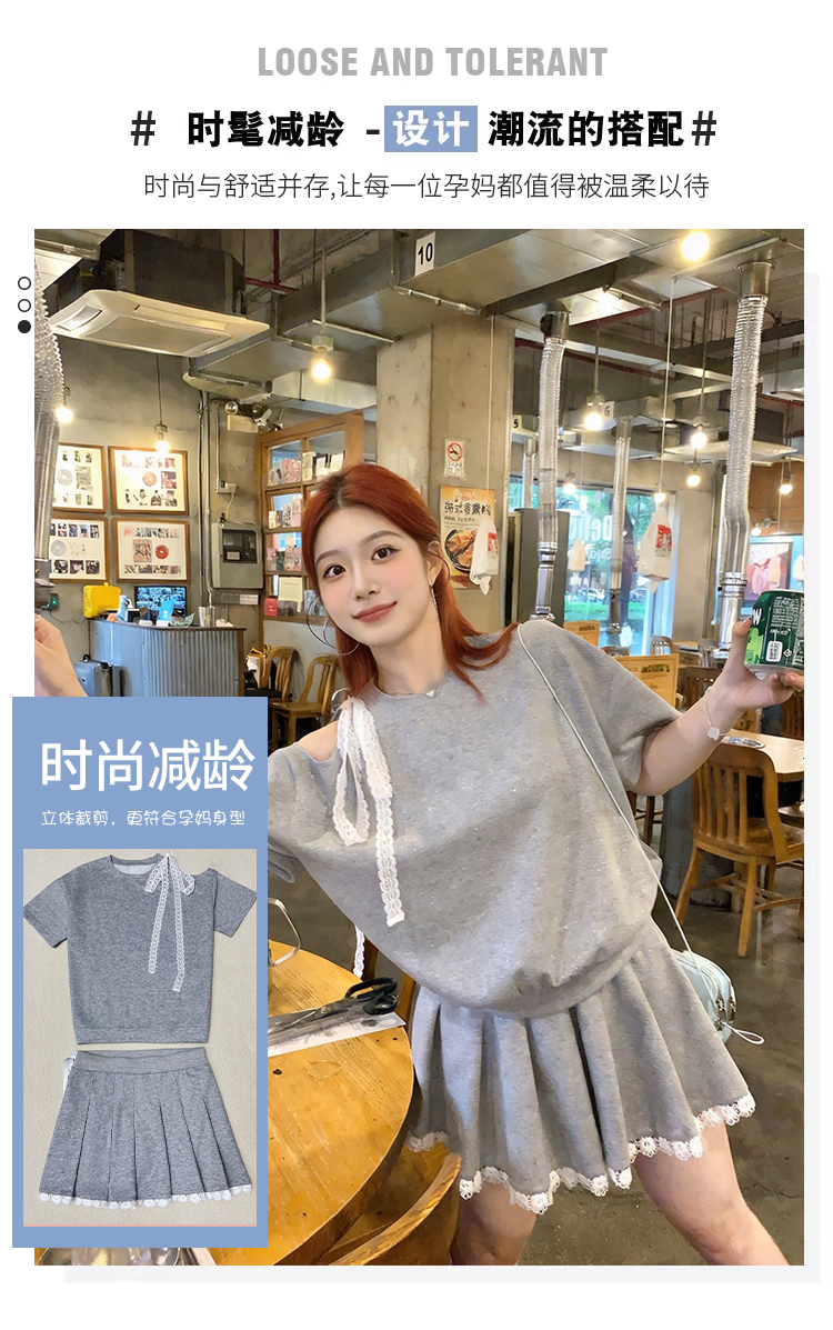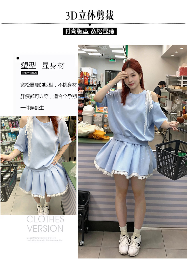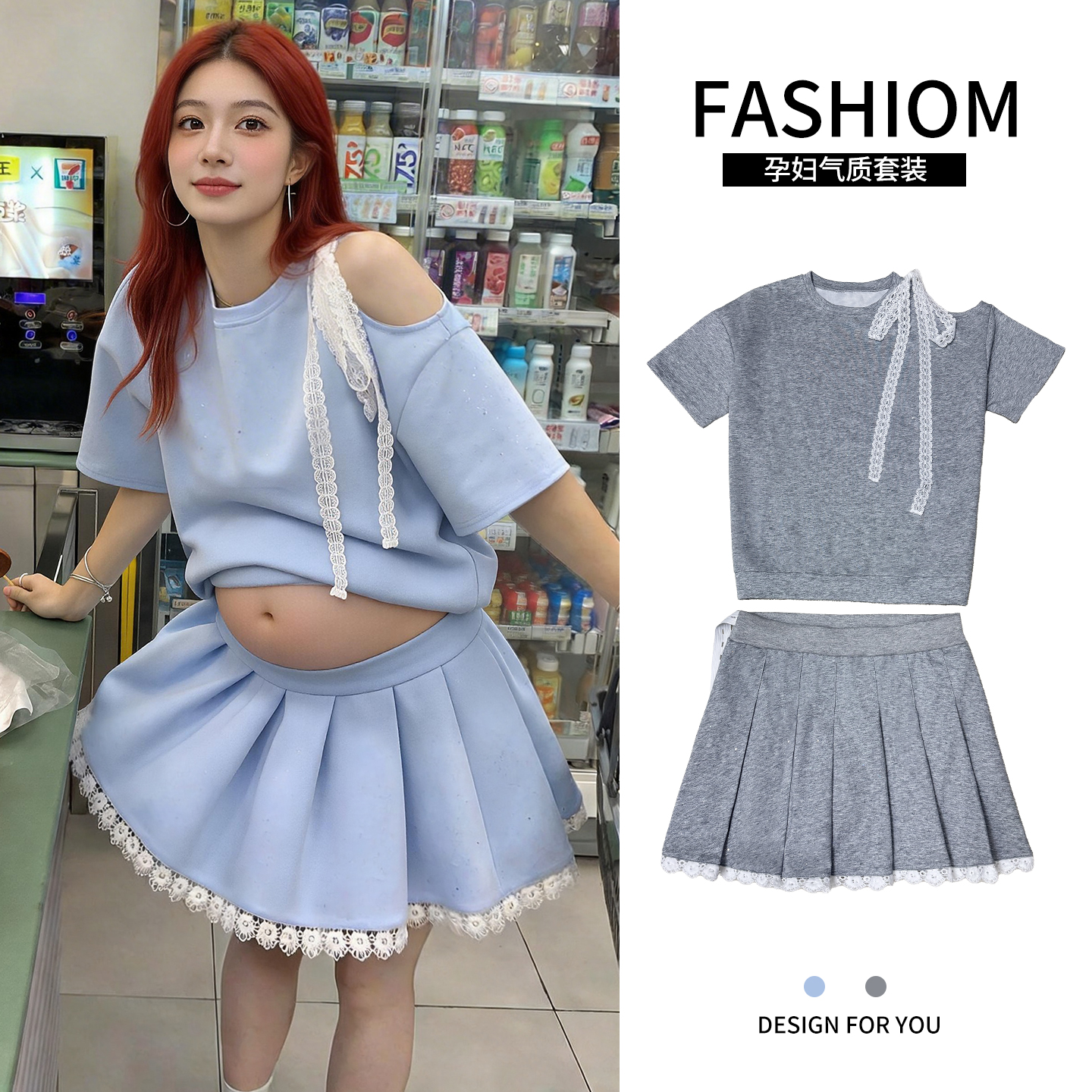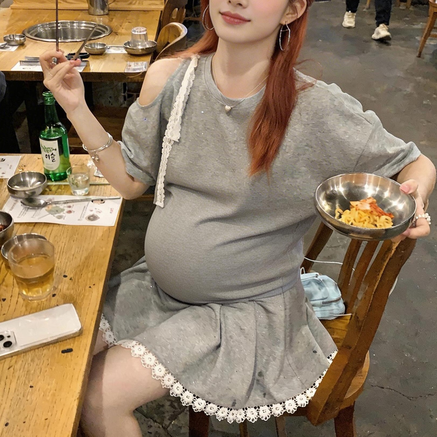 지금 임산부 여름 스팽글 레이스 레이스 한국 스타일 오프숄더 맨위 플리츠 반신 스커트 자이언트 잘 생긴 투피스 세트 세트