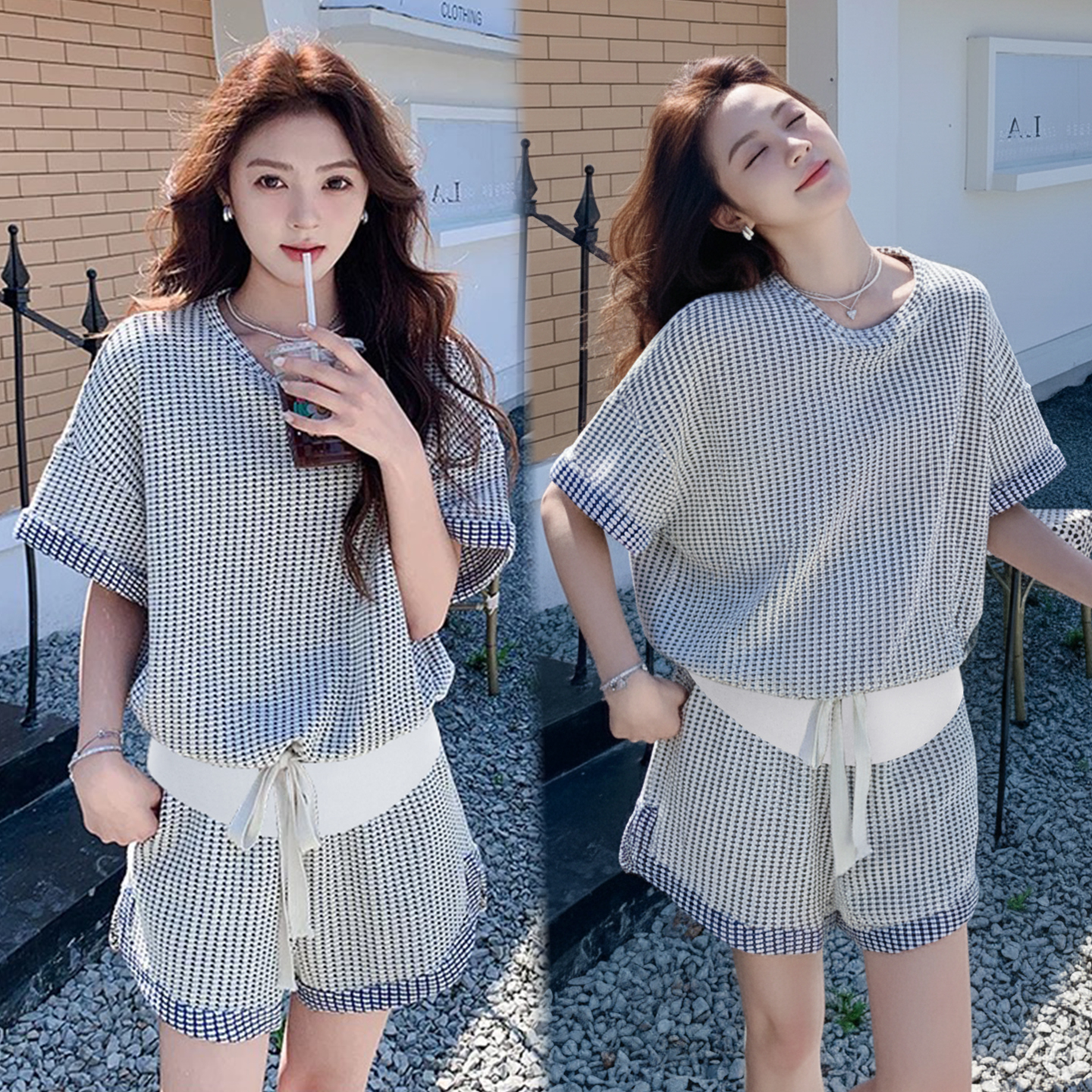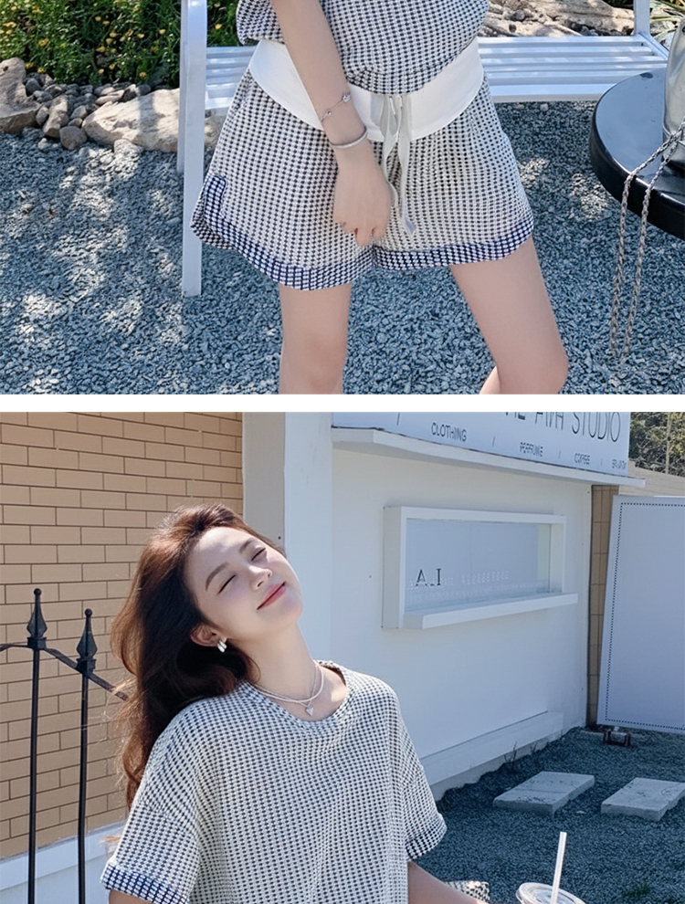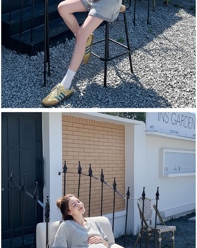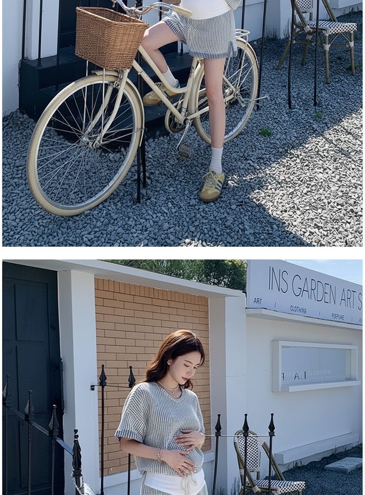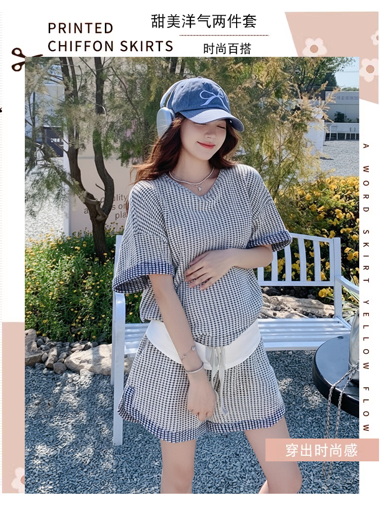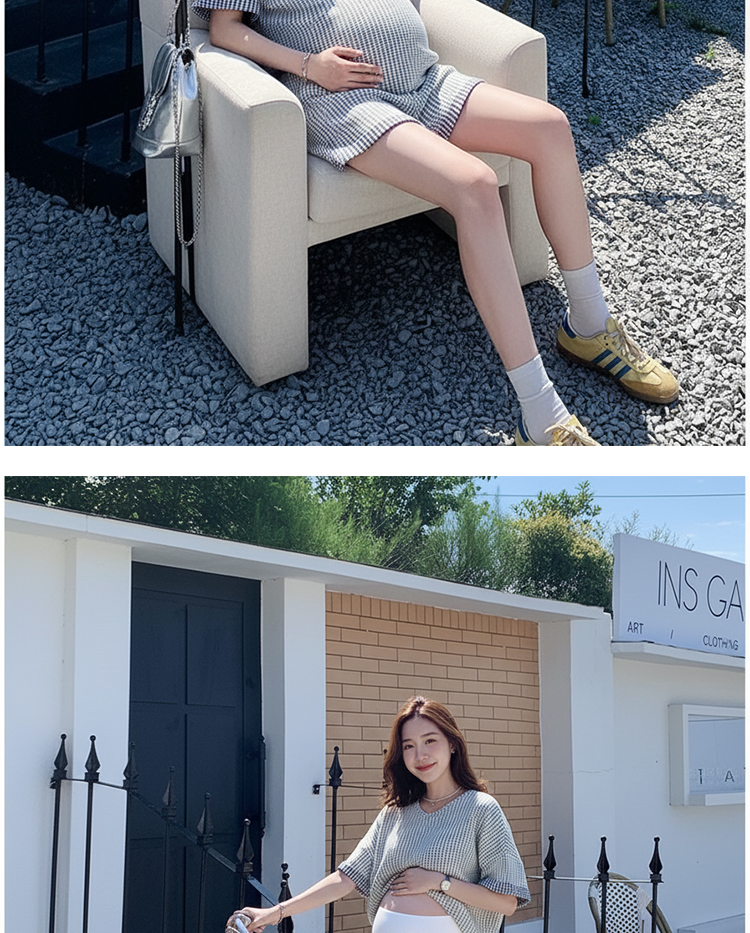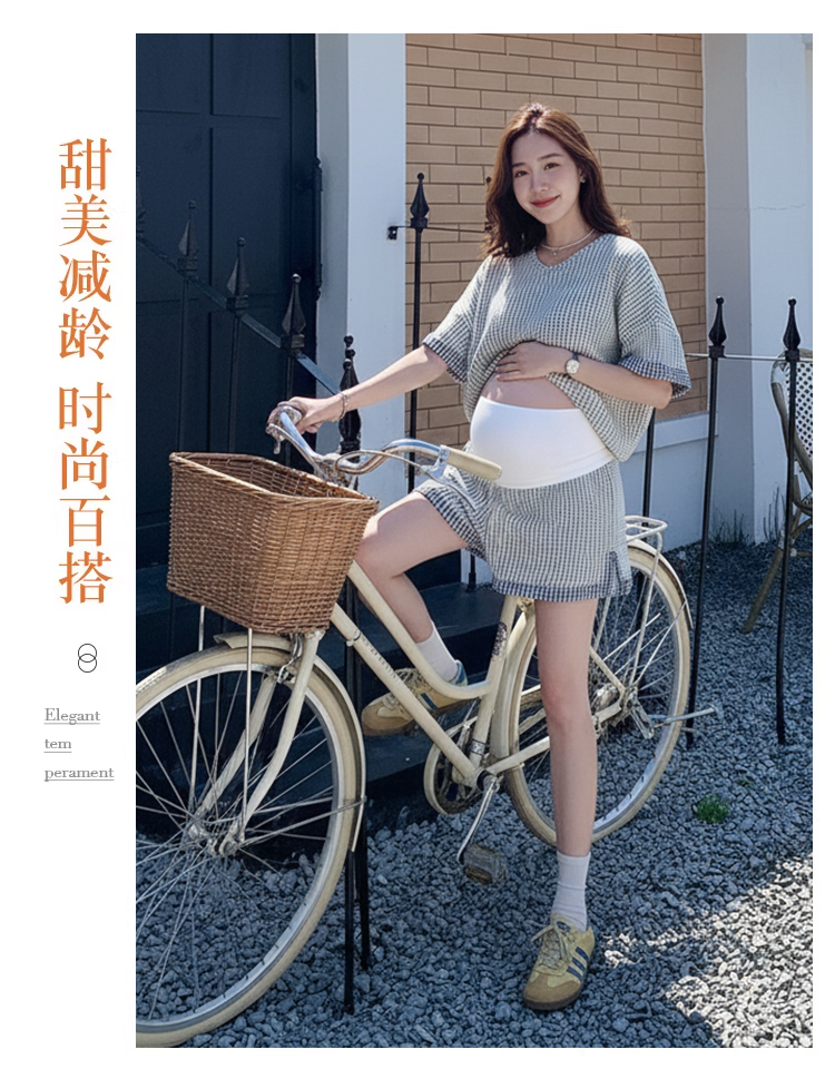 지금 임산부 세트 새로운 패치워크 디자인 루즈핏 맨위 프랑스식 달콤한 다용도 쇼트 스타일 주름 반팔 미니 스커트 세트