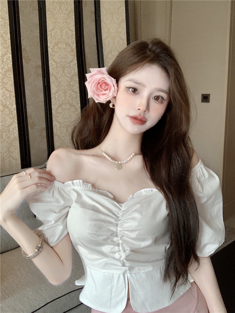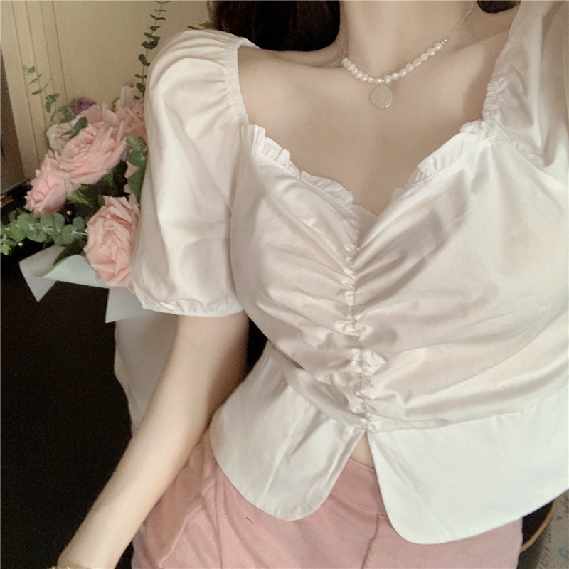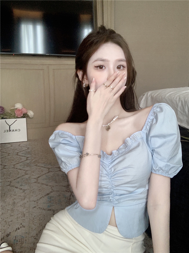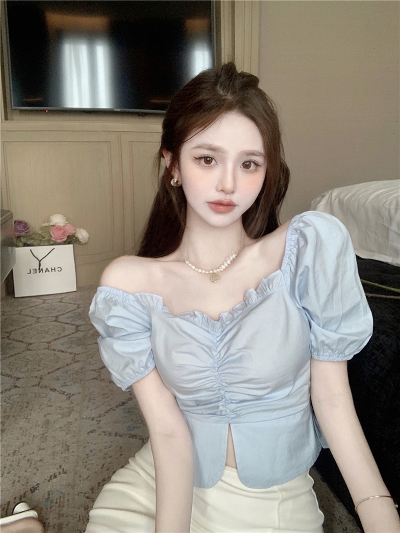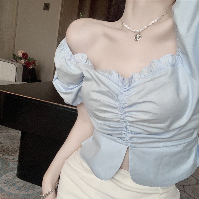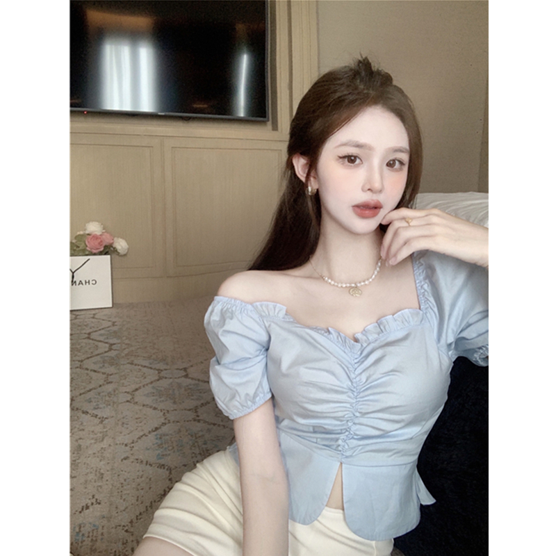 실사 정가 레트로 품격 광장 칼라 거품 소매 레이스 주름 오프숄더 디자인 센스 쇼트 스타일 셔츠