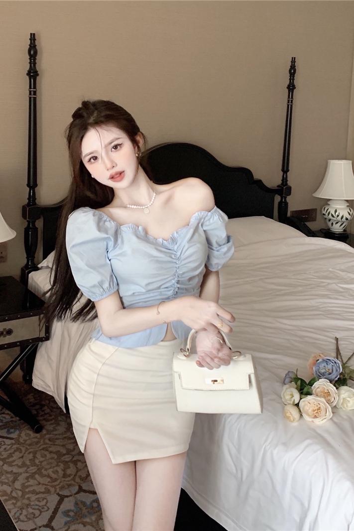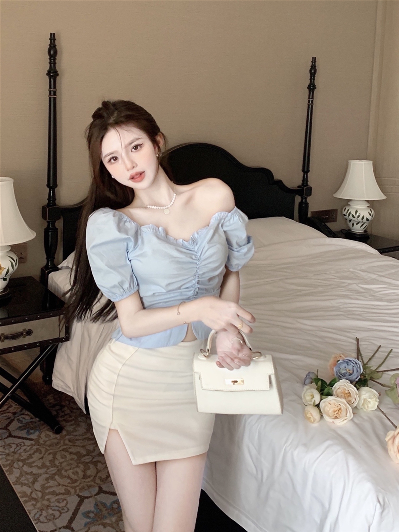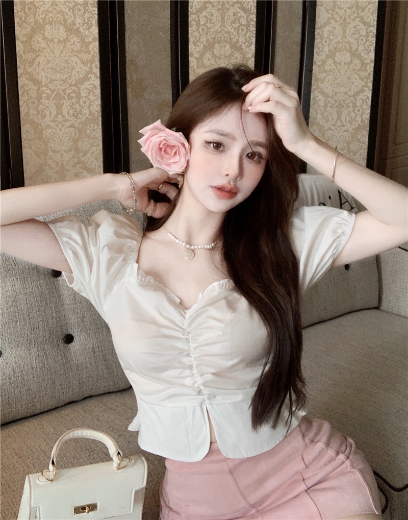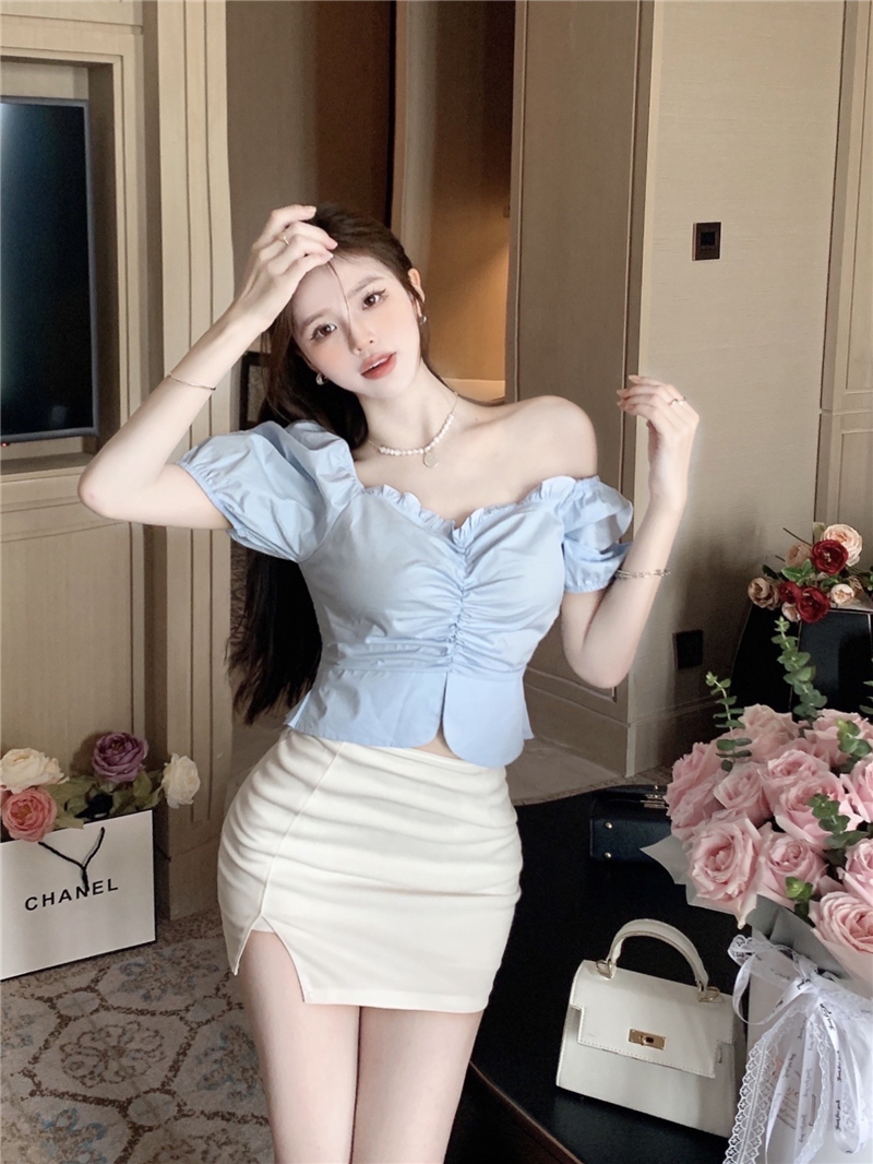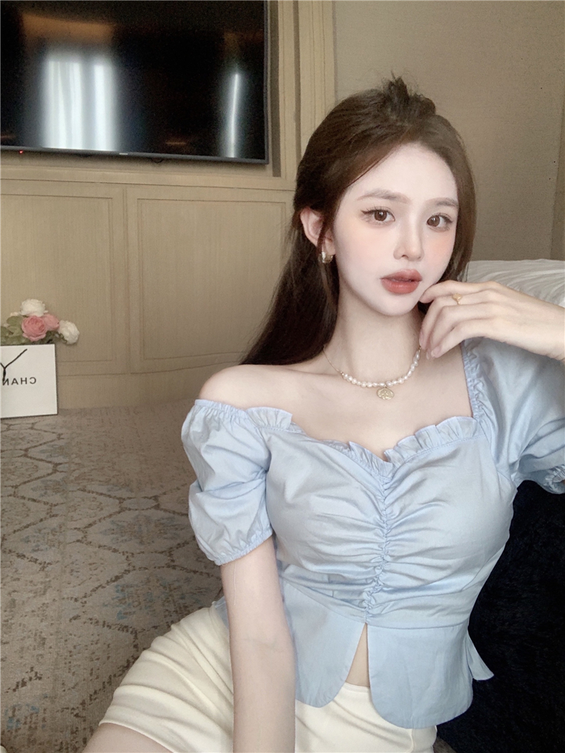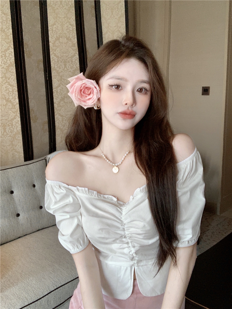 실사 정가 레트로 품격 광장 칼라 거품 소매 레이스 주름 오프숄더 디자인 센스 쇼트 스타일 셔츠
