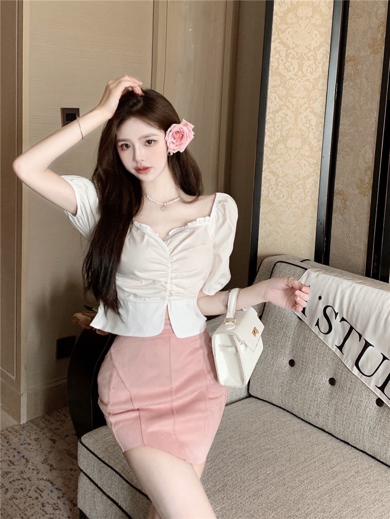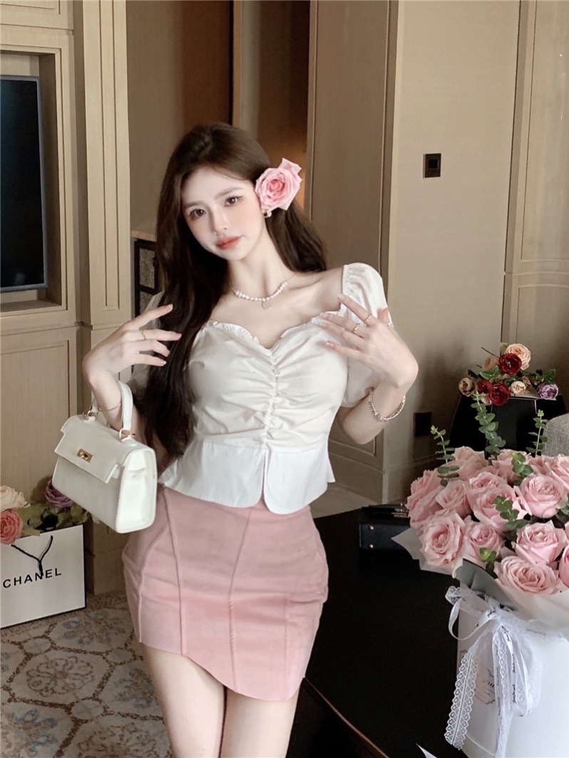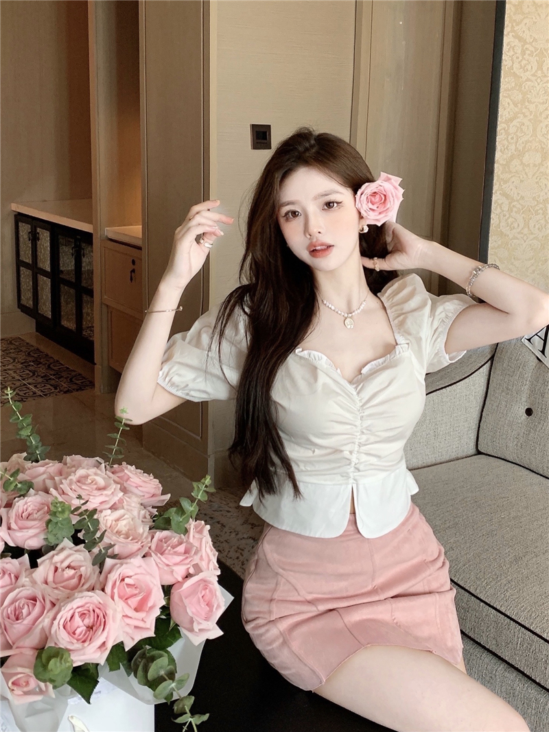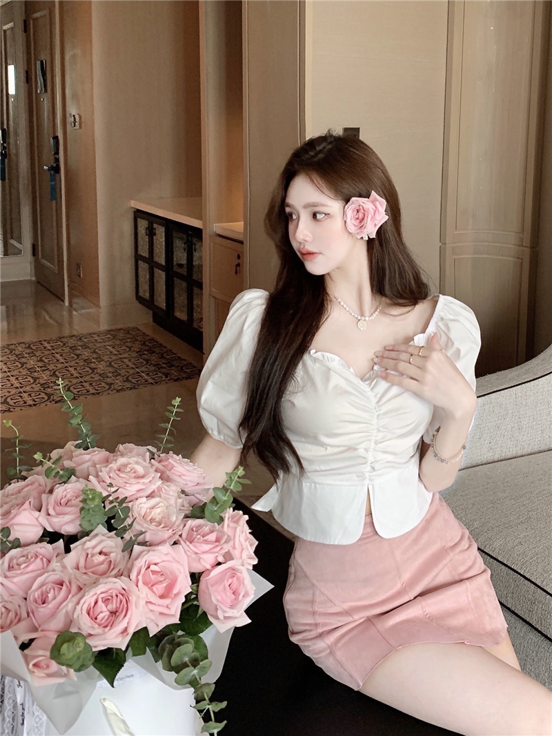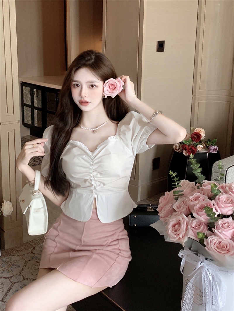 실사 정가 레트로 품격 광장 칼라 거품 소매 레이스 주름 오프숄더 디자인 센스 쇼트 스타일 셔츠