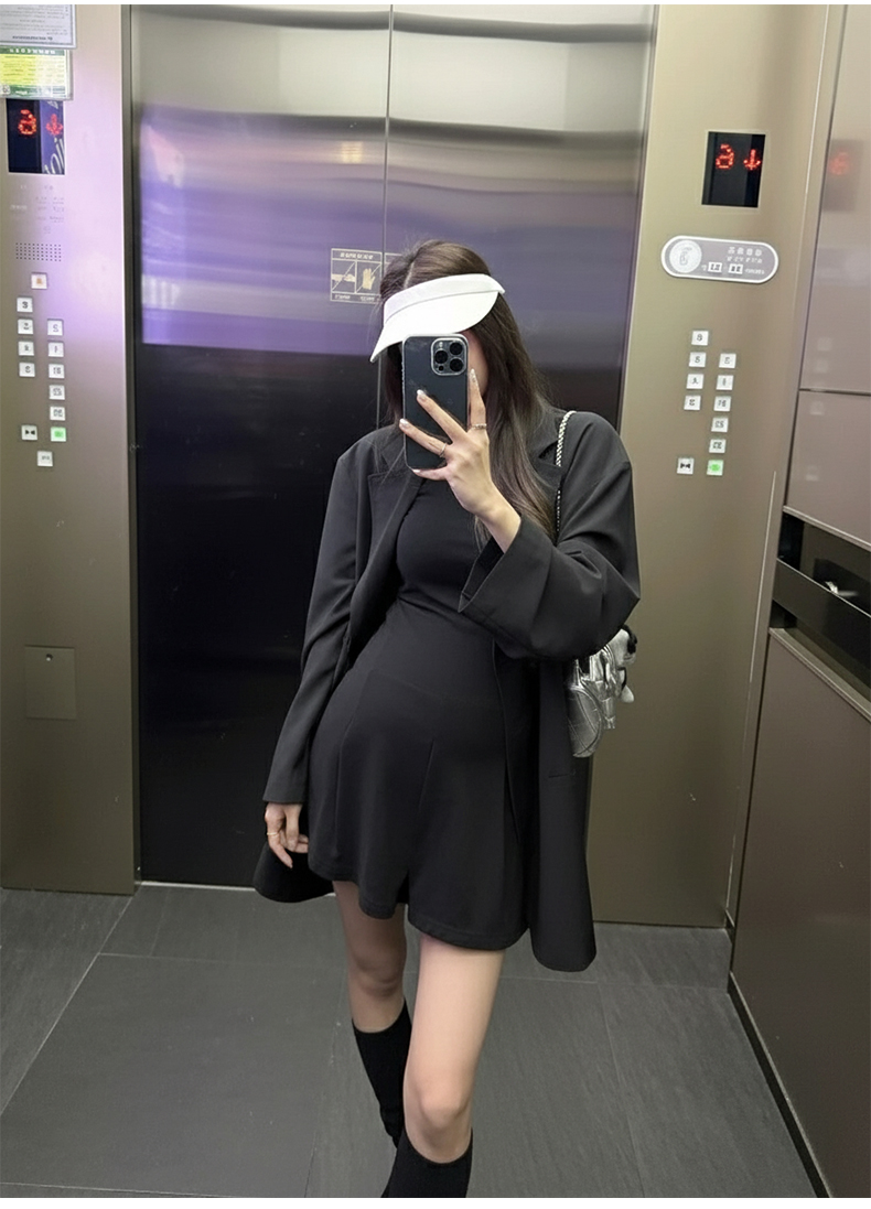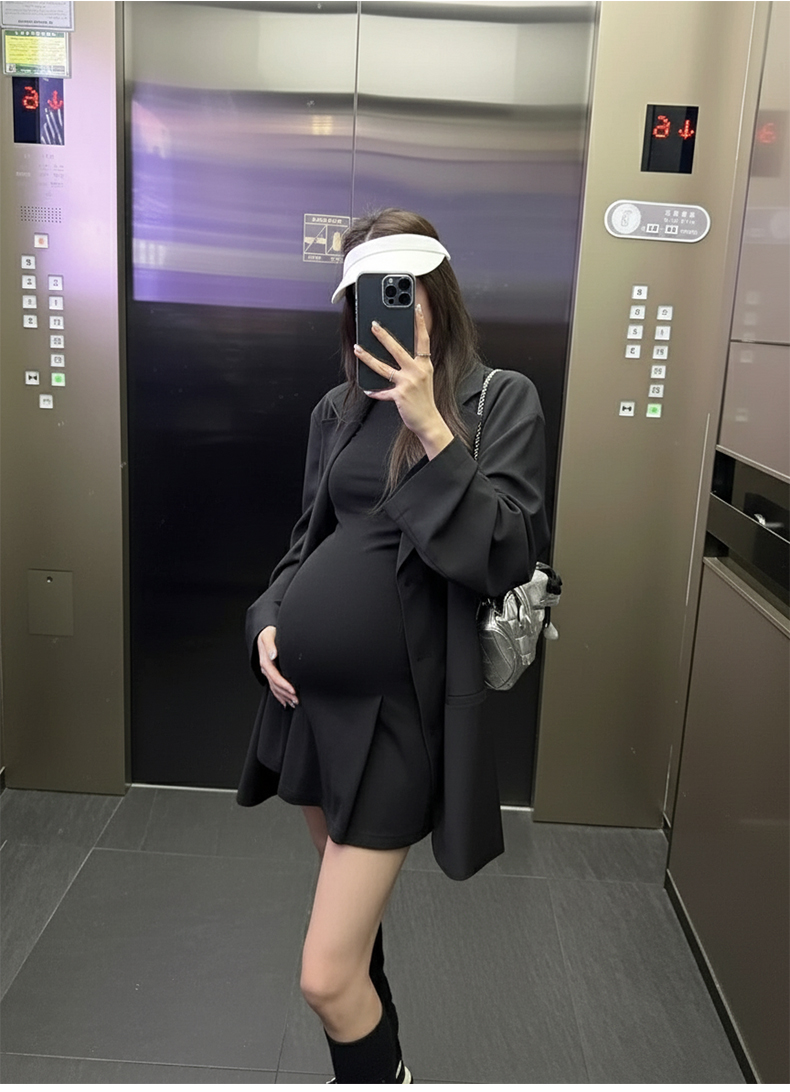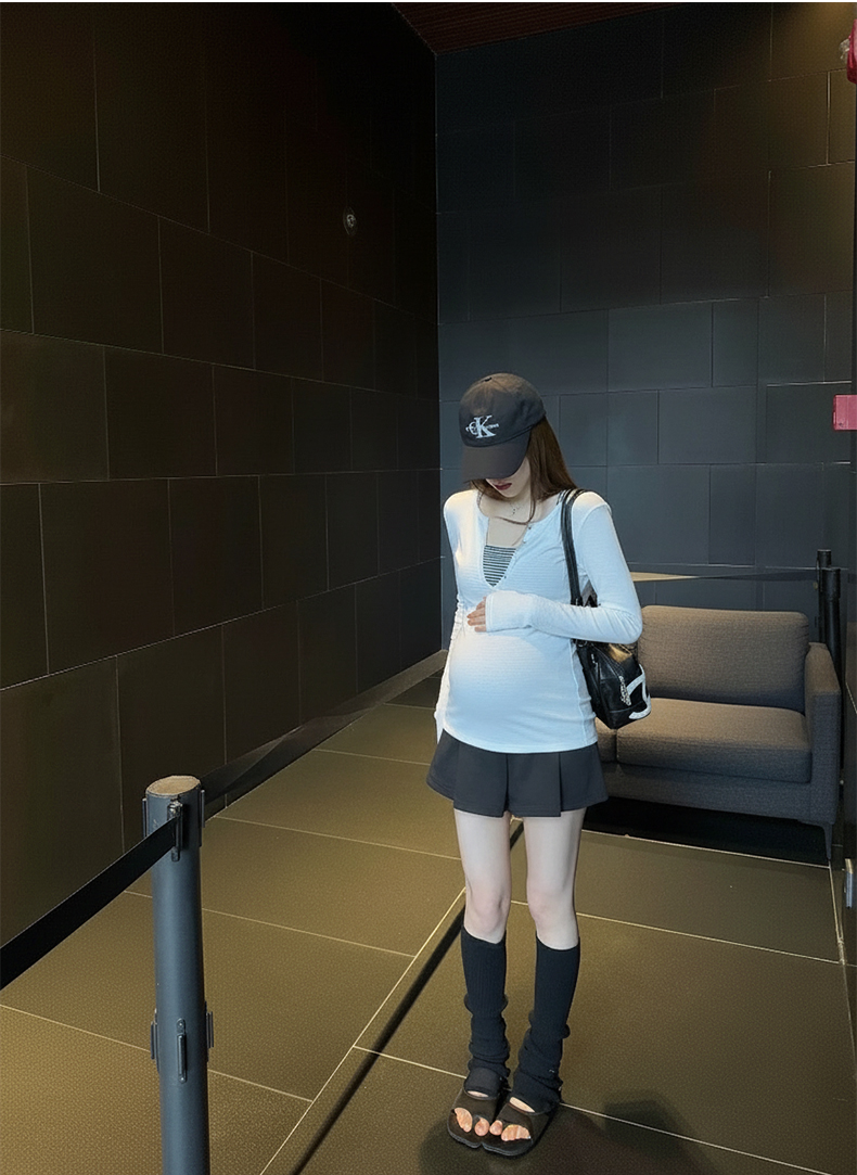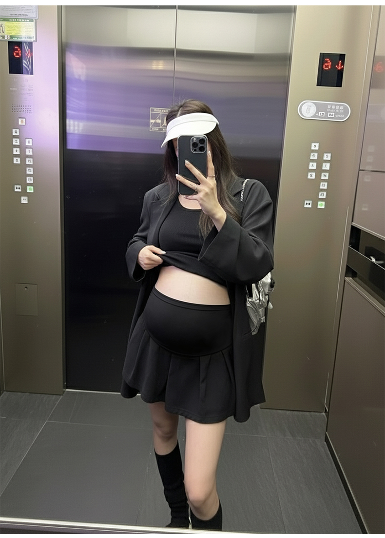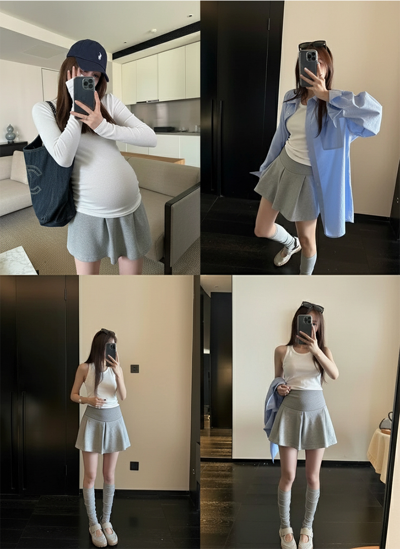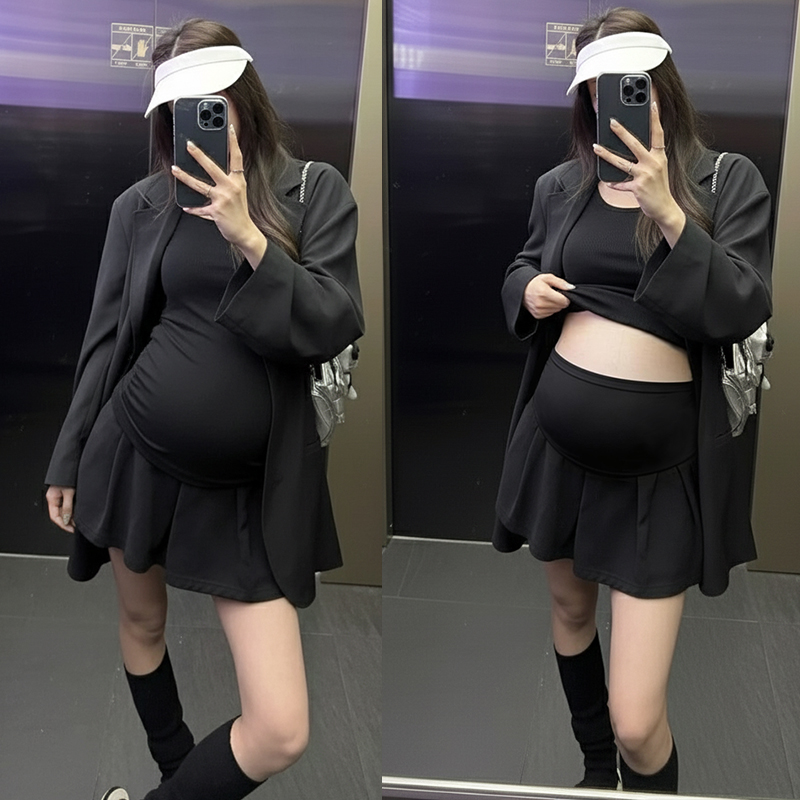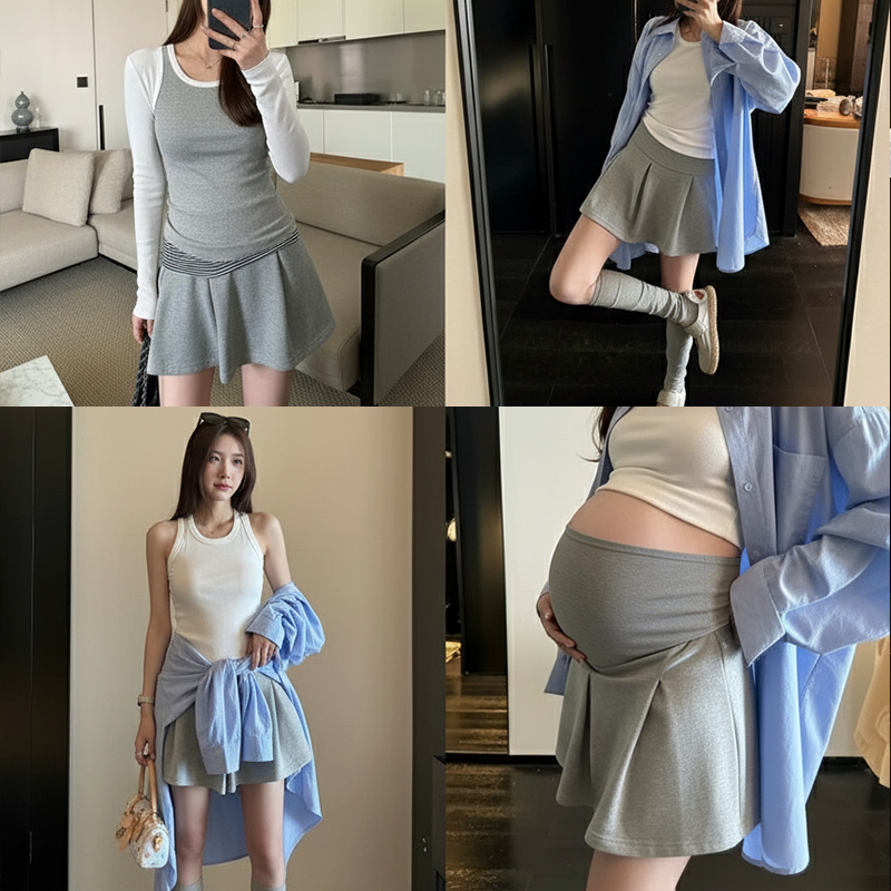 지금 임산부 세트 새로운 패치워크 디자인 루즈핏 맨위 프랑스식 달콤한 다용도 쇼트 스타일 주름 반팔 미니 스커트 세트