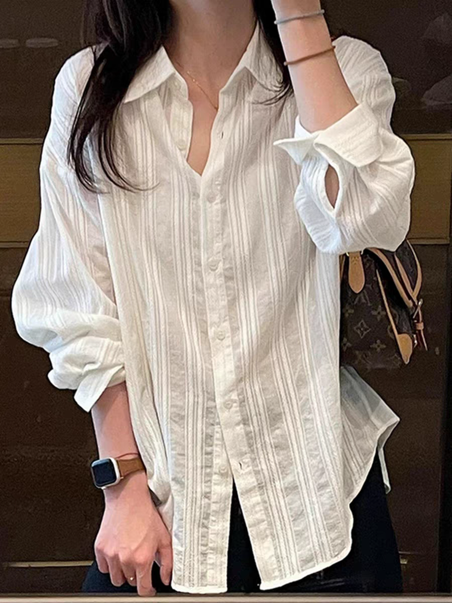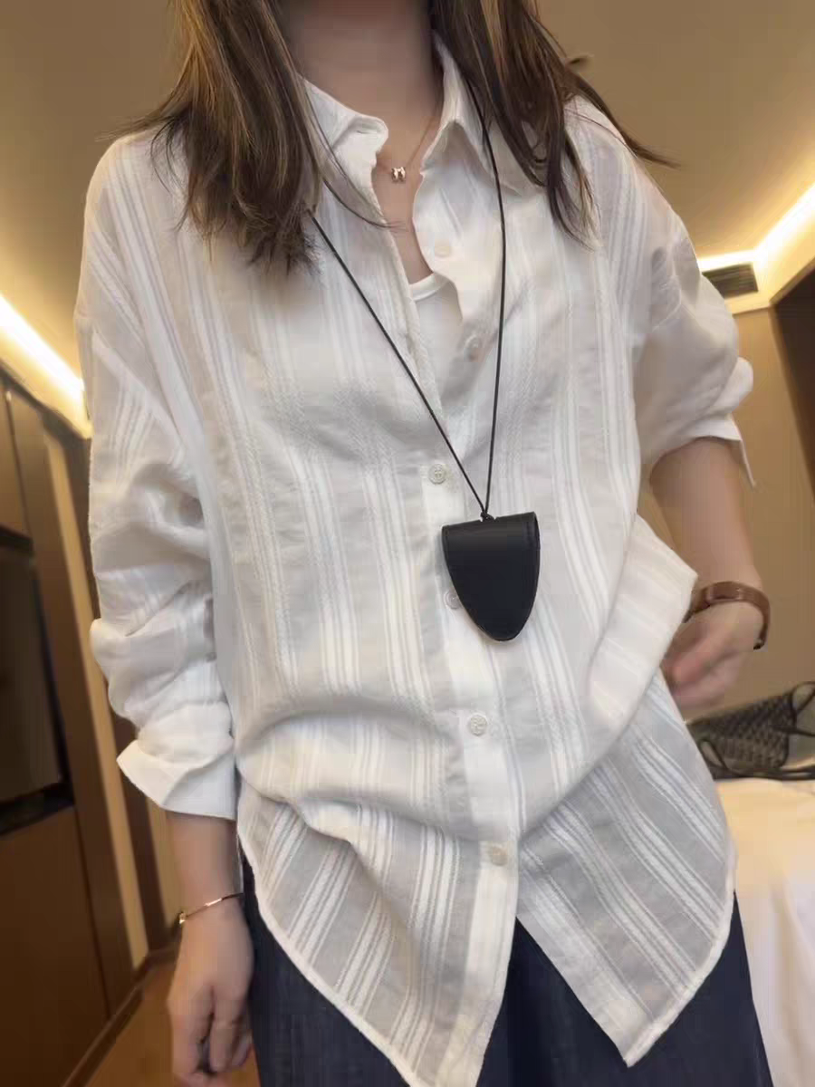 화이트 순면 자카드 질감 얇은 스타일 셔츠 여성 여름 루즈핏 가을 어깨 긴팔 맨위 다용도 캐주얼 셔츠