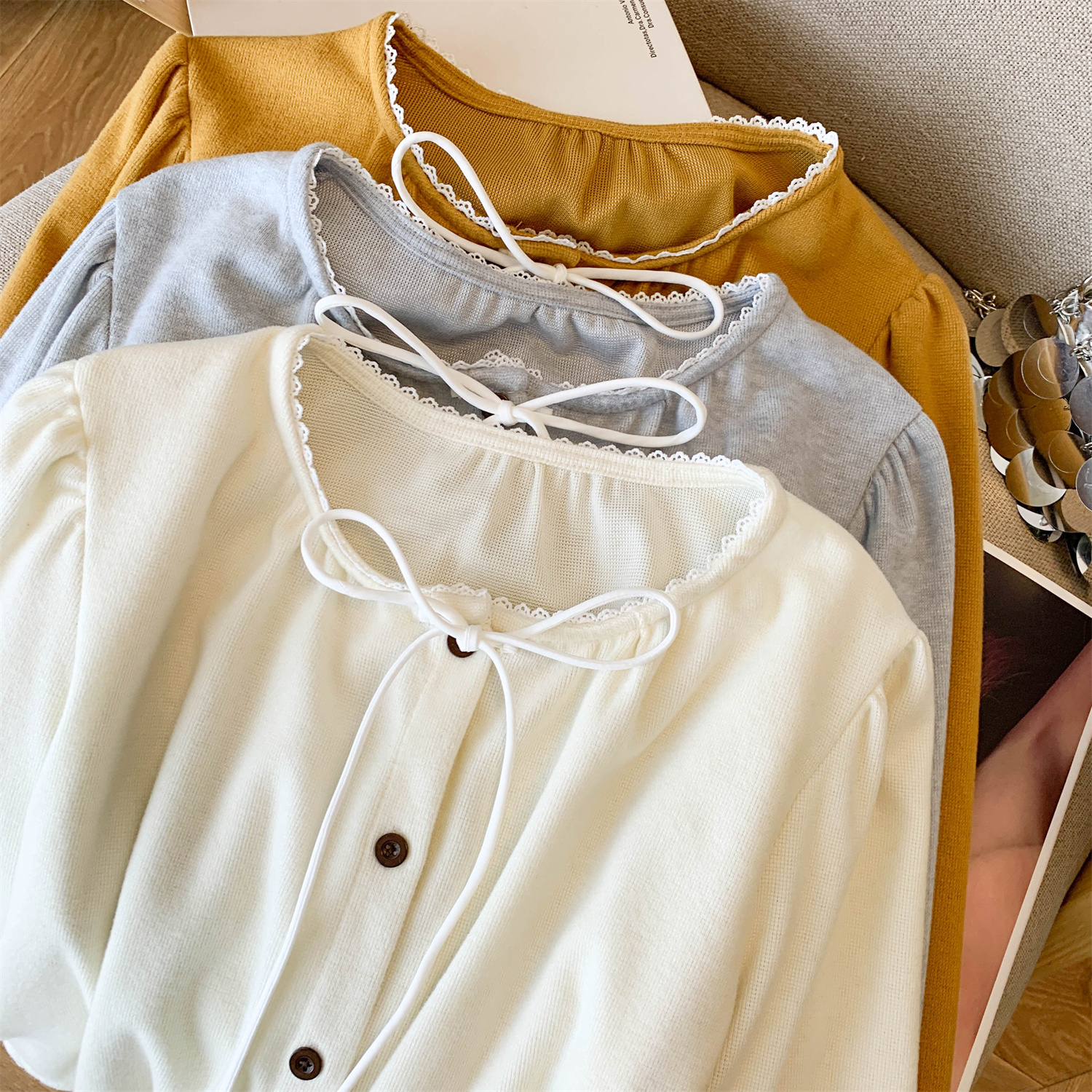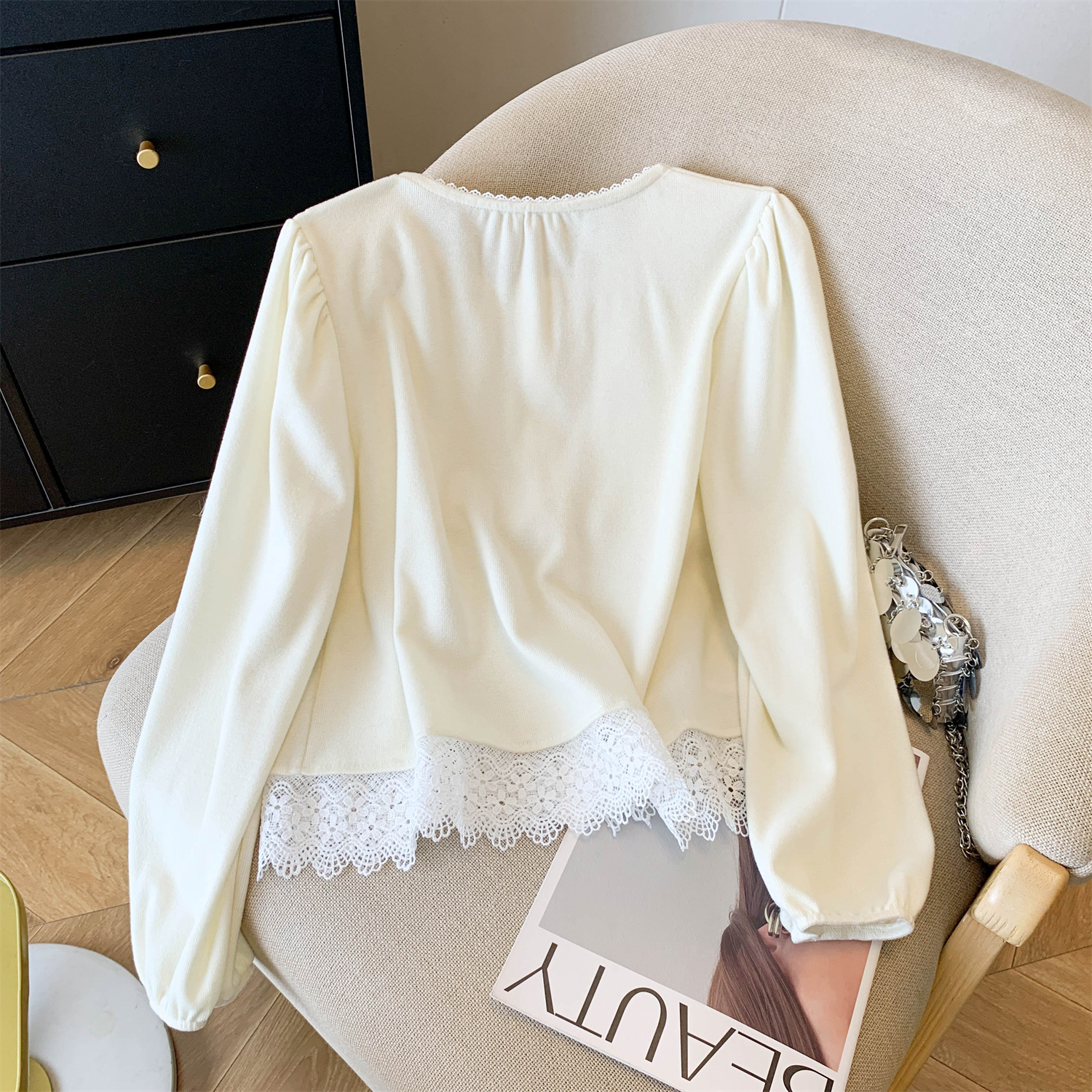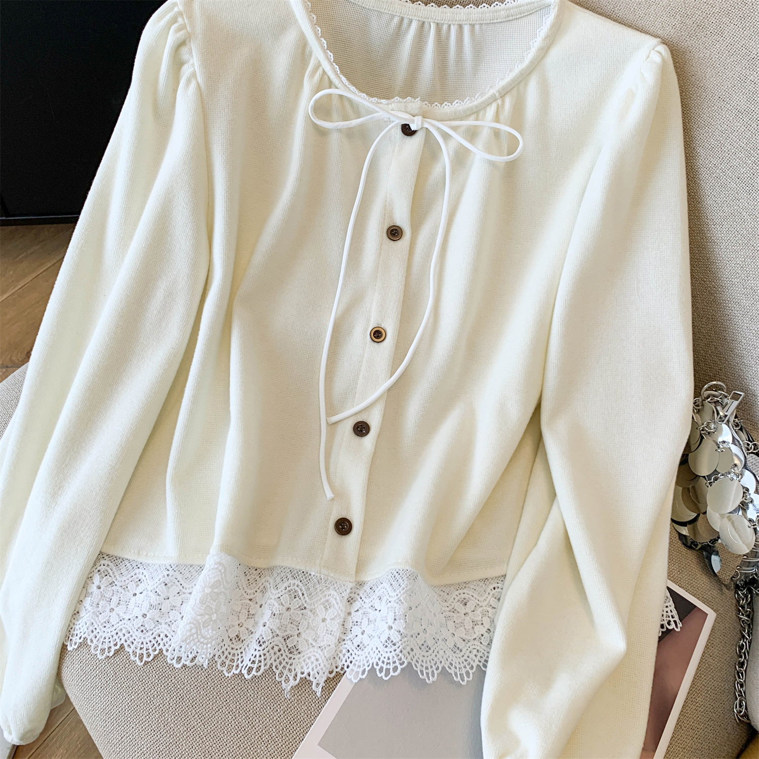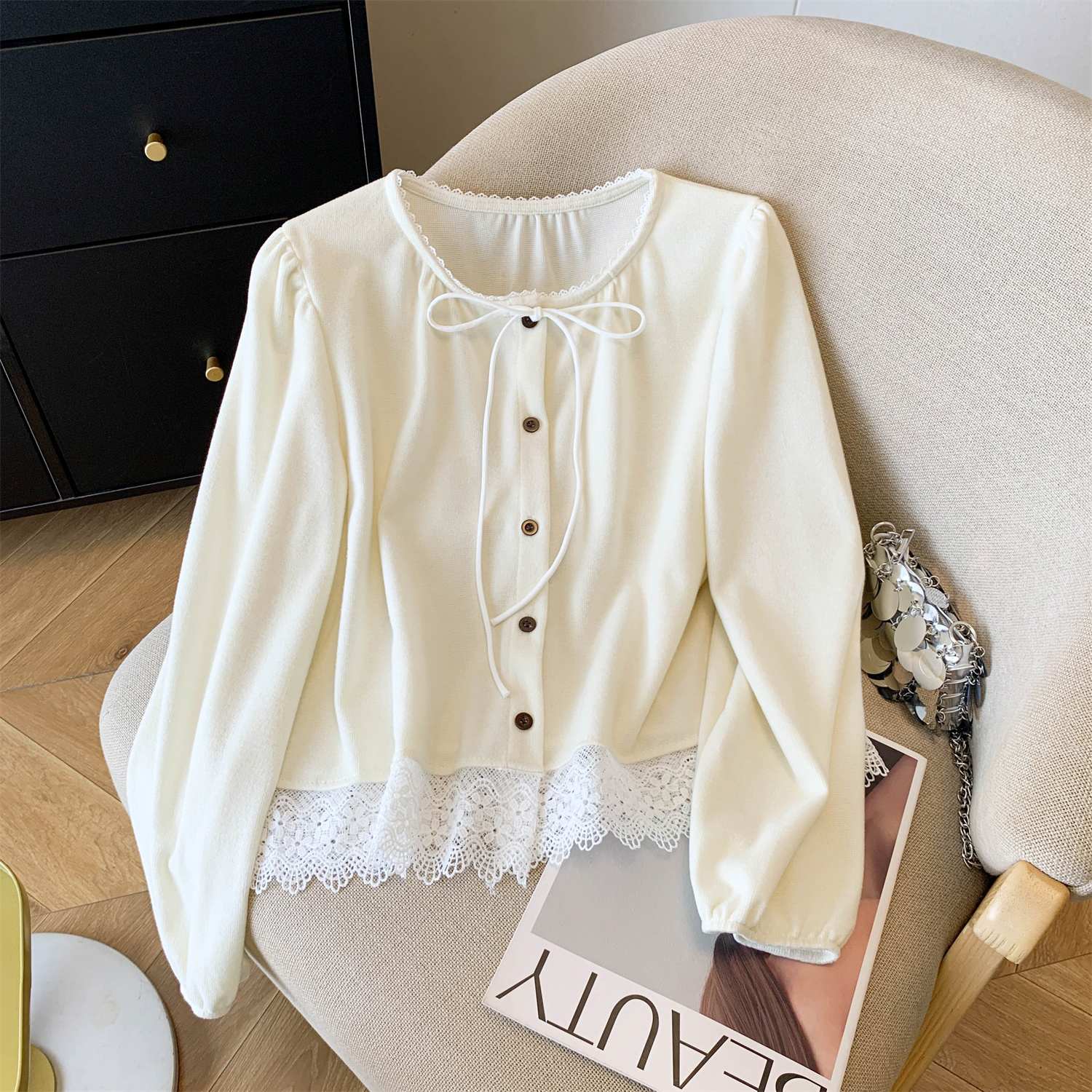 실사 부드러운 바람 크림 한 부서 작은 셔츠 봄 여름 레이스 조각 라운드 넥 긴팔 여성 셔츠