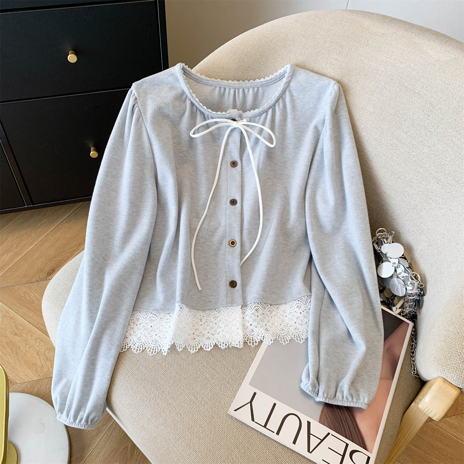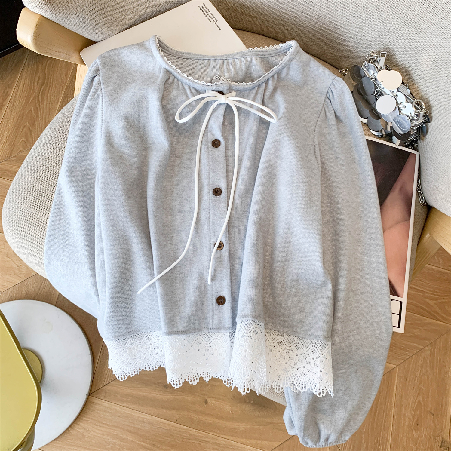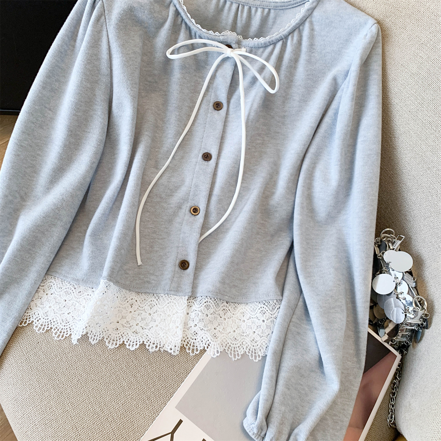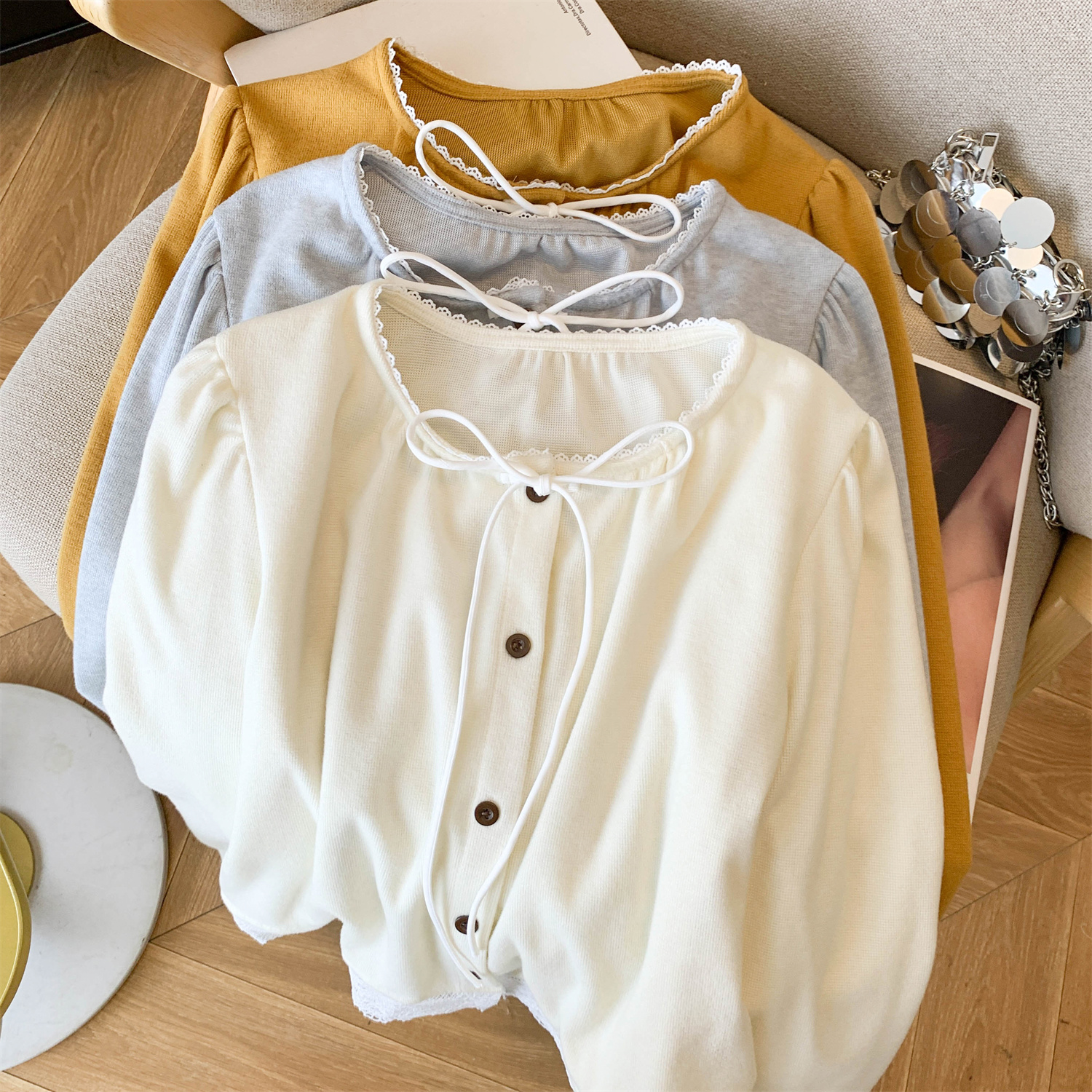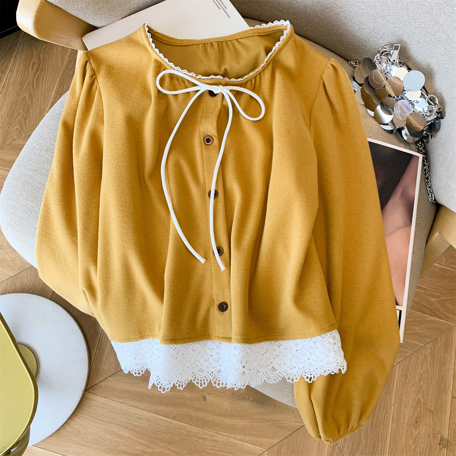 실사 부드러운 바람 크림 한 부서 작은 셔츠 봄 여름 레이스 조각 라운드 넥 긴팔 여성 셔츠