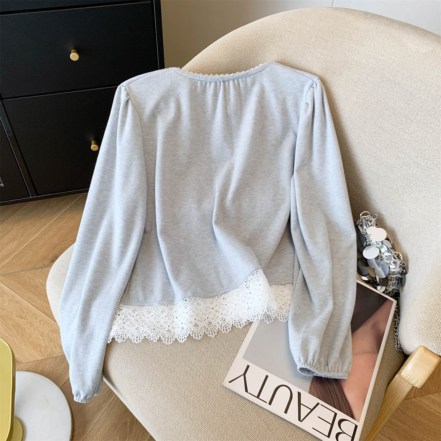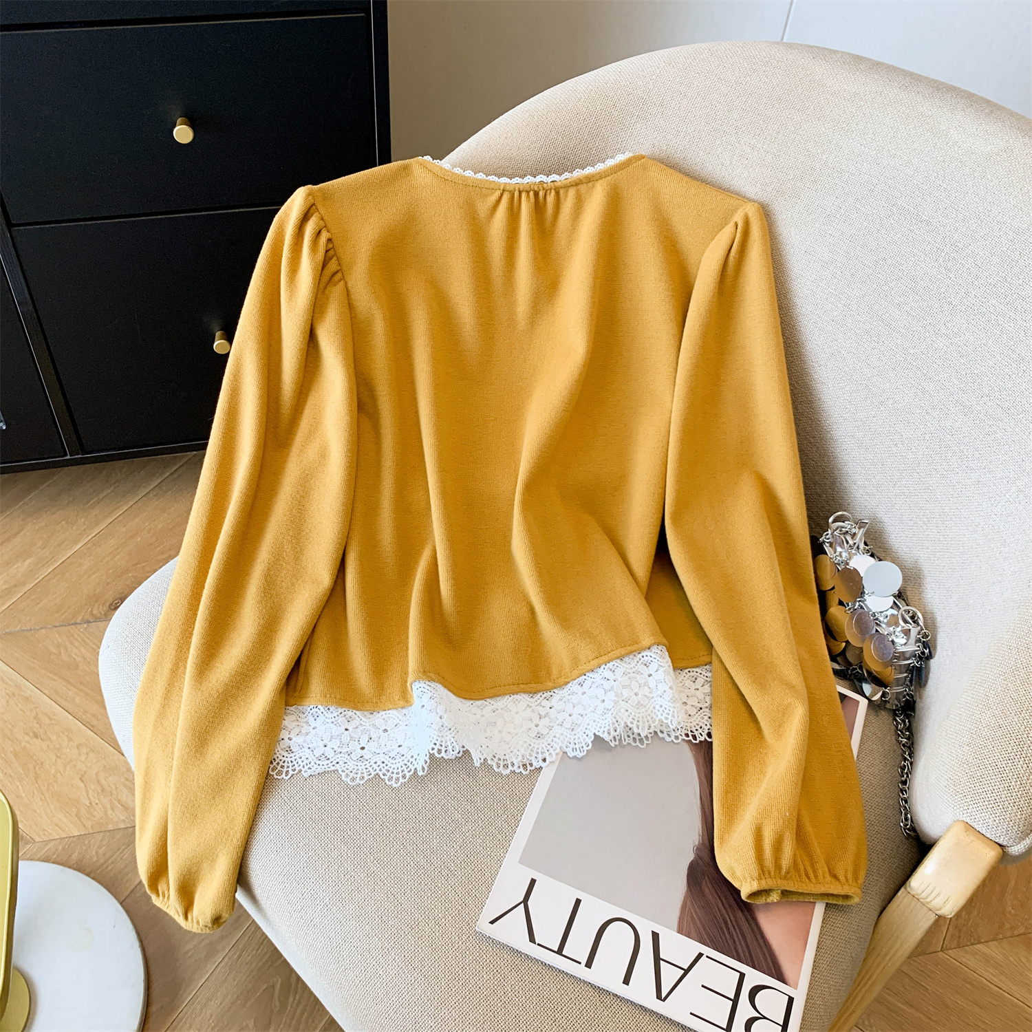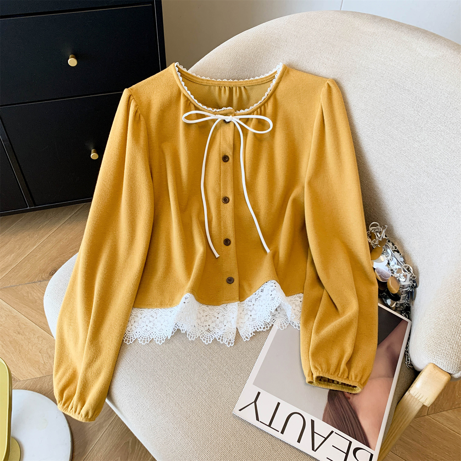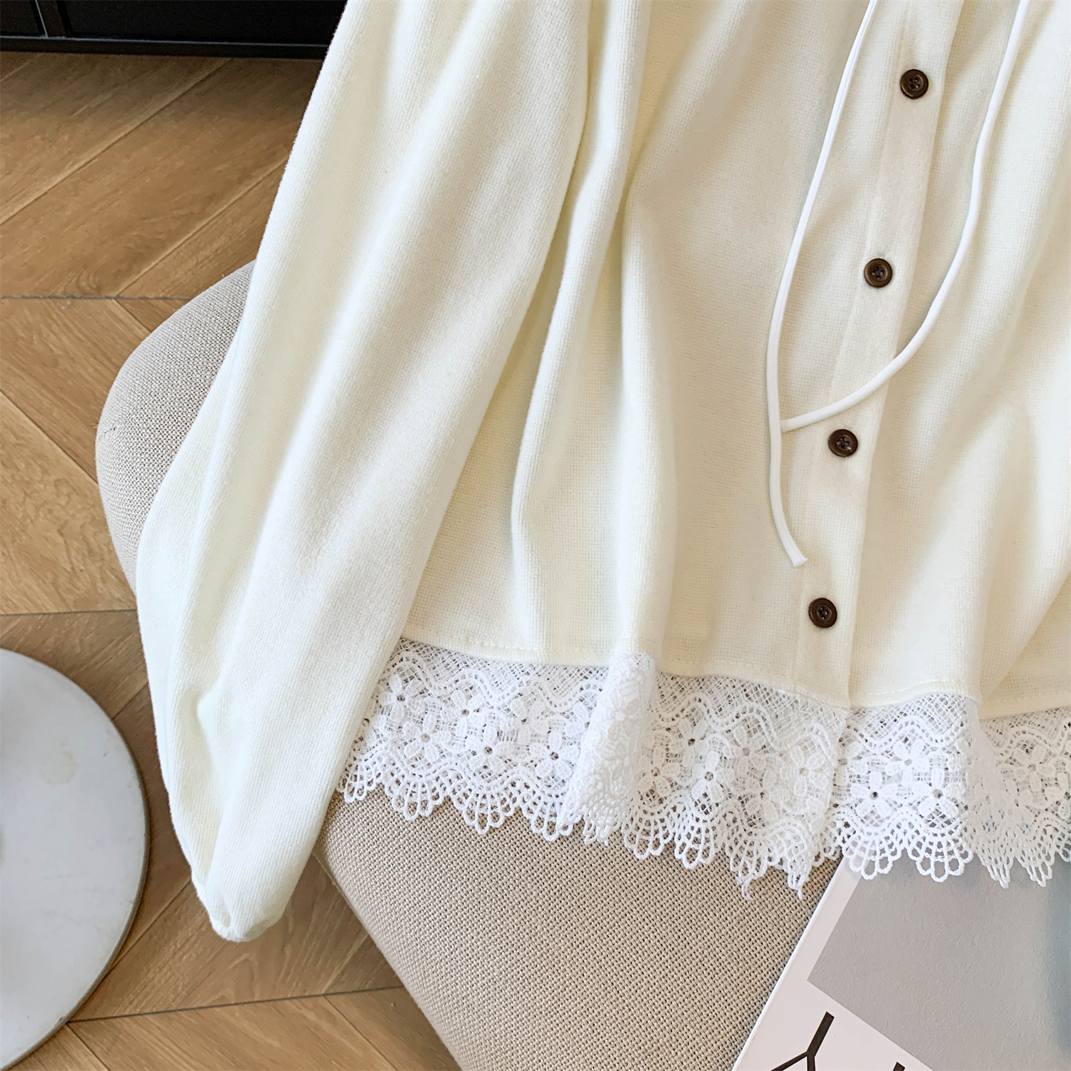 실사 부드러운 바람 크림 한 부서 작은 셔츠 봄 여름 레이스 조각 라운드 넥 긴팔 여성 셔츠