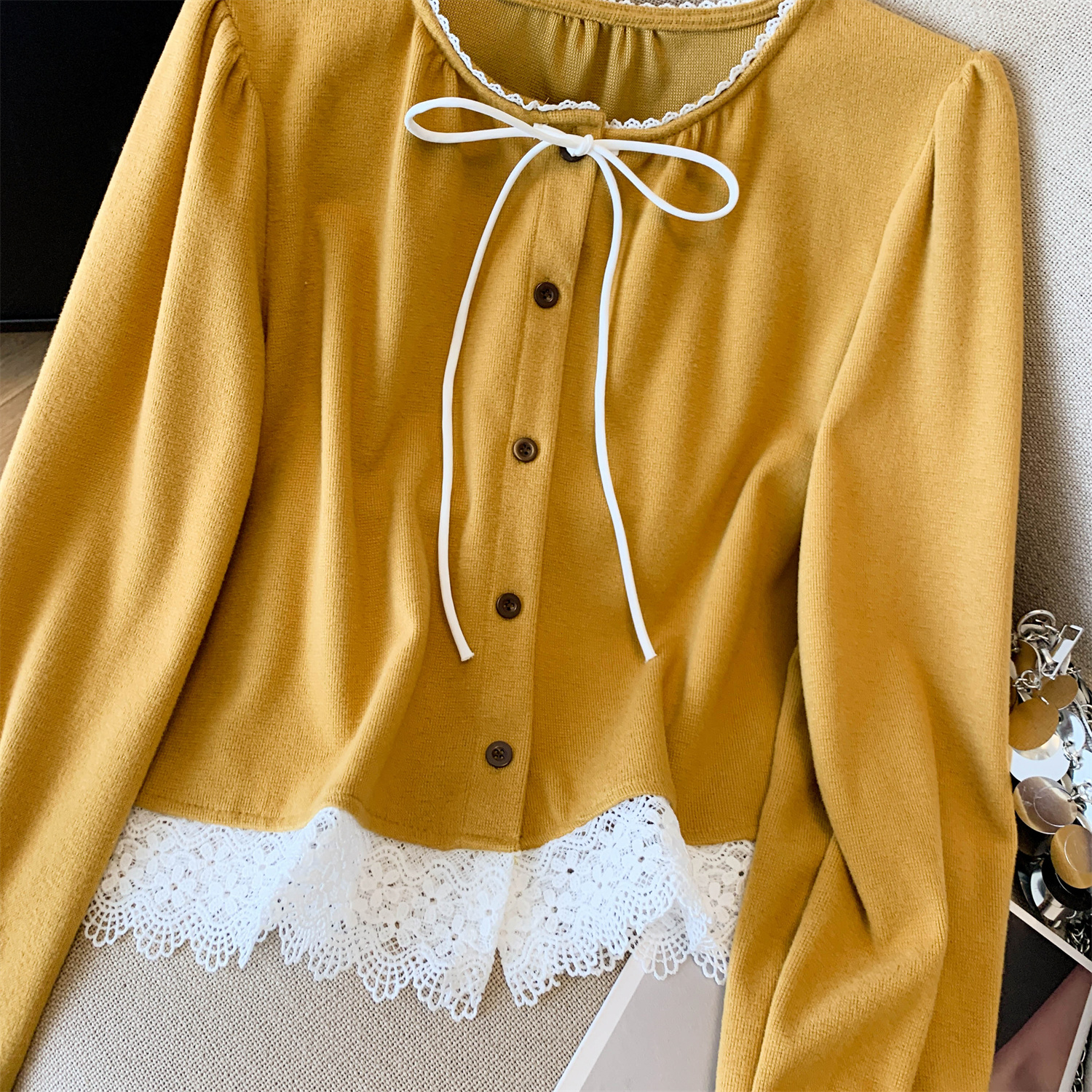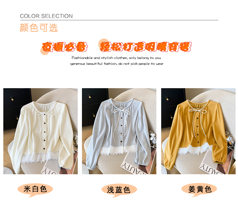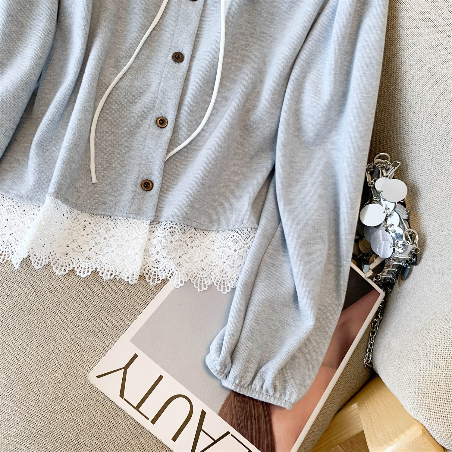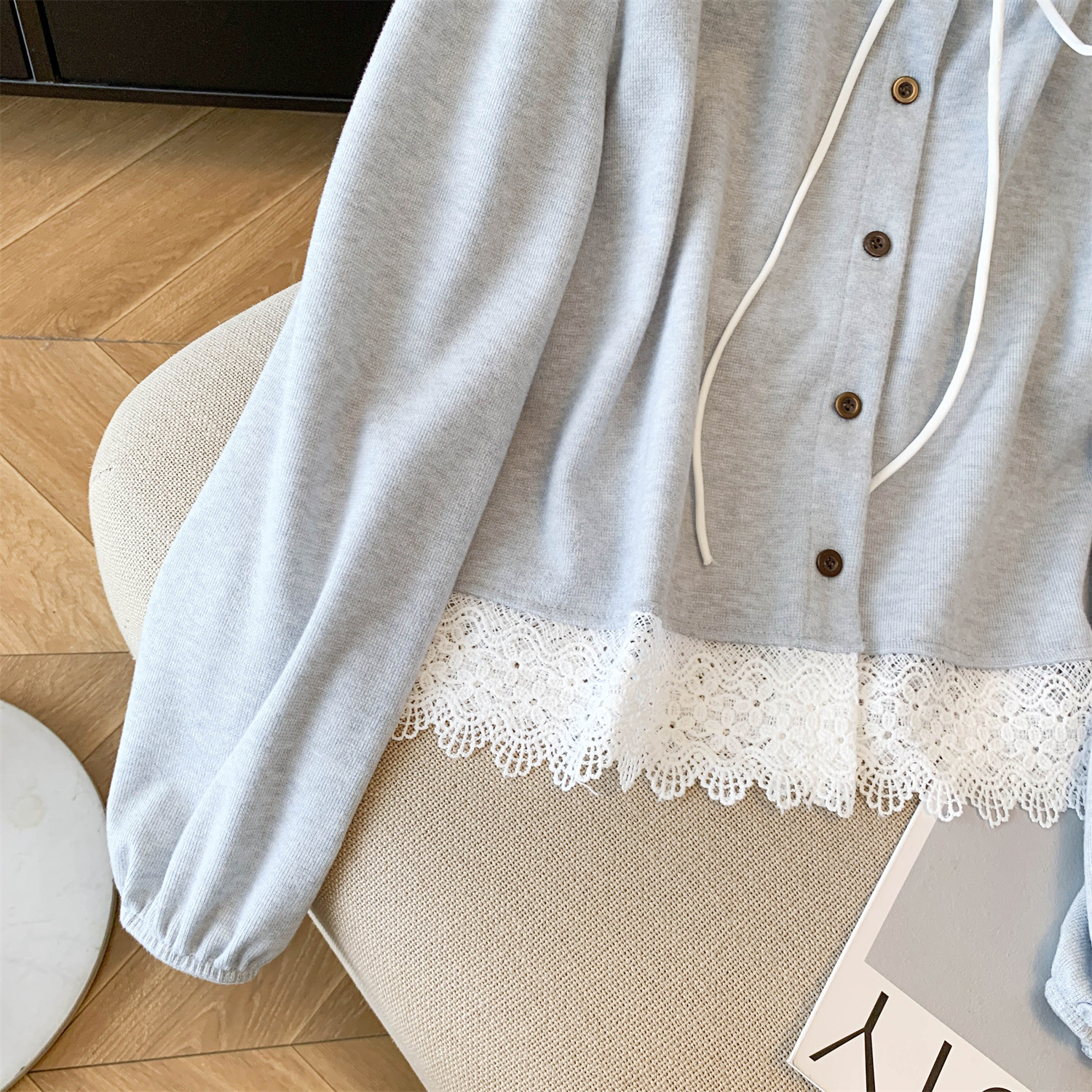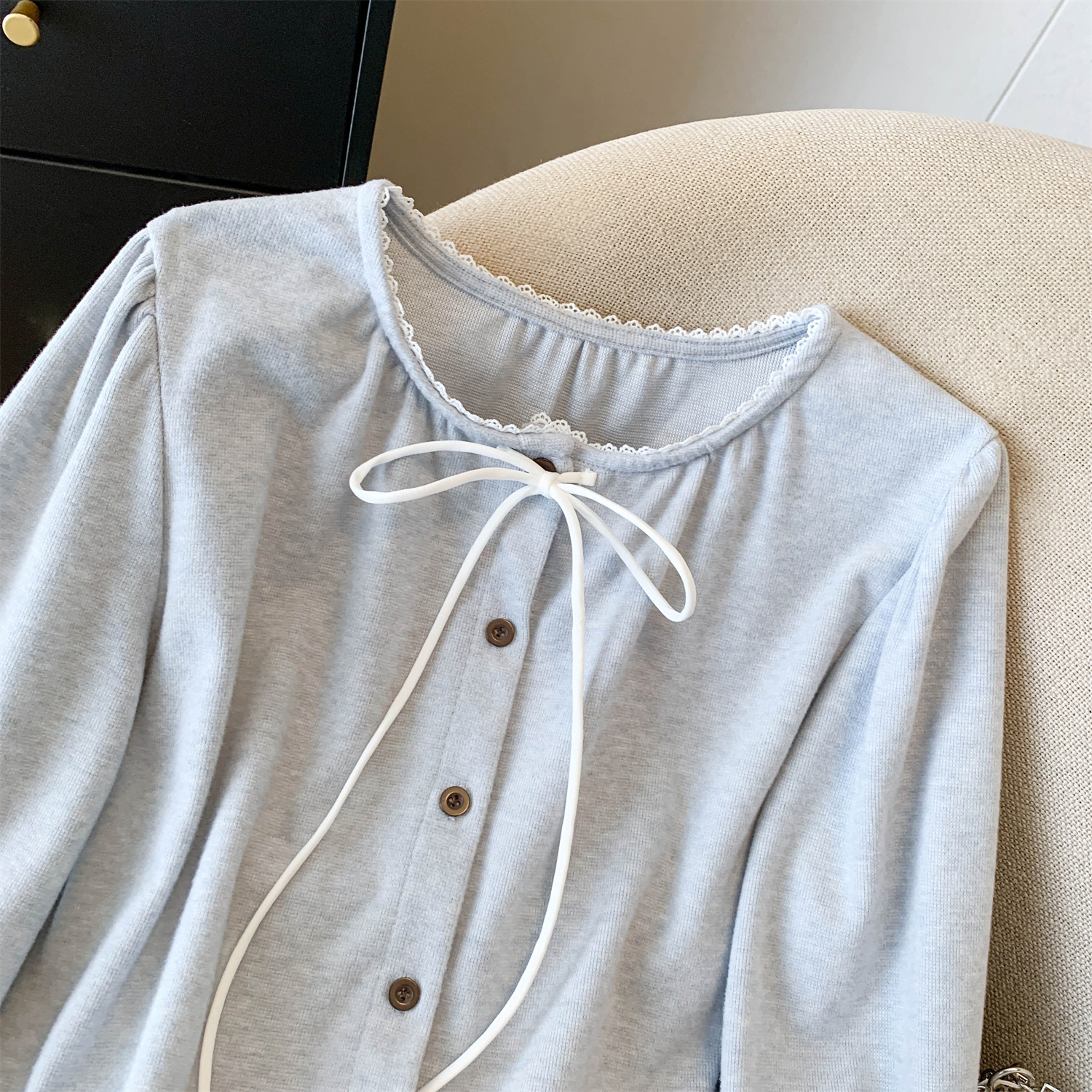실사 부드러운 바람 크림 한 부서 작은 셔츠 봄 여름 레이스 조각 라운드 넥 긴팔 여성 셔츠