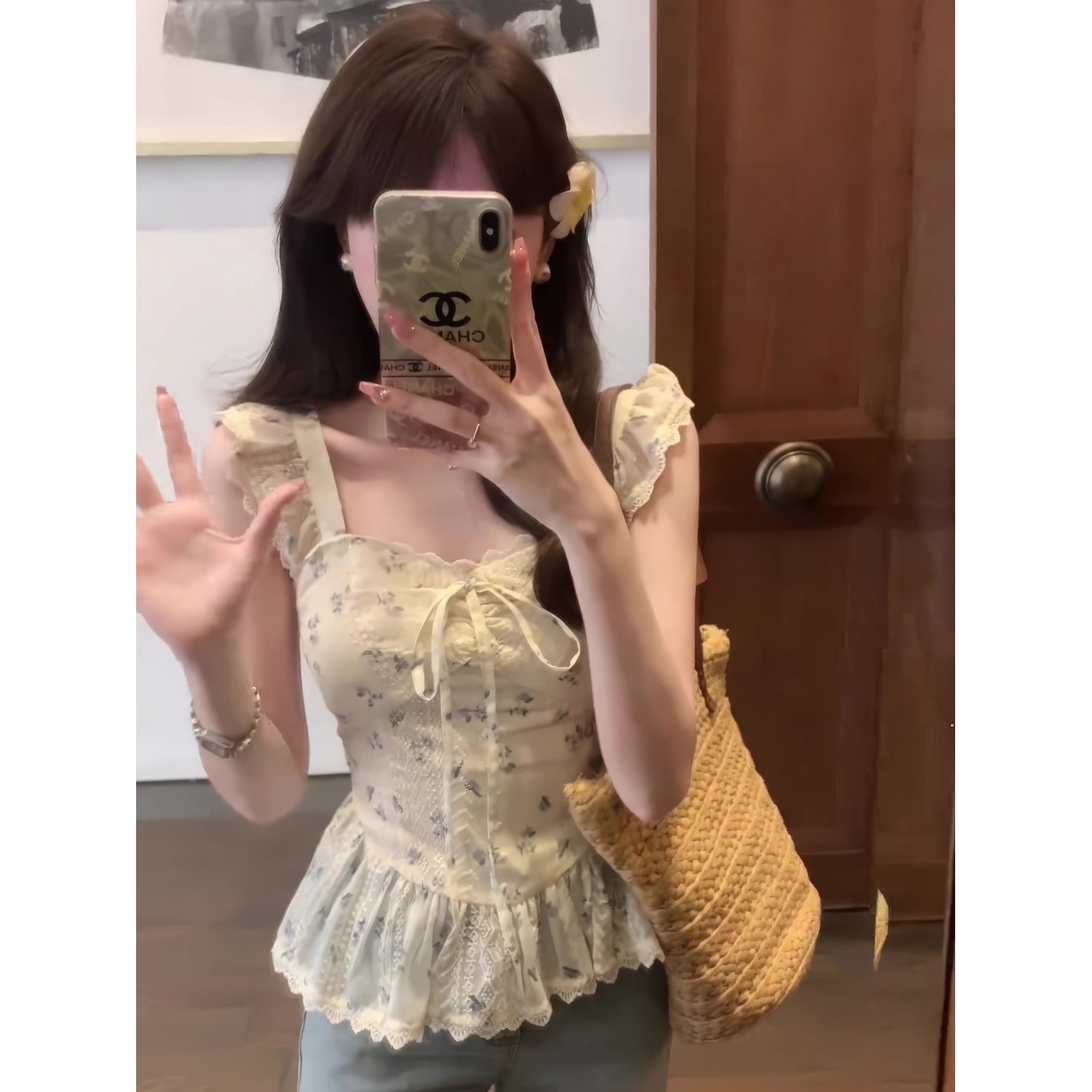 원본 것 달콤한 매운맛 검은 격자 V넥 버블 반팔 여성 셔츠 2026 여름 고유 한 작은 셔츠 허리 수축 맨위