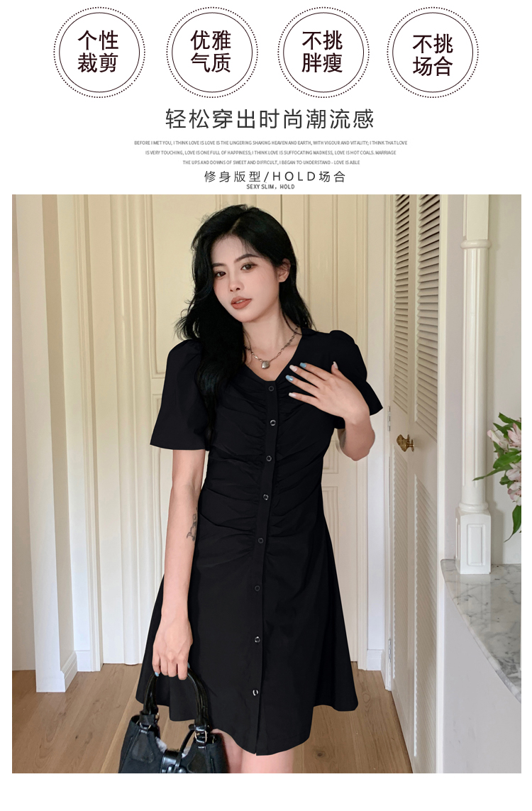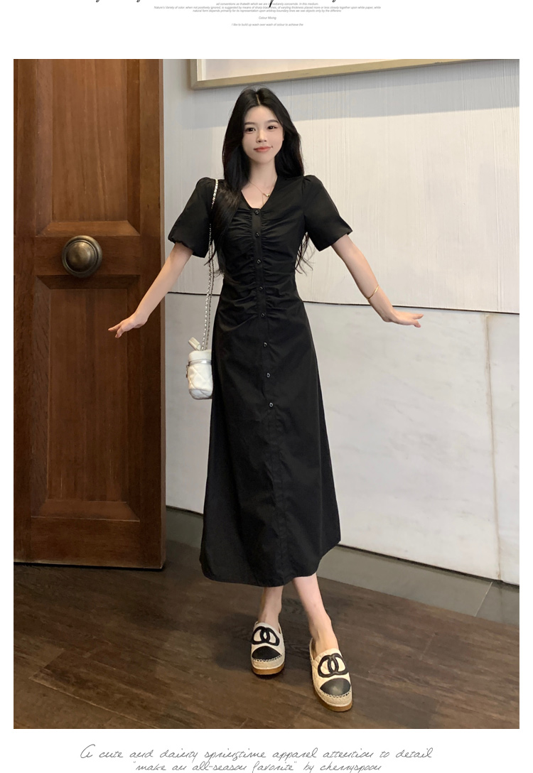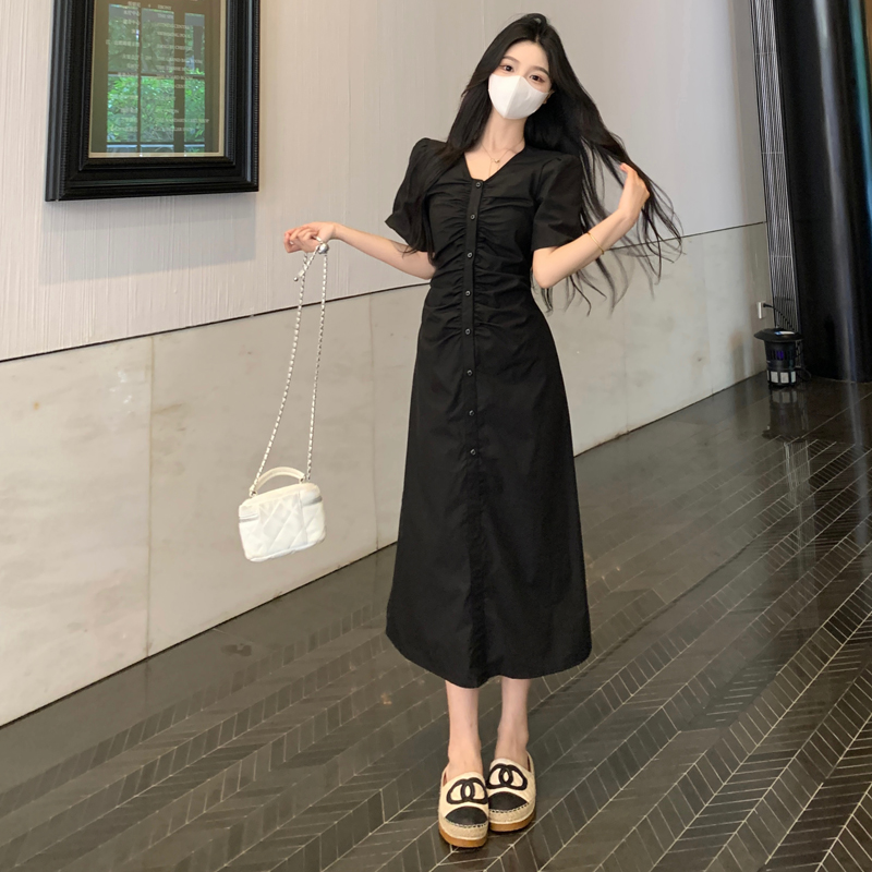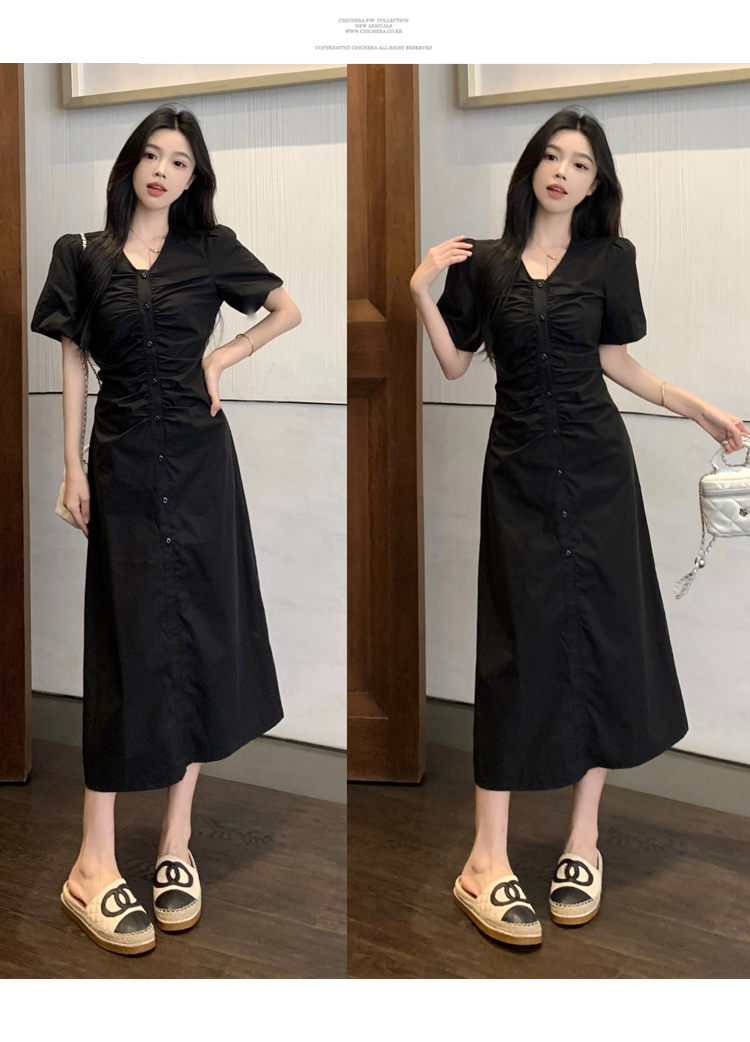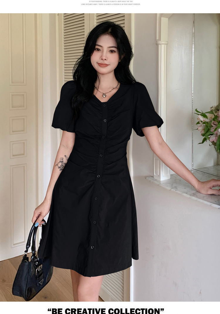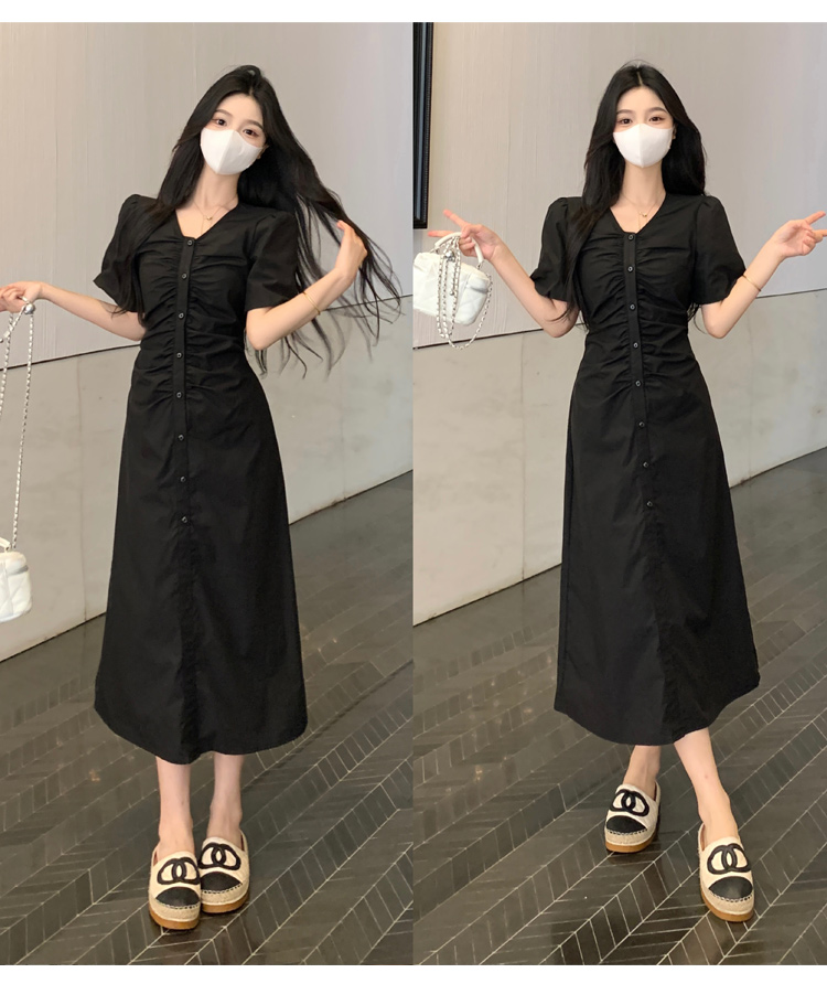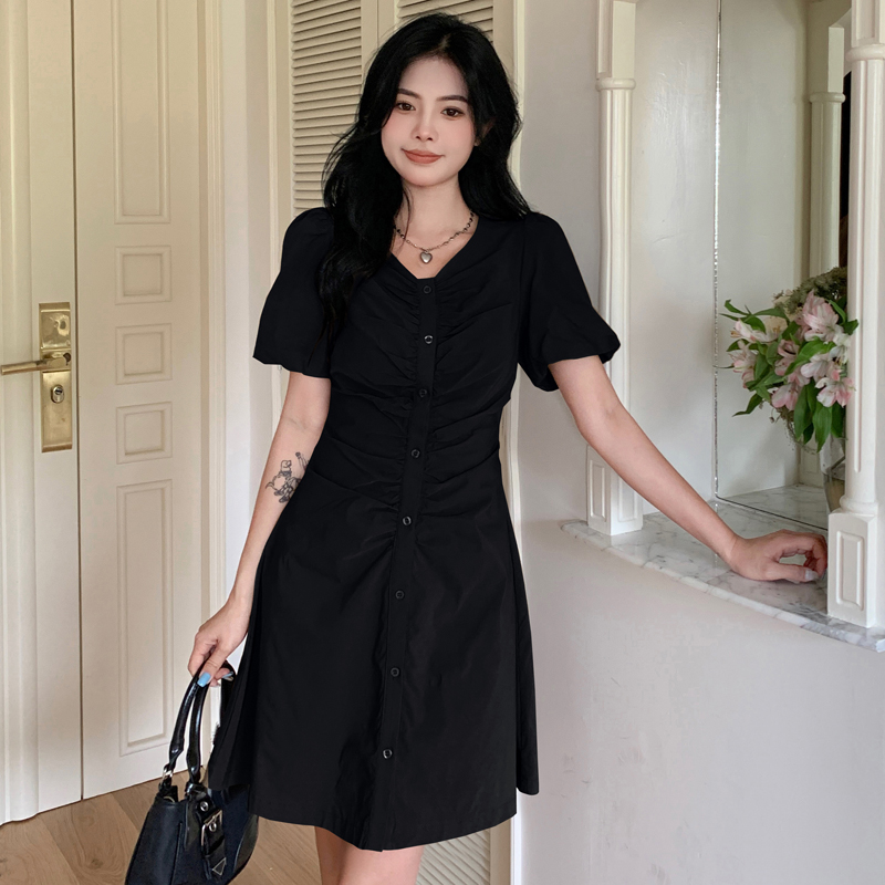 실사 여름 ootd 빅 사이즈 여성 의류 마이크로 지방 mm 슬림해 보이는 작은 검은 드레스 한 부서 패션 꼬집기 허리 드레스