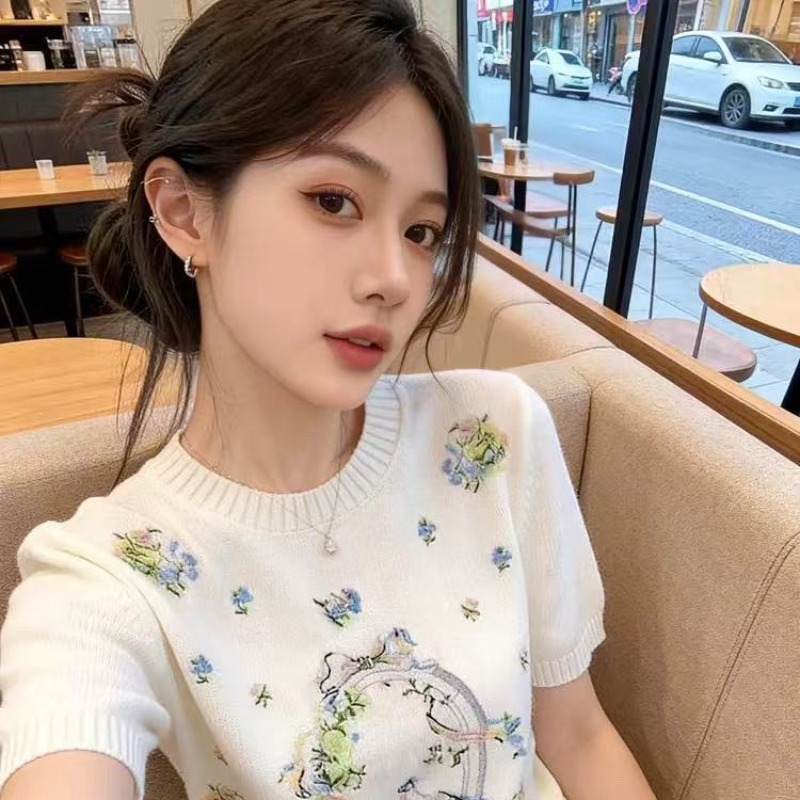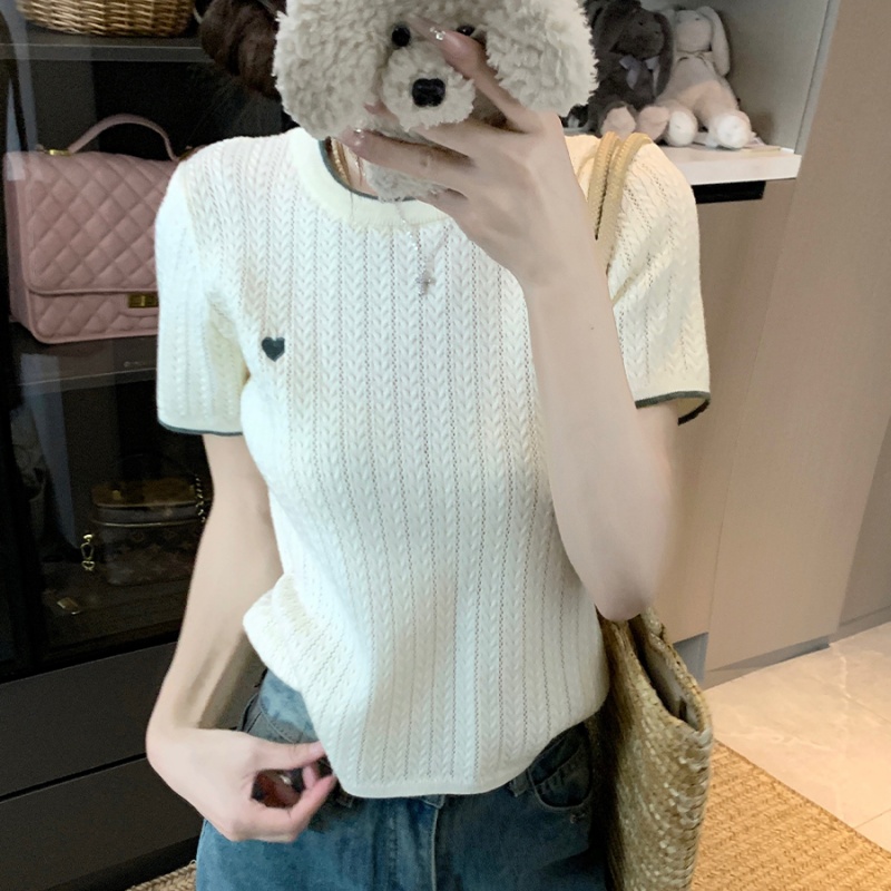 자수 니트 반팔 여름 새로운 디자인 센스 긍정적 인 어깨 배색 라운드 넥 기본 셔츠 인사이드 가져 가라. 티셔츠