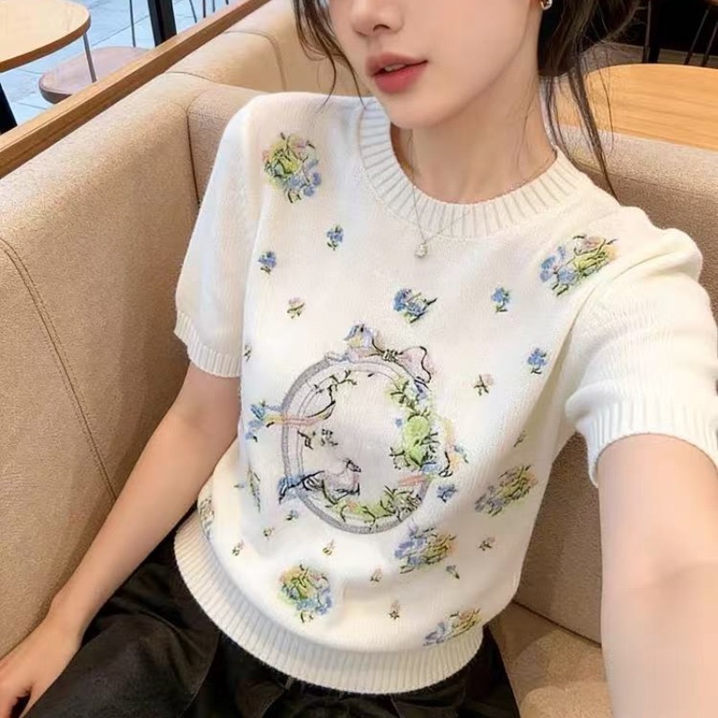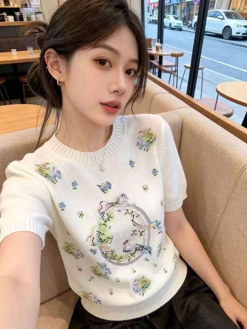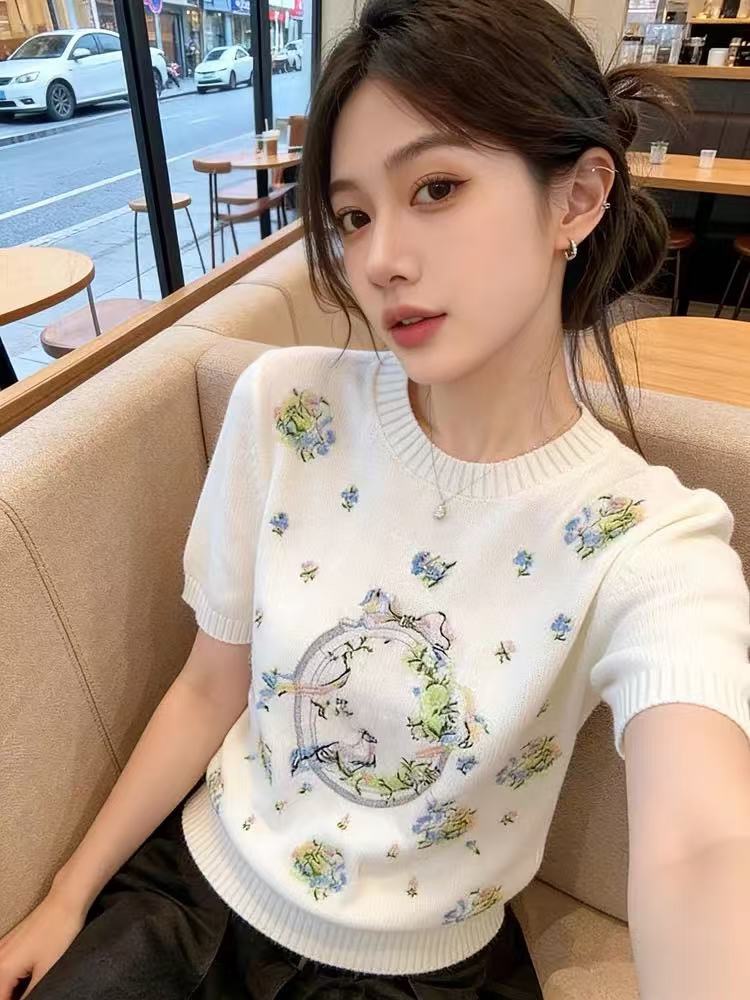 보존 섹션 추천 작은 샤넬 스타일 무거운 작업 꽃 자수 반팔 티셔츠 여성 봄 새로운 품격 연령 감소 니트 스웨터