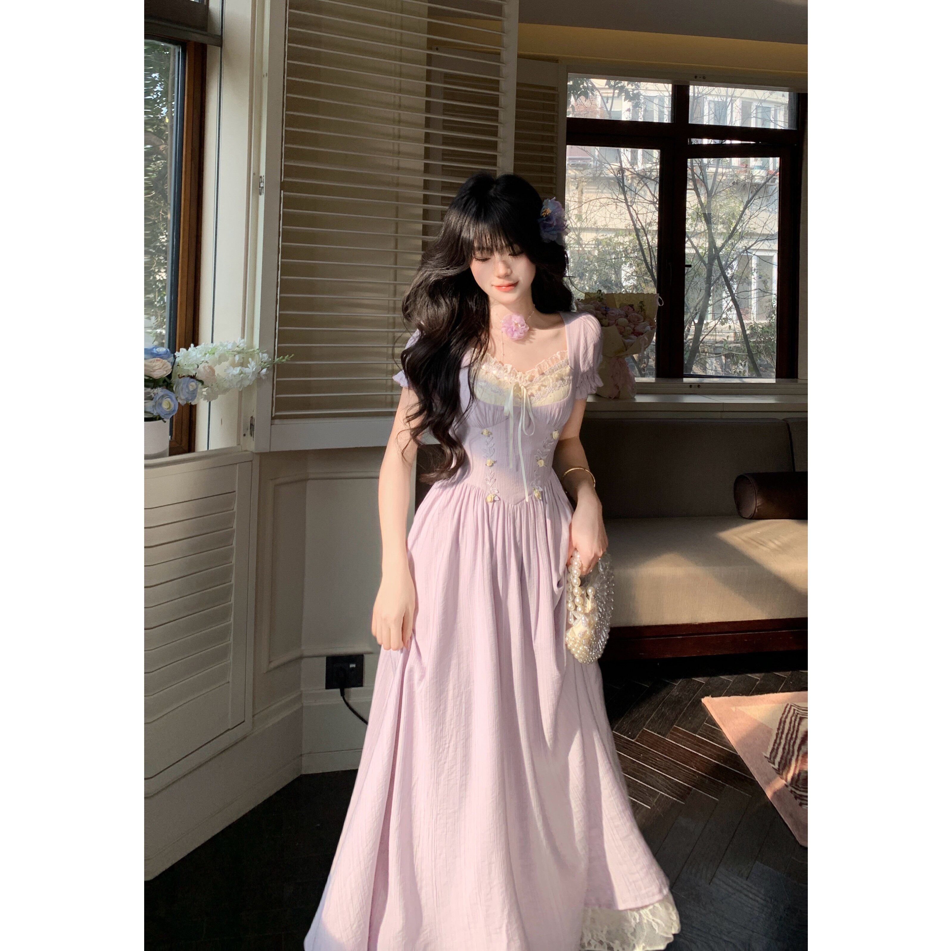 2026 년 여름 새로운 여성 의류 달콤한 미국 칼라 거품 소매 허리 수축 슬림해 보이는 차 휴식 프랑스식 롱 스커트 여성 드레스