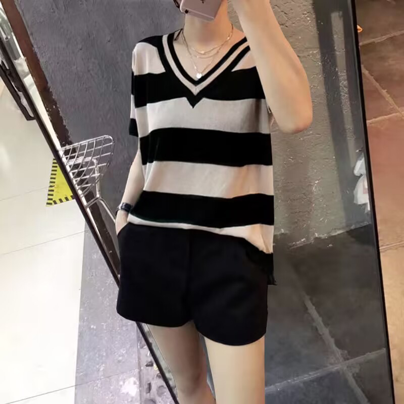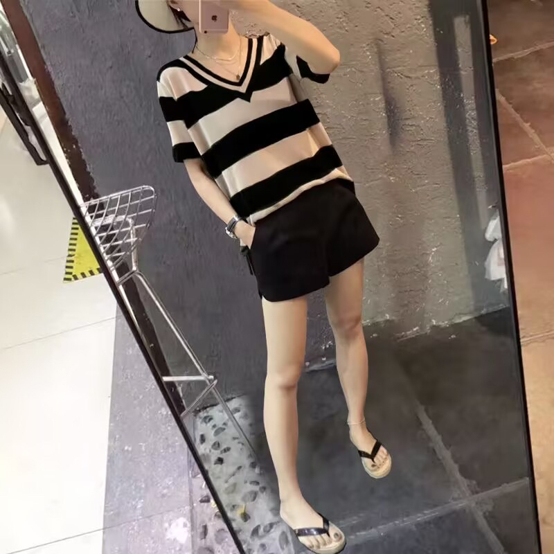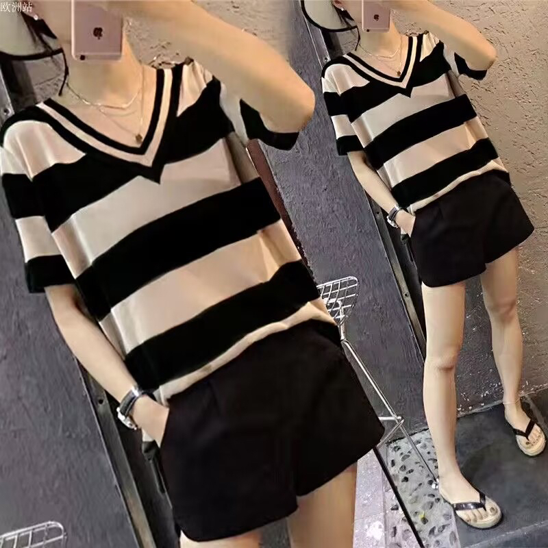 여름 새로운 빅 사이즈 여성 의류 지방 mm 200 kg 패치워크 스트라이프 맨위 루즈핏 슬림해 보이는 9부 바지 둘 여성 세트