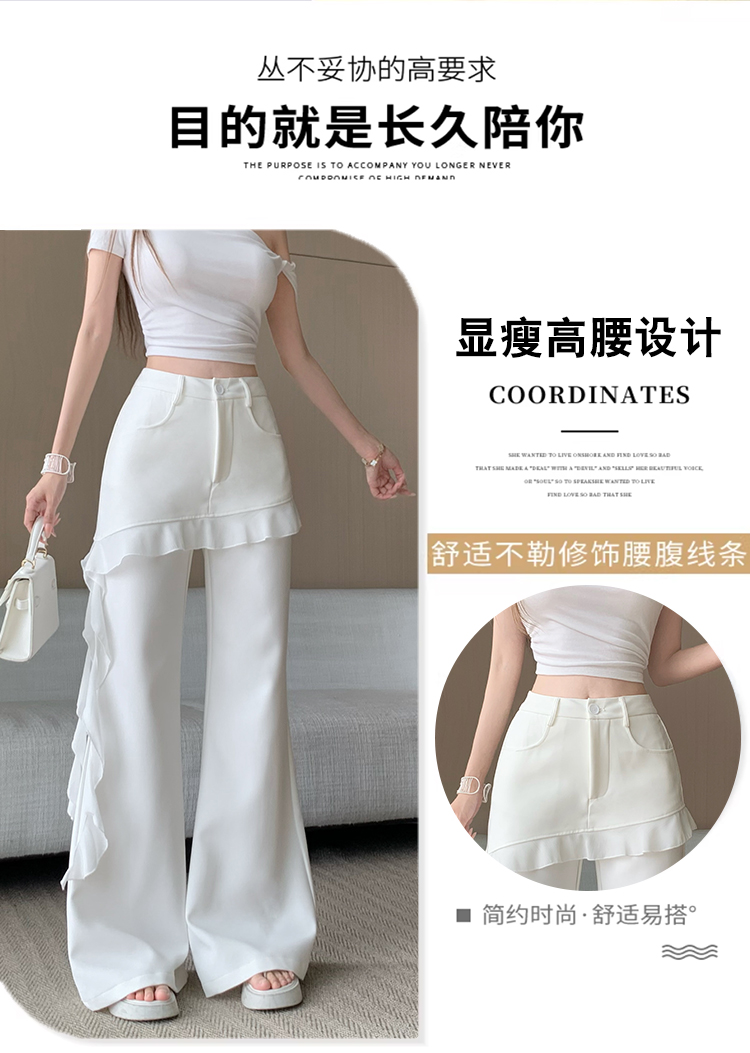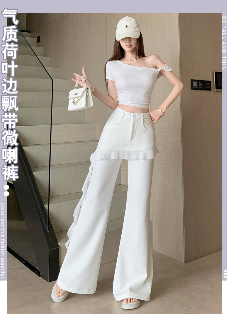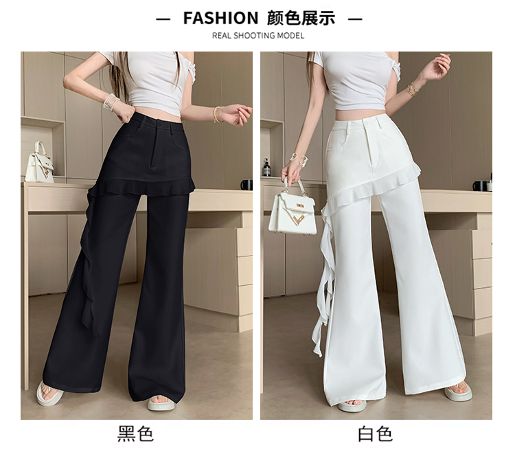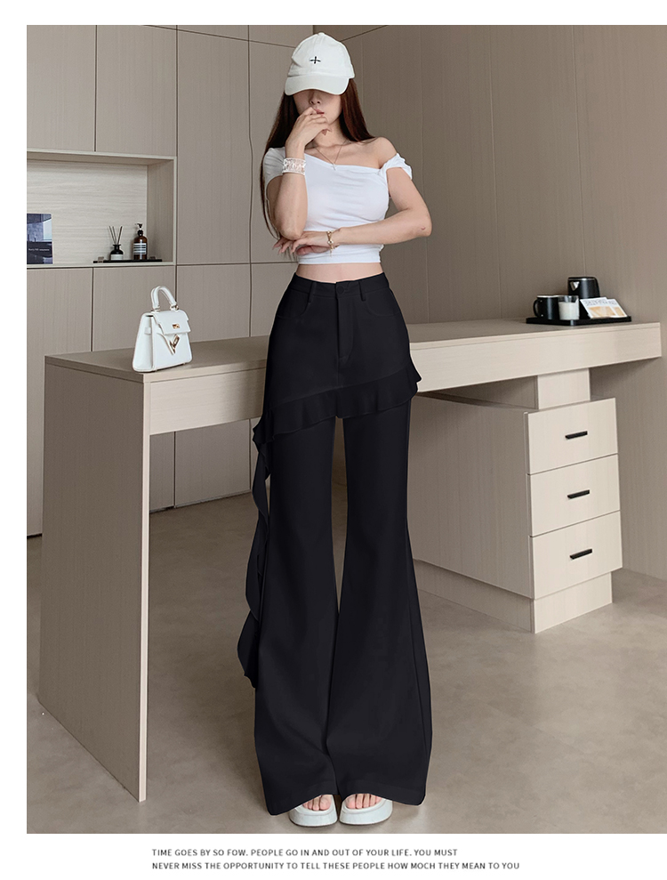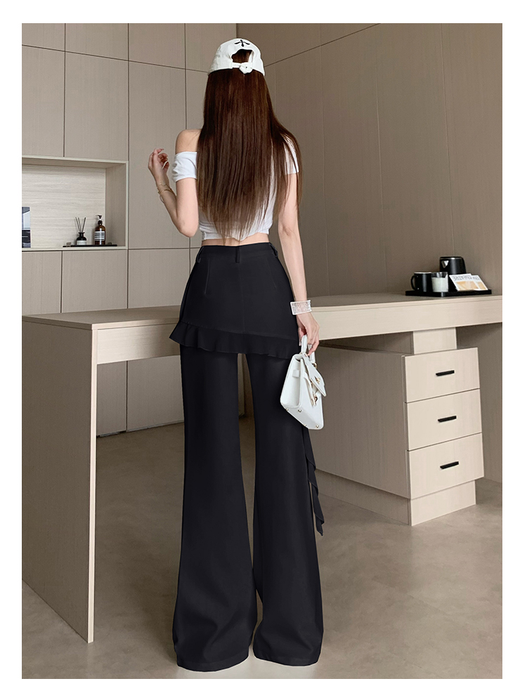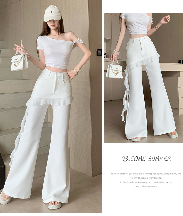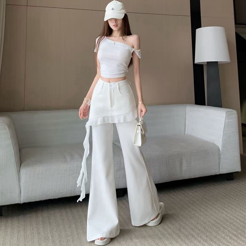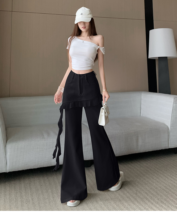 화이트 리본 프릴 디자인 센스 페이크 레이어드 부츠컷 바지 여성 봄 여름 새로운 하이웨이스트 도루 센스 캐주얼 스트레이트 팬츠