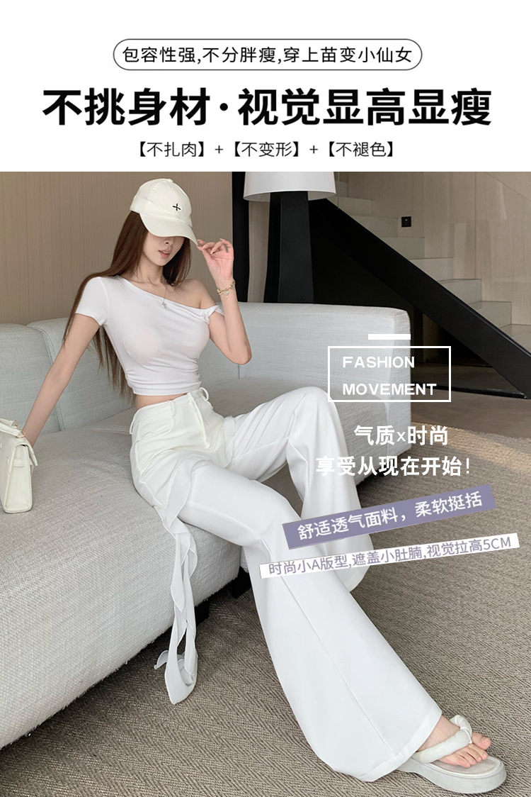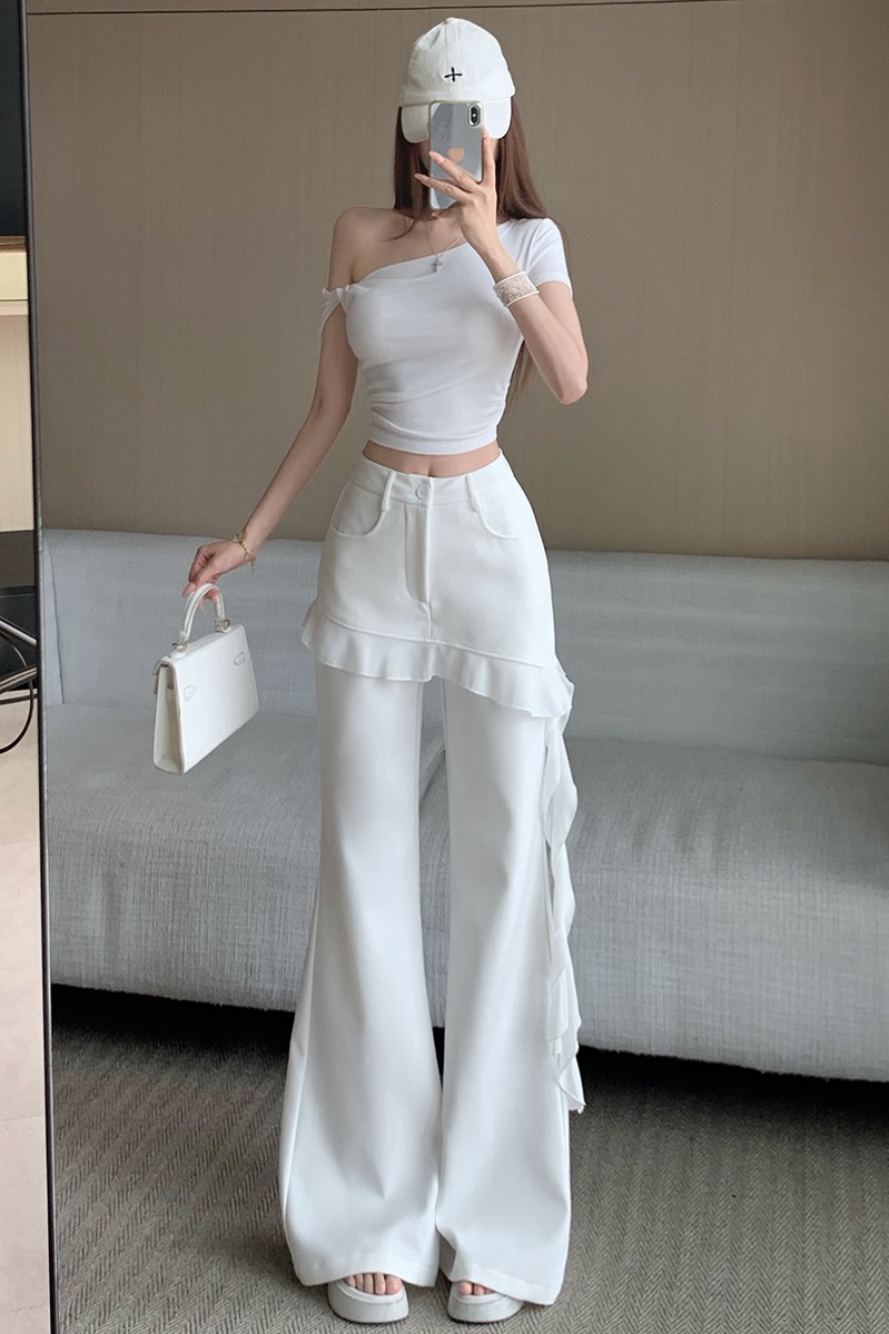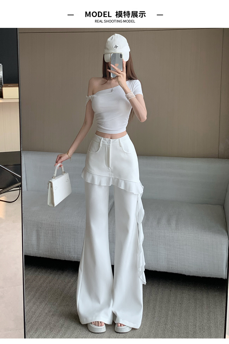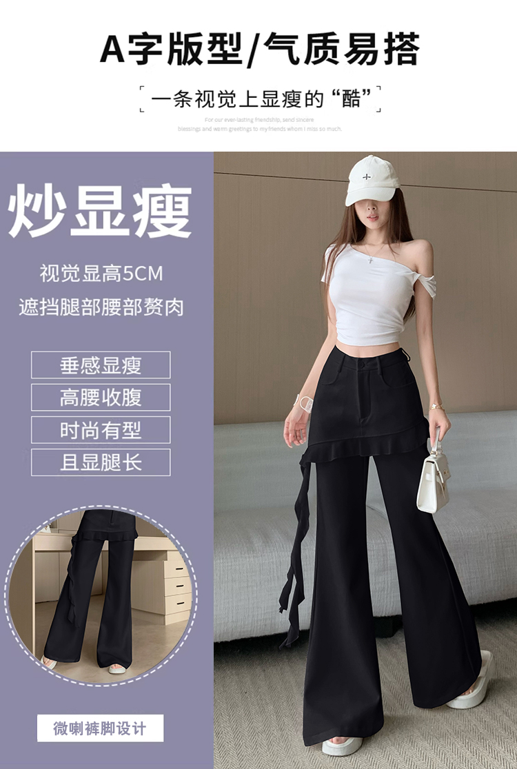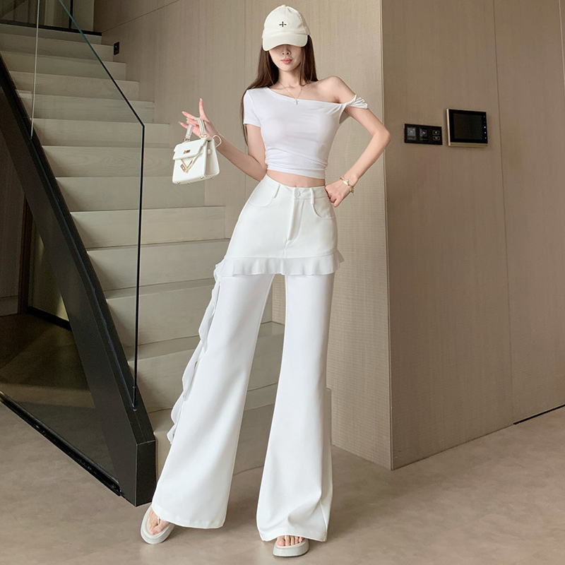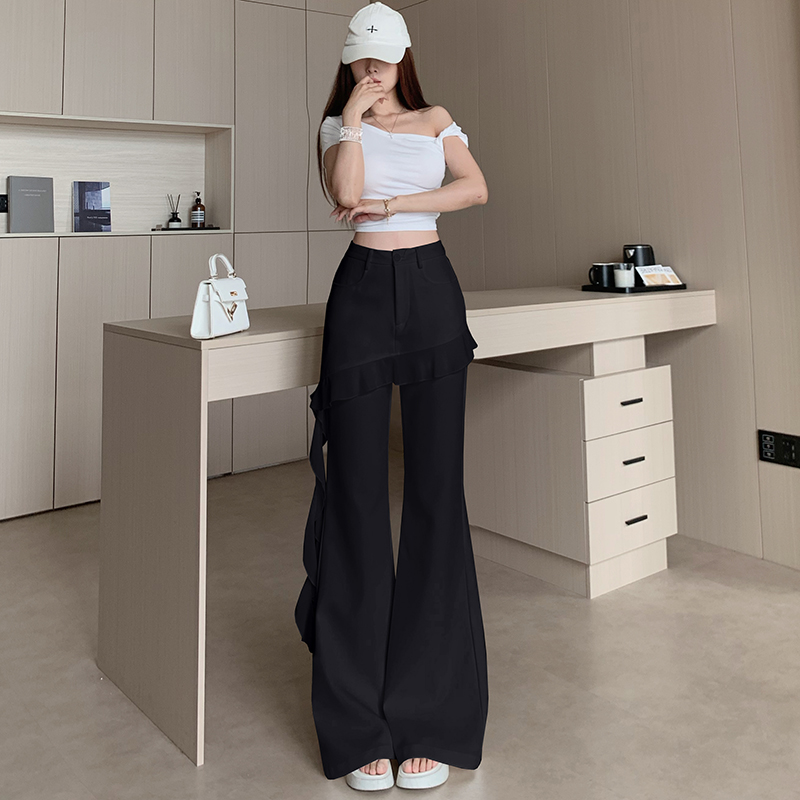 화이트 리본 프릴 디자인 센스 페이크 레이어드 부츠컷 바지 여성 봄 여름 새로운 하이웨이스트 도루 센스 캐주얼 스트레이트 팬츠