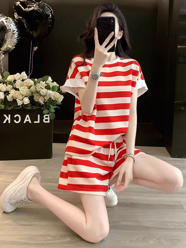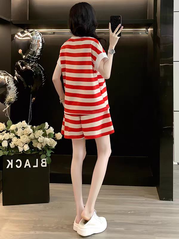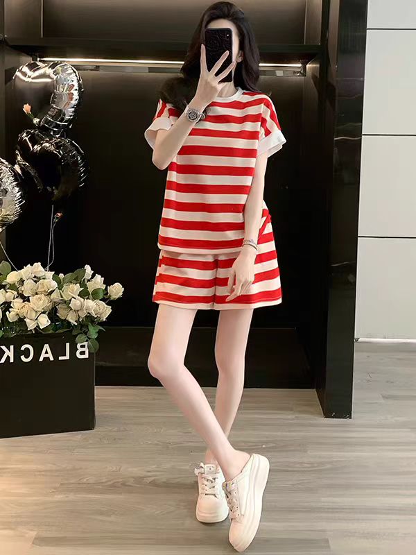 2026 여름 폭발 캐주얼 스포츠 슈트 여성 외국 가스 연령 감소 빨간색 스트라이프 반팔 티셔츠 반바지 투피스 세트