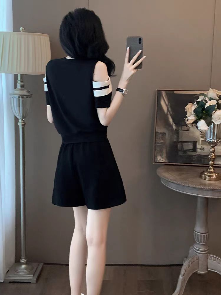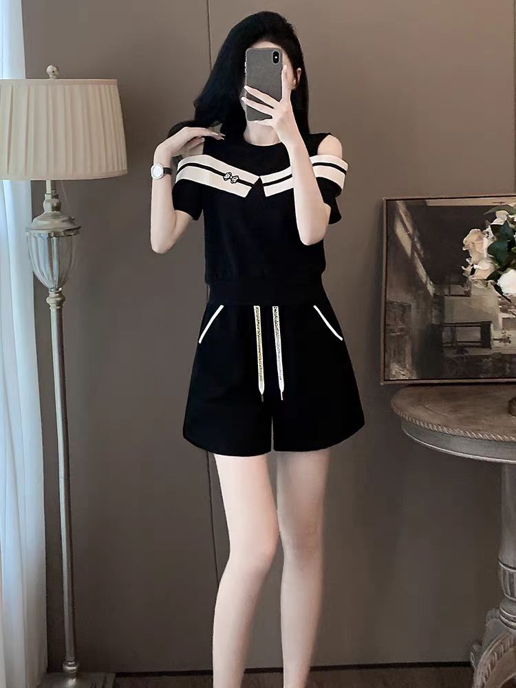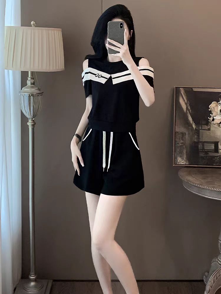 인터넷 유명인 오프숄더 반팔 스포츠 슈트 여성 2026 새로운 여름 패션 연령 감소 외국 가스 캐주얼 반바지