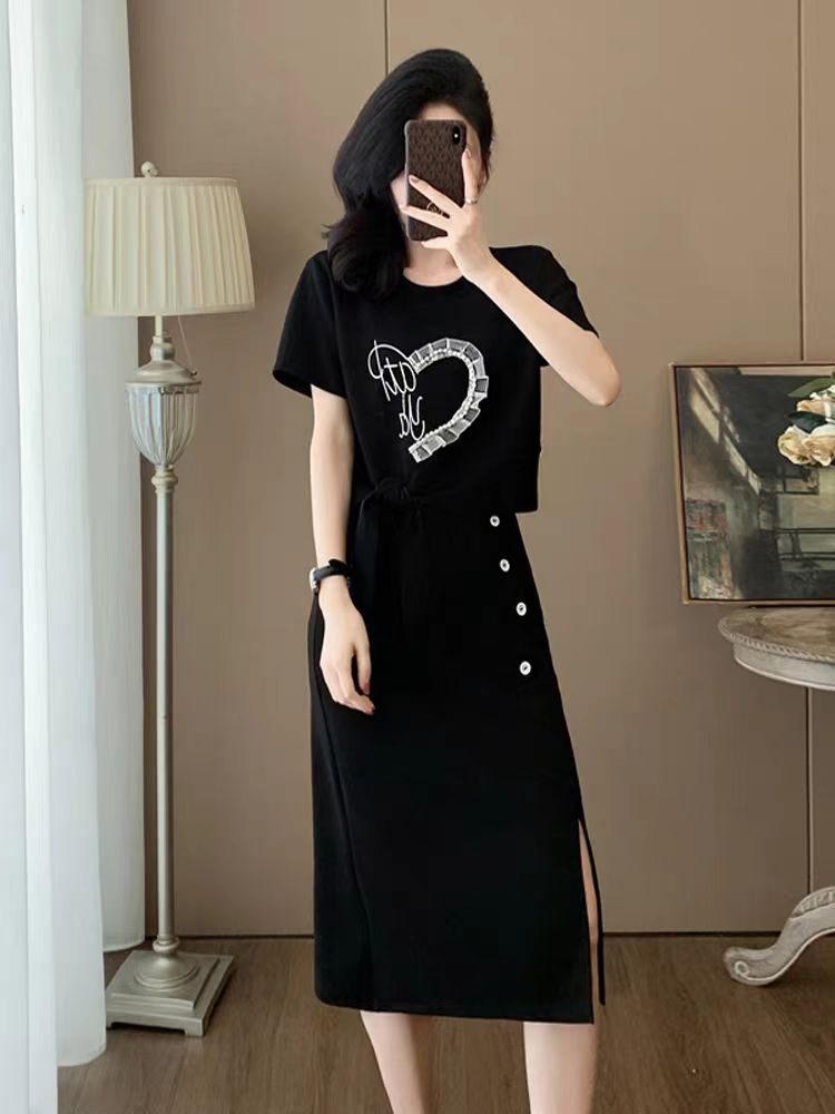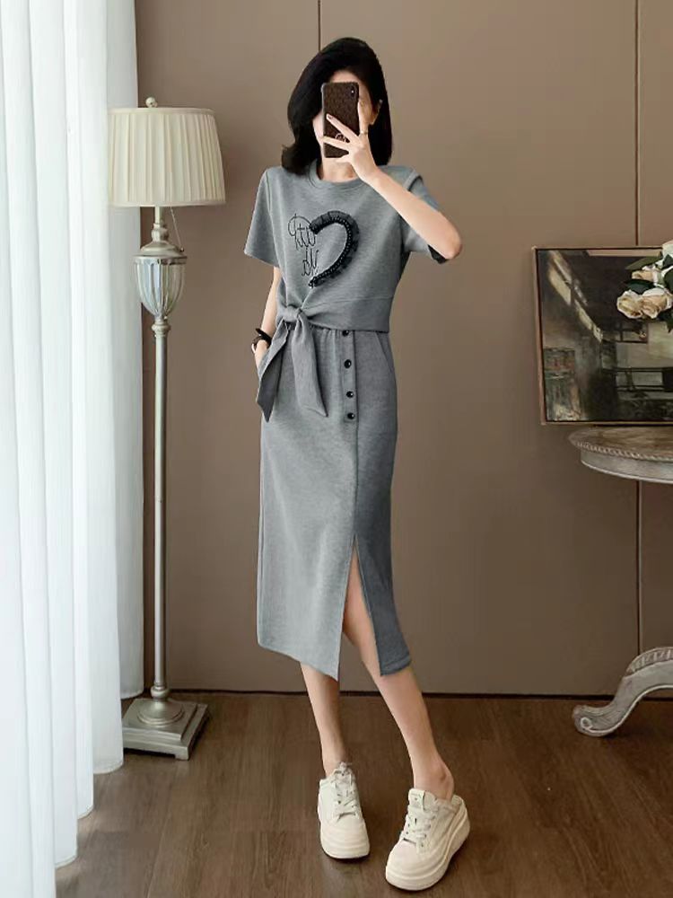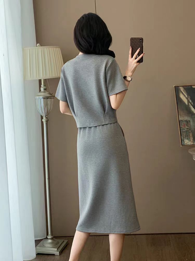 회색 고급 센스 캐주얼 패션 세트 드레스 여름 슬림해 보이는 연령 감소 외국 가스 운동 반팔 반신 스커트 투피스 세트