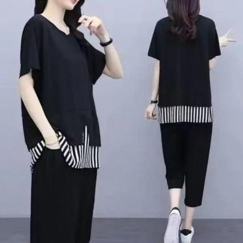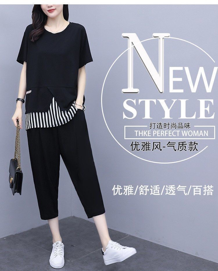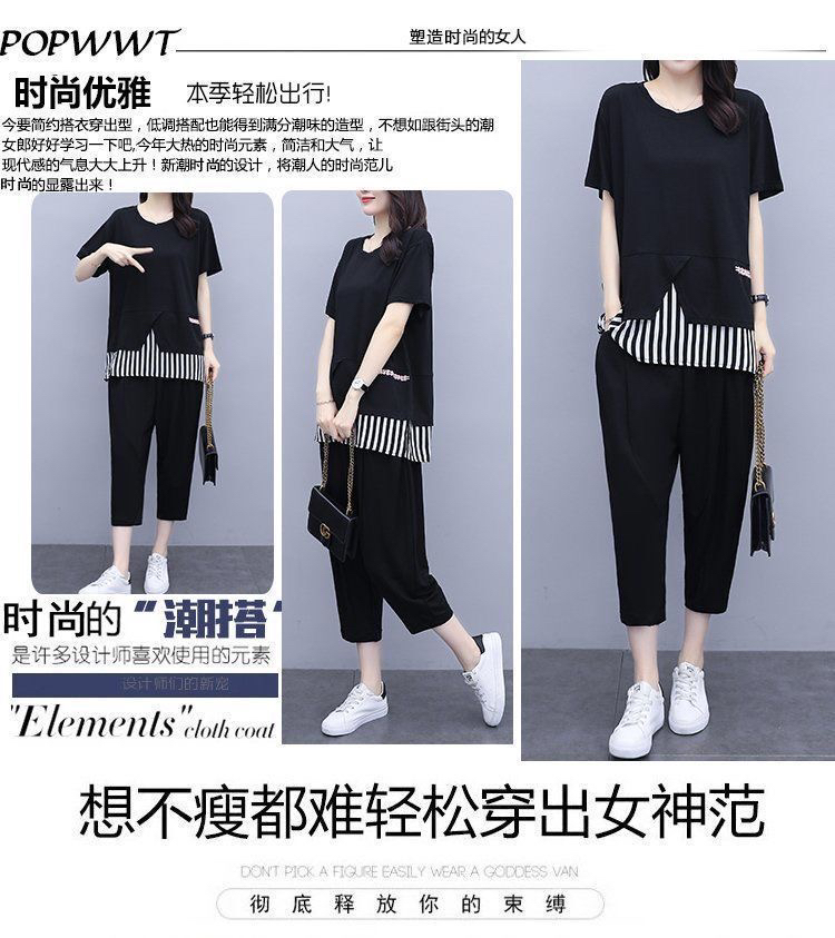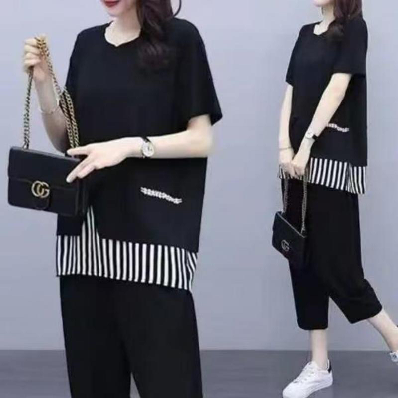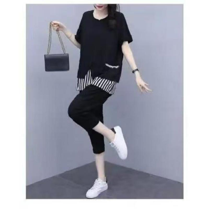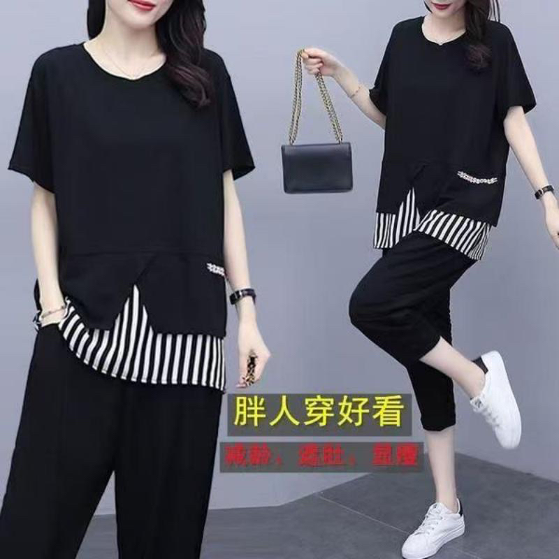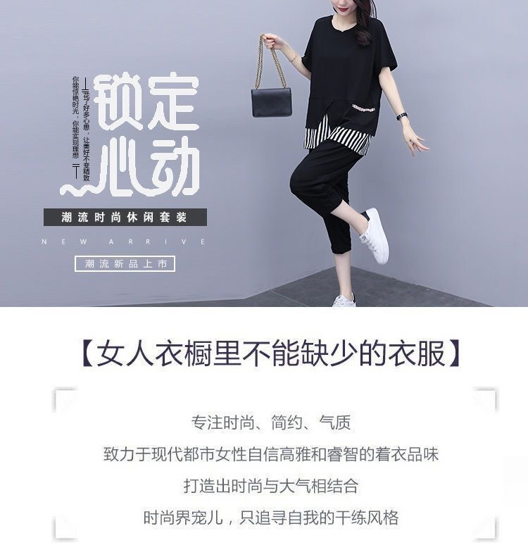 여름 새로운 빅 사이즈 여성 의류 지방 mm 200 kg 패치워크 스트라이프 맨위 루즈핏 슬림해 보이는 9부 바지 둘 여성 세트