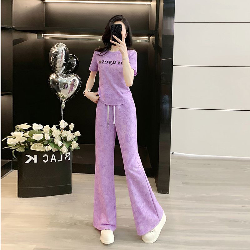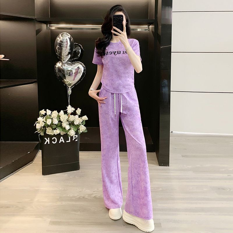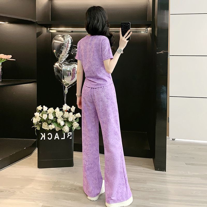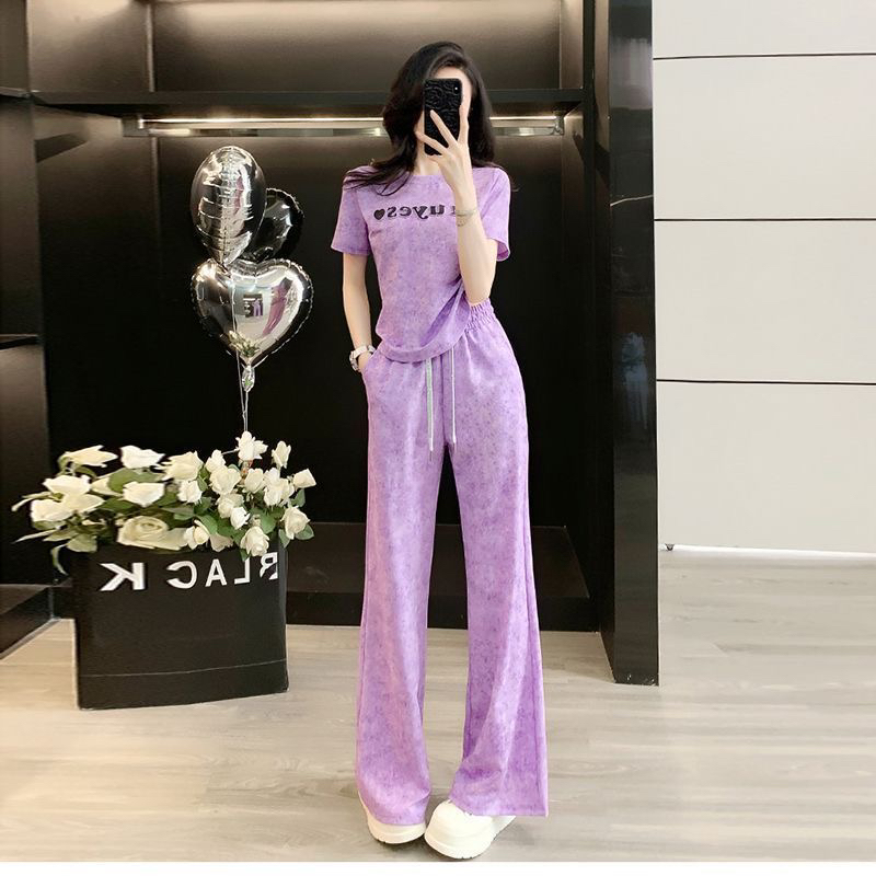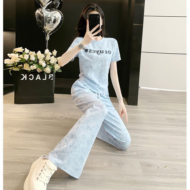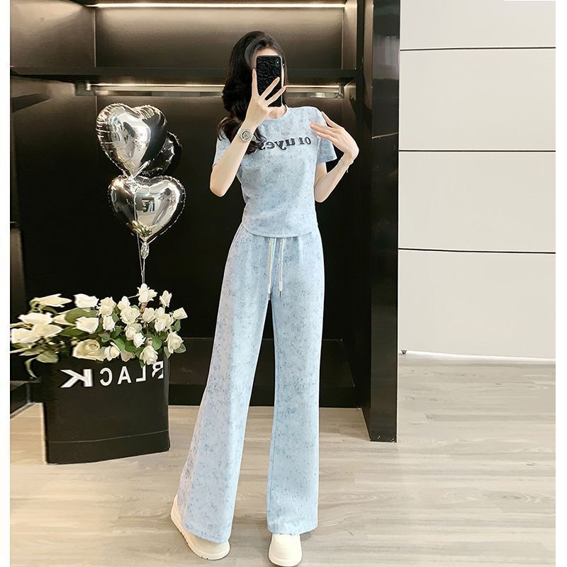 하늘색 홀치기 염색 패션 연령 감소 캐주얼 스포츠 슈트 여성 2026 여름 새로운 반팔 와이드 레그 팬츠 투피스 세트