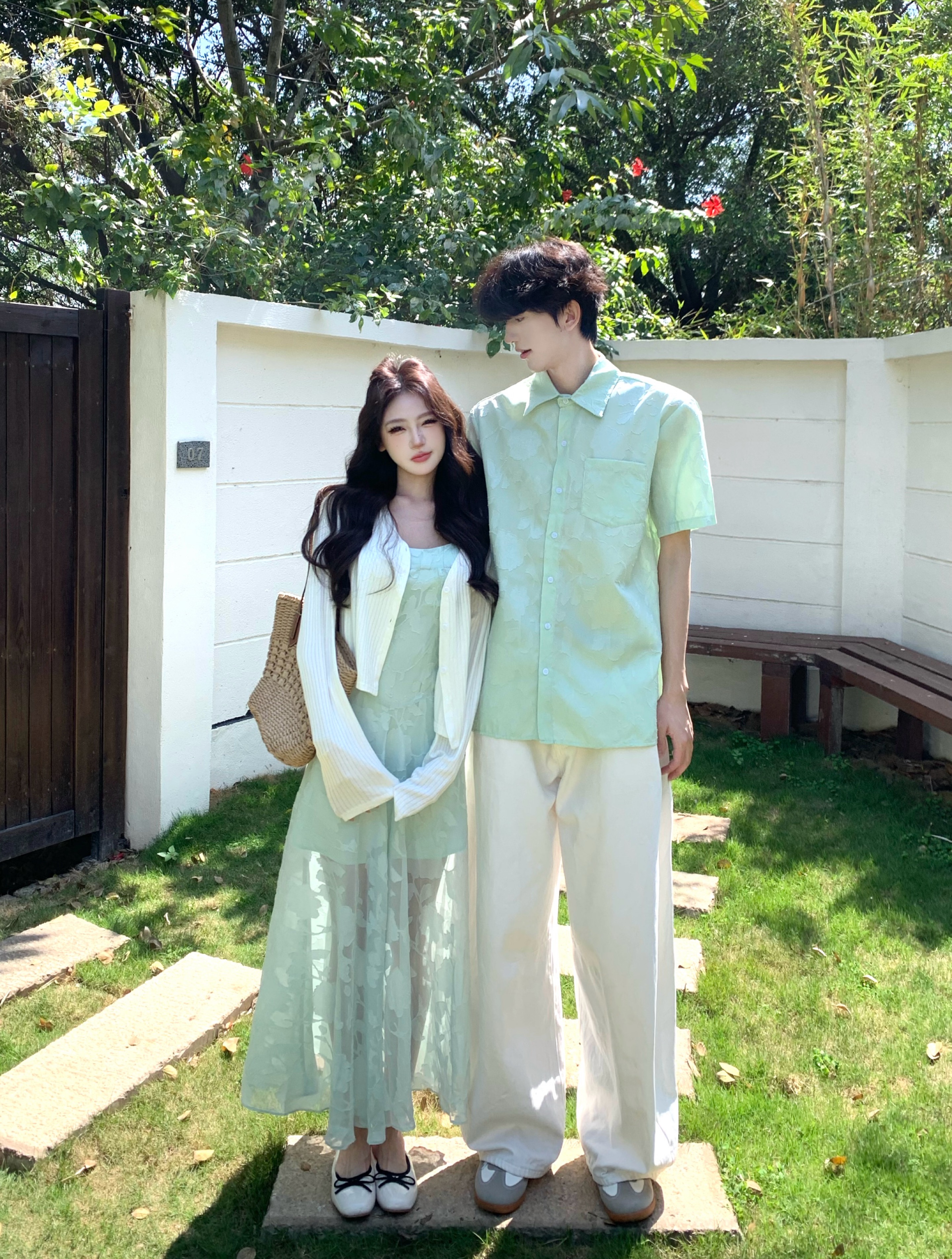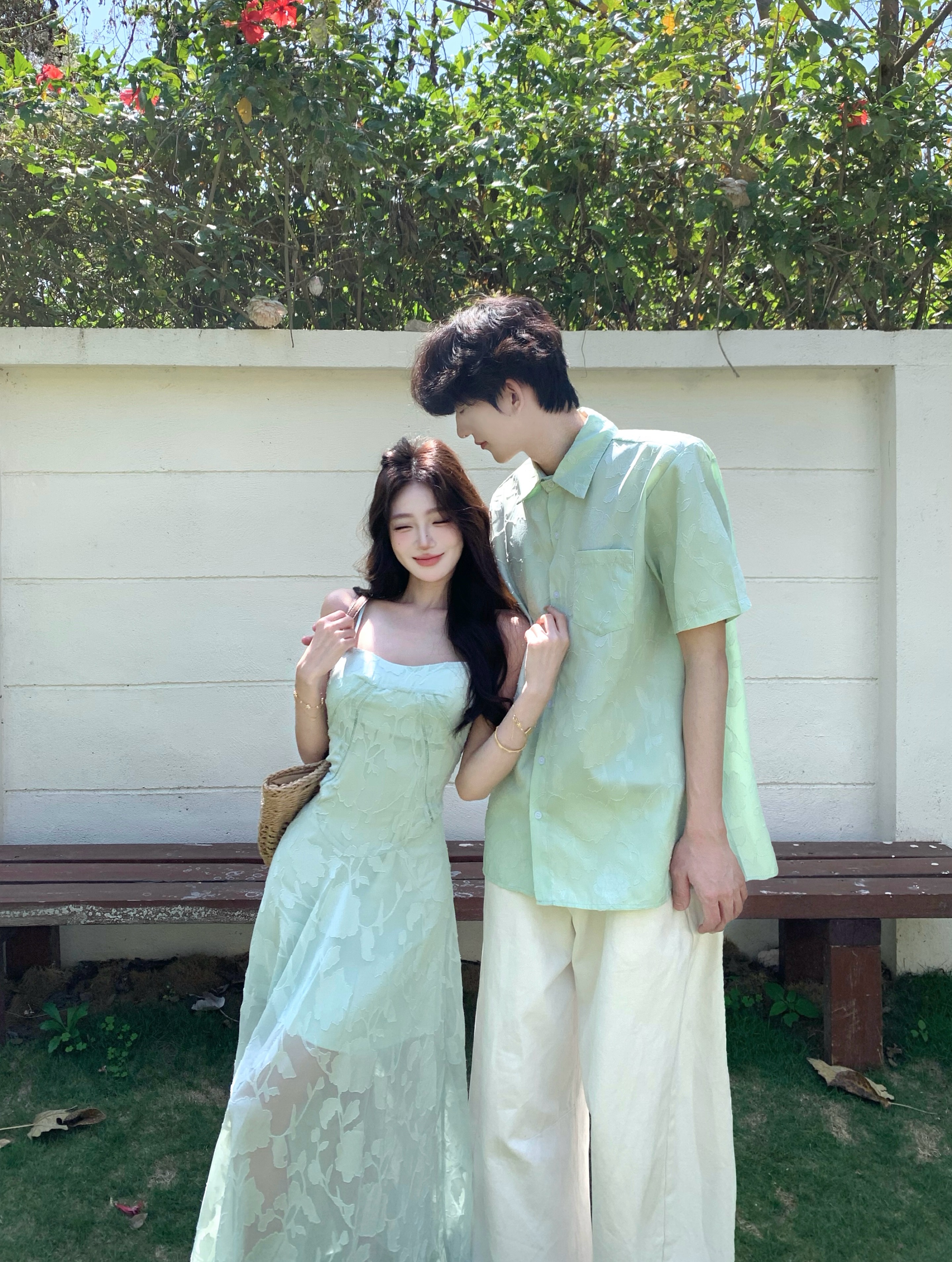 실사 해변가 휴가 바람 녹색 슬립 드레스 허리 수축 슬림해 보이는 A라인 스커트 롱 스커트 커플룩