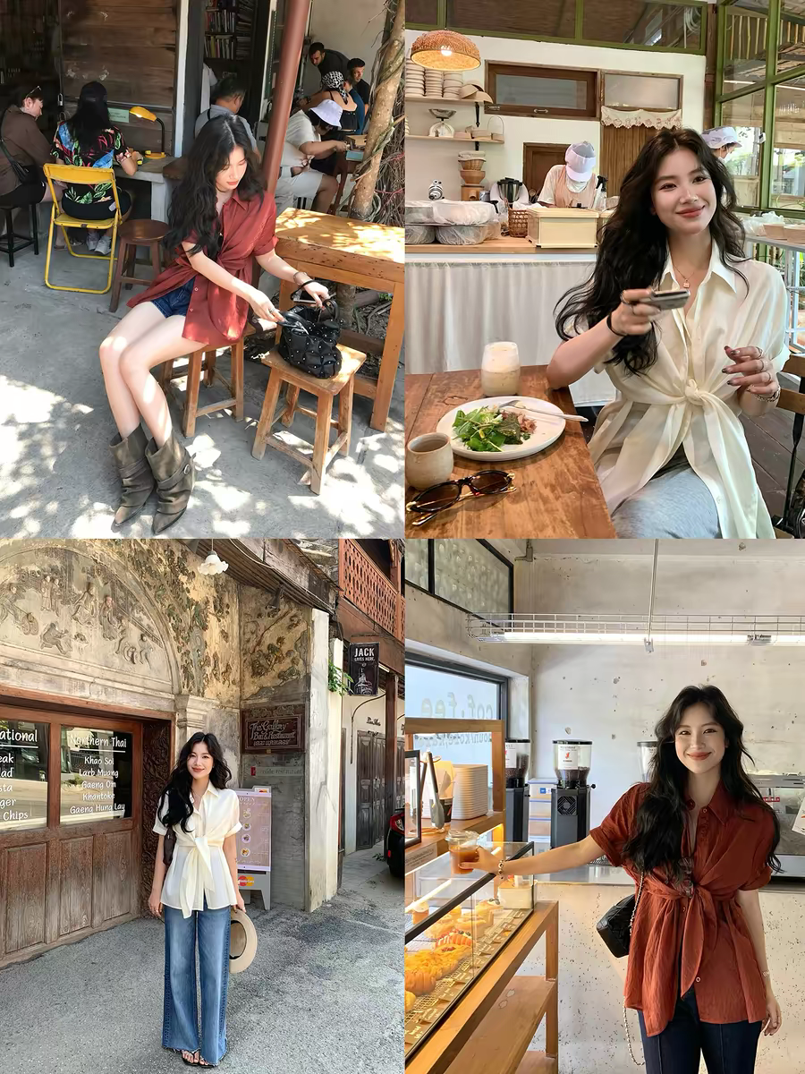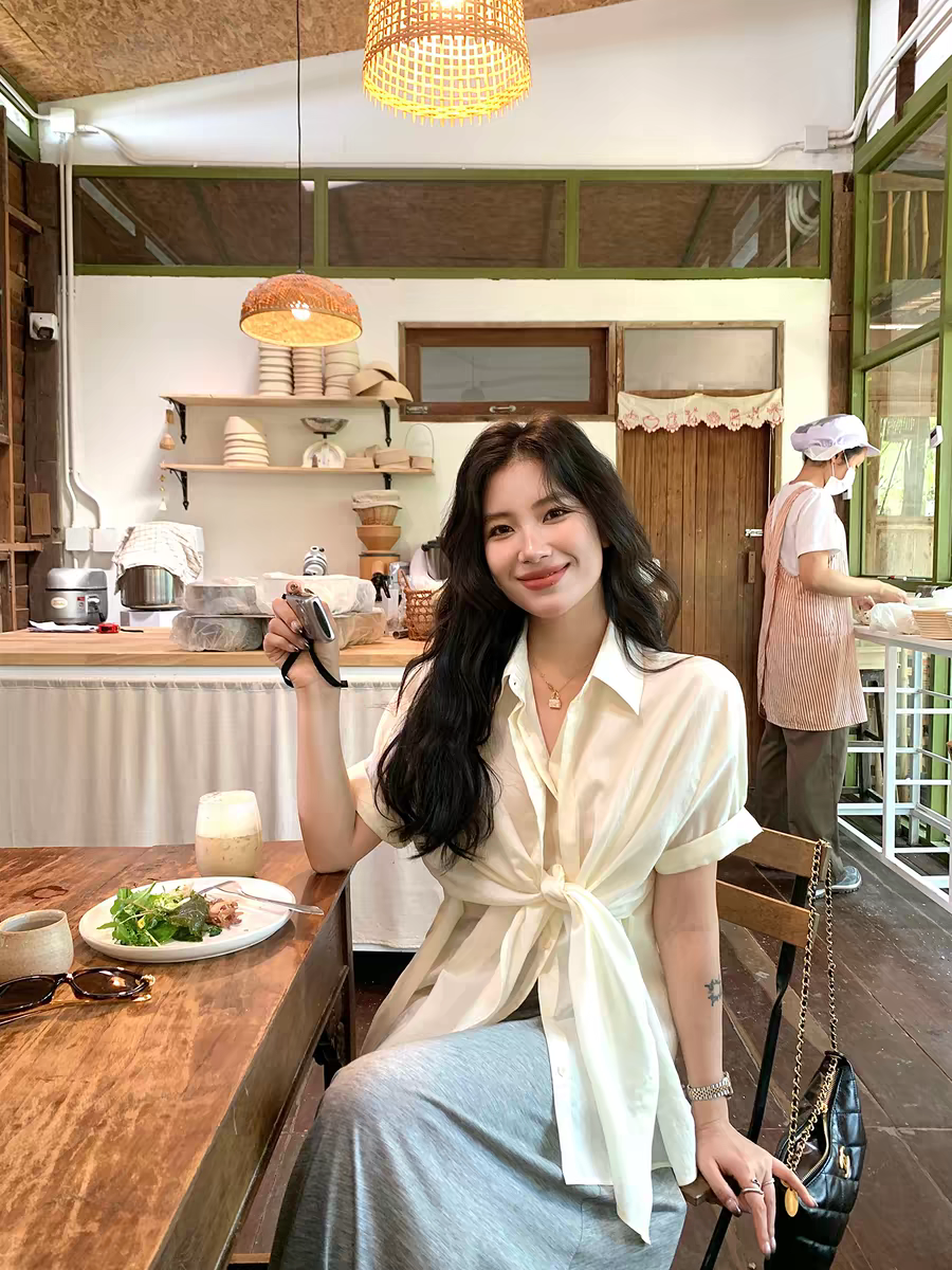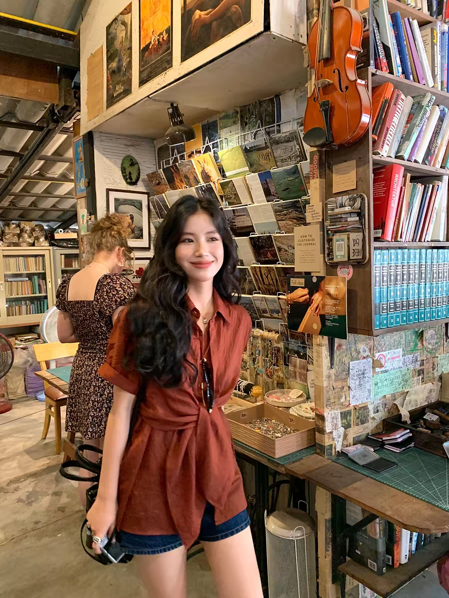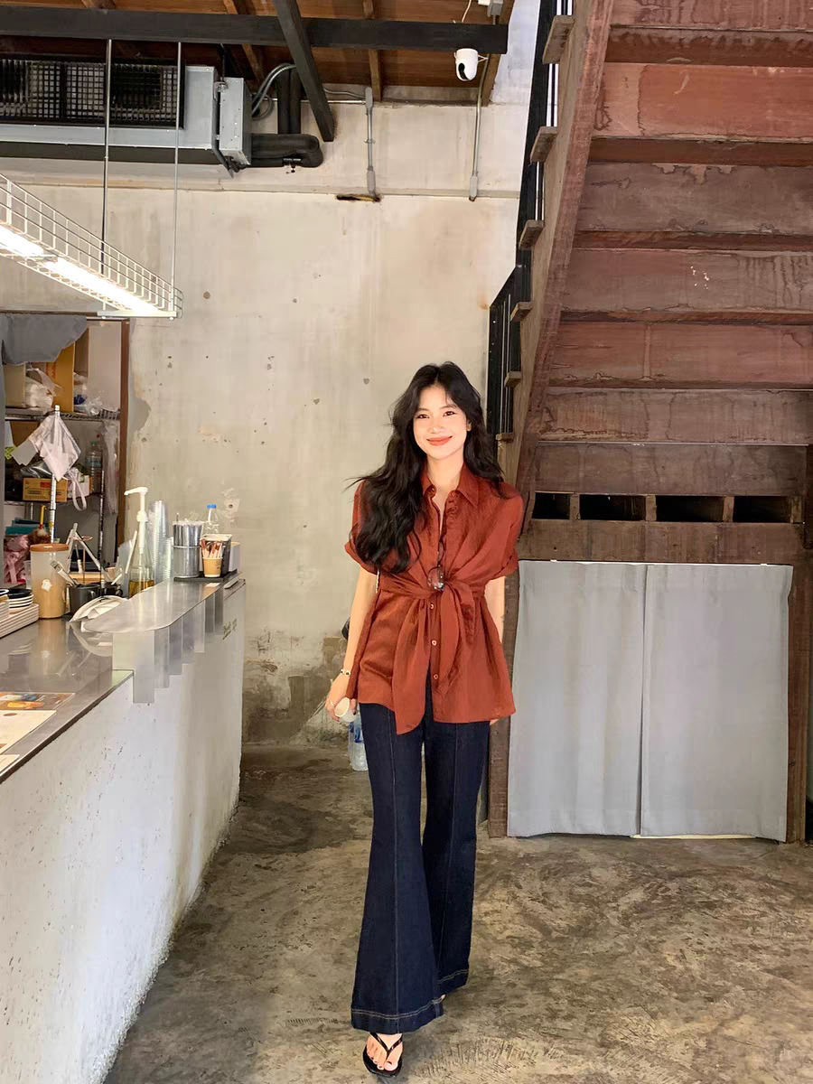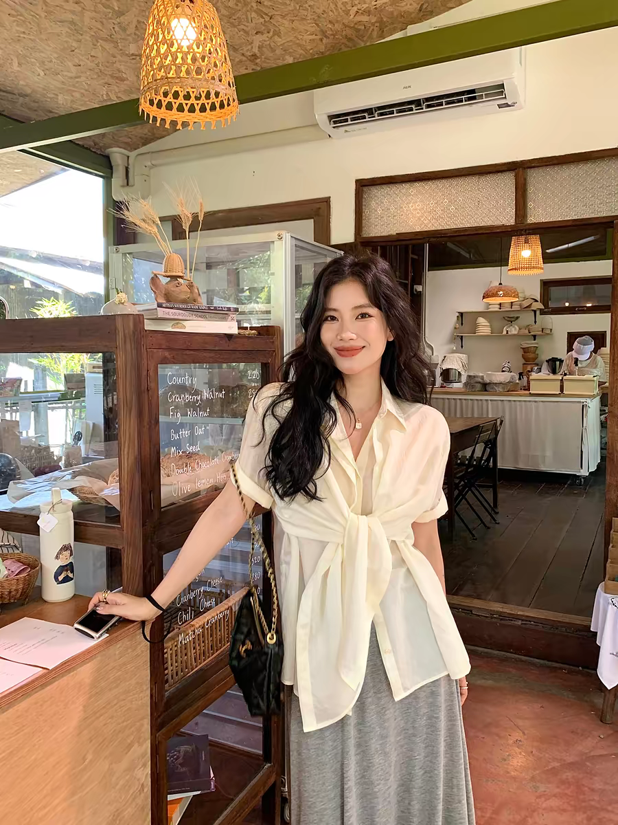 파란색 디스플레이 화이트 허리 수축 스트랩 디자인 센스 폴로 칼라 맨위 2026 봄 여성 의류 새로운 폴로 칼라 외국 가스 셔츠 트렌디