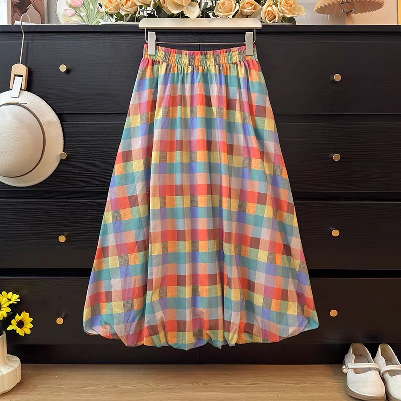 도파민 달콤함 색상 체크무늬 꽃밭 반신 스커트 여성 봄 2026 밴딩 하이웨이스트 슬림해 보이는 한 마디 빅 플레어 스커트