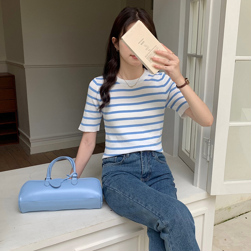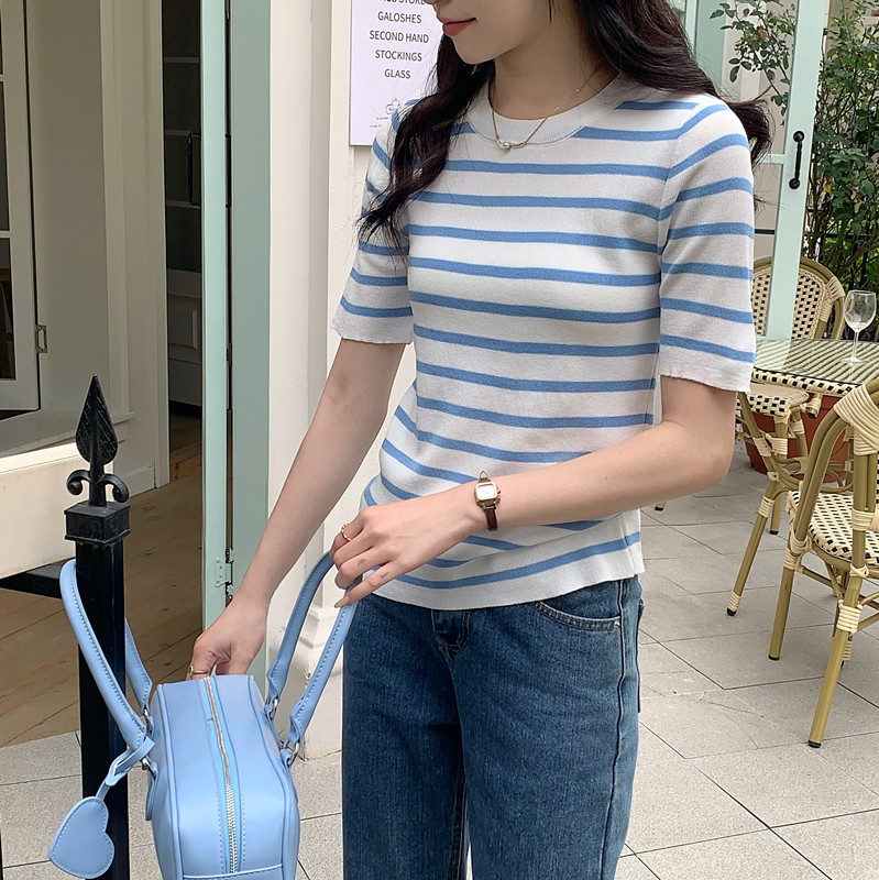 장 수렴성의 수렴성의 25ss 해안선 클래식 해혼 스트라이프 뽕나무 누에 실크 혼방 니트 스웨터