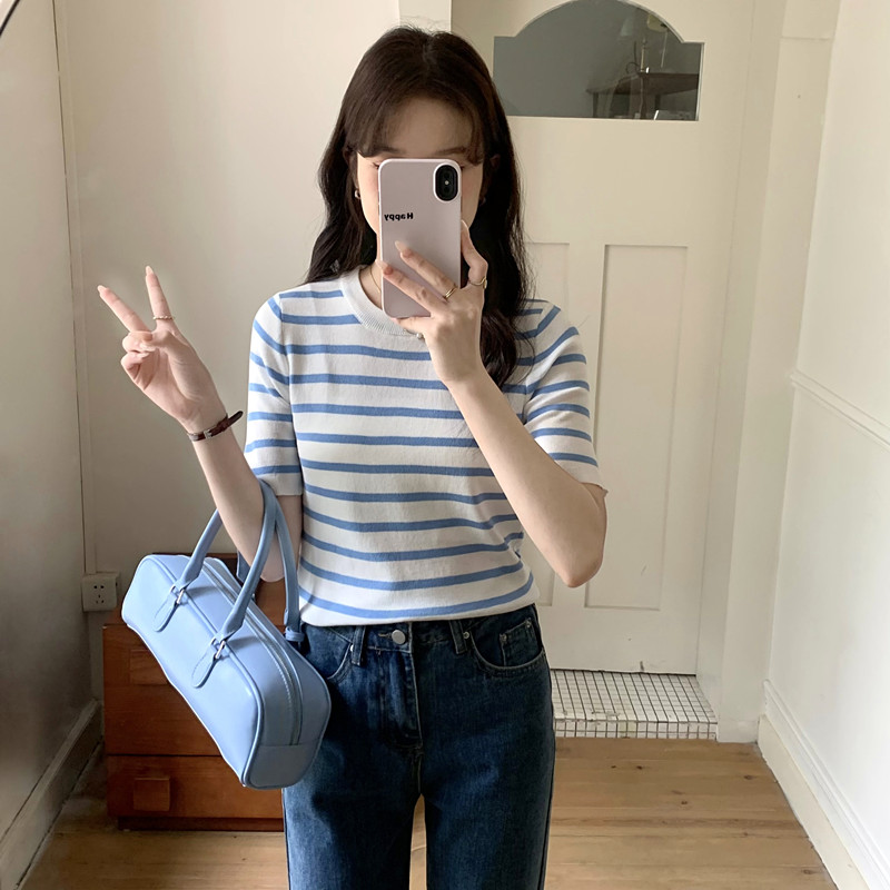 배색 V넥 얼음 실크 반팔 니트 스웨터 여성 여름 얇은 스타일 핫걸 허리 수축 티셔츠 한 부서 고급 센스 유럽 상품 맨위