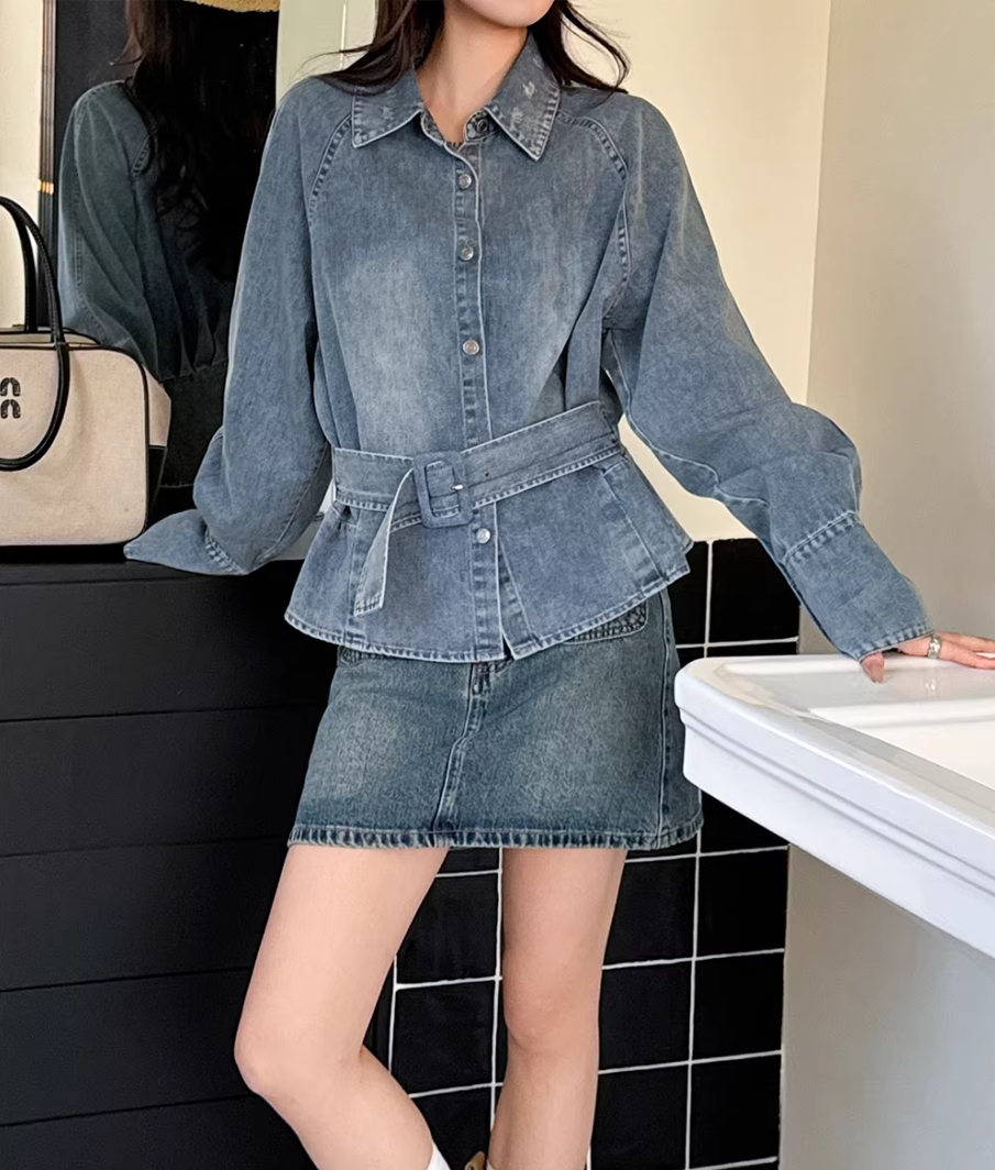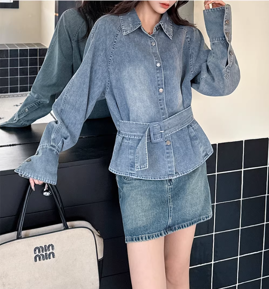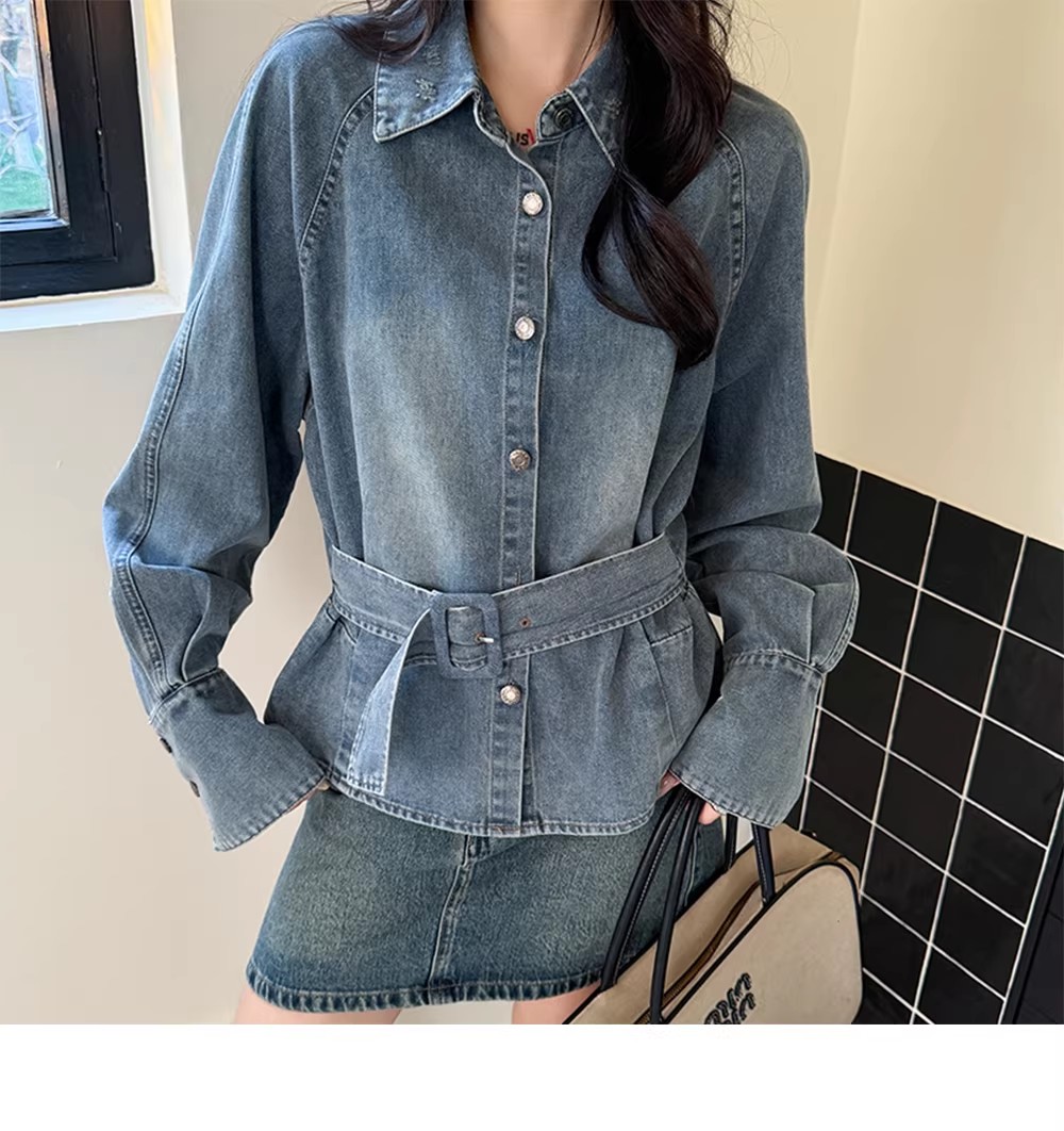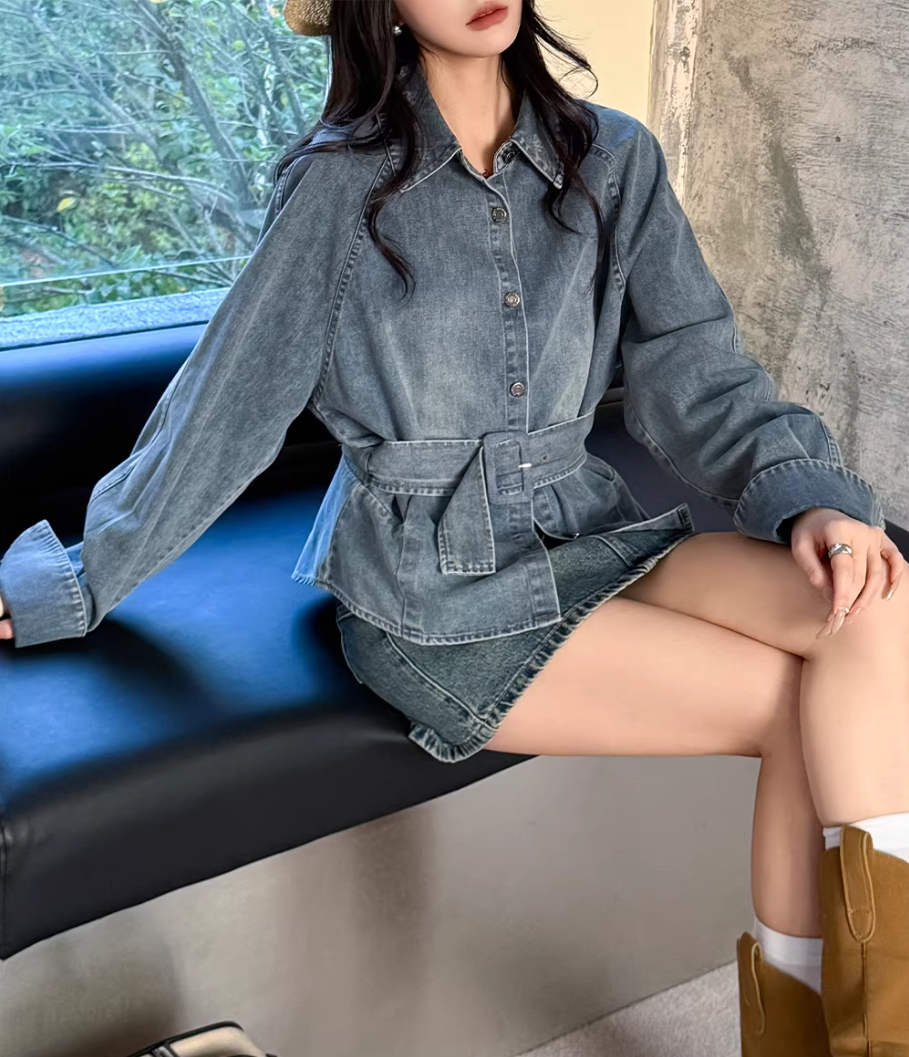 레트로 데님 여성 셔츠 허리 수축 맨위 여성 2026 이른 봄 디자인 센스 벨트 슬림해 보이는 외국 가스 캐주얼 재킷