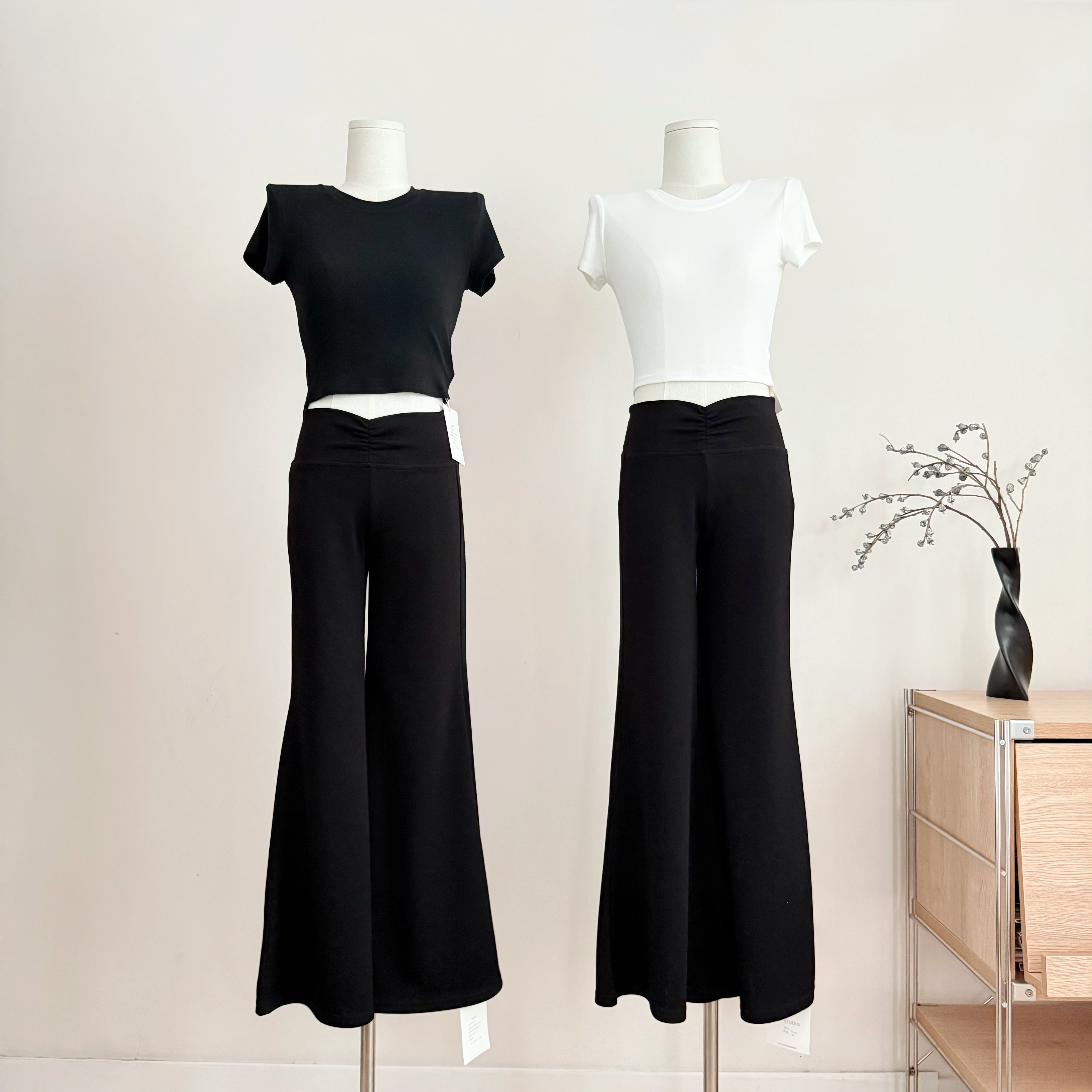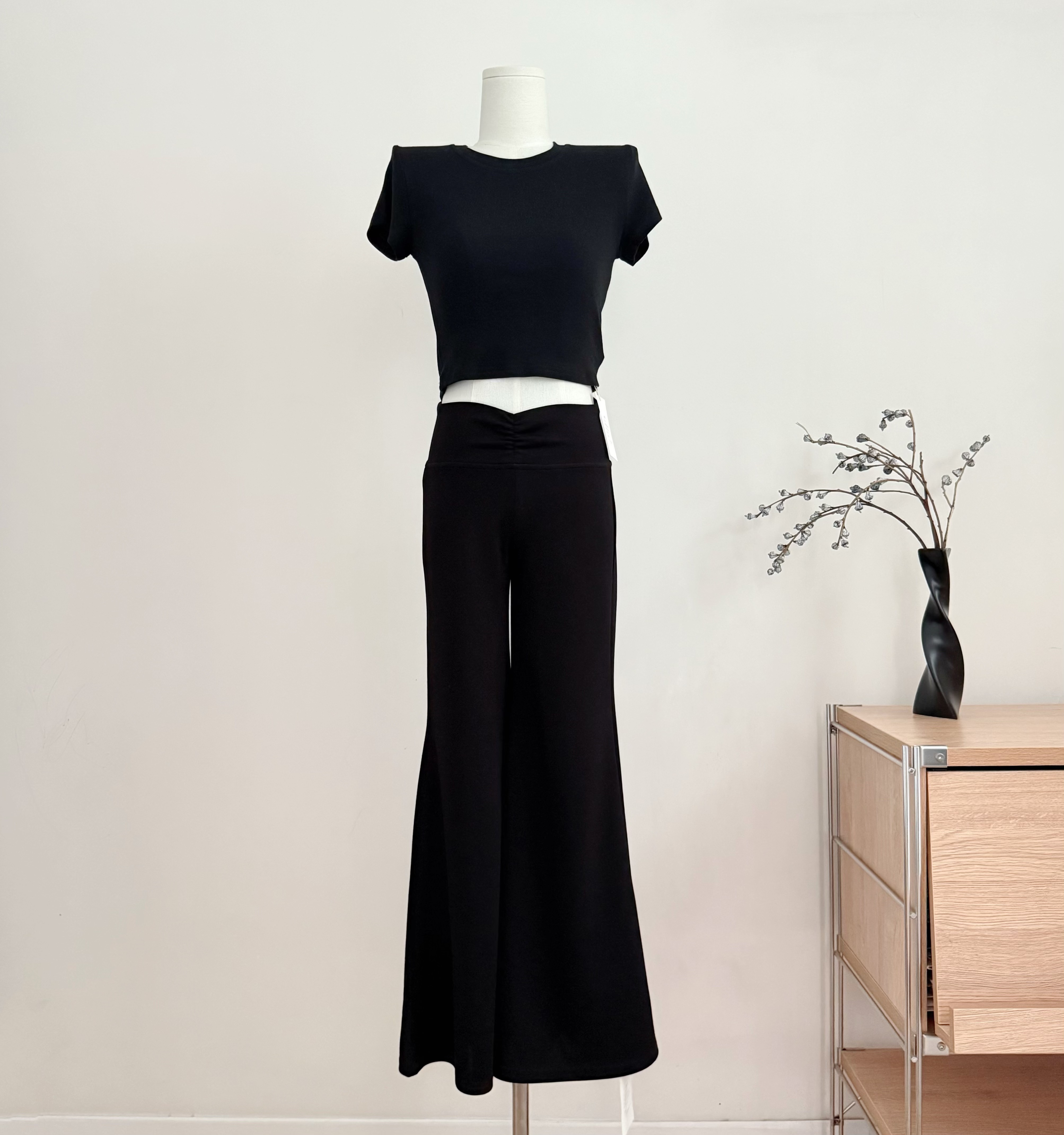 f project 진짜 착용 지배 오리지널 펌프 Pleat v 허리 긴 바지 느긋한 도루 센스 요가 부츠컷 캐주얼 바지 여성