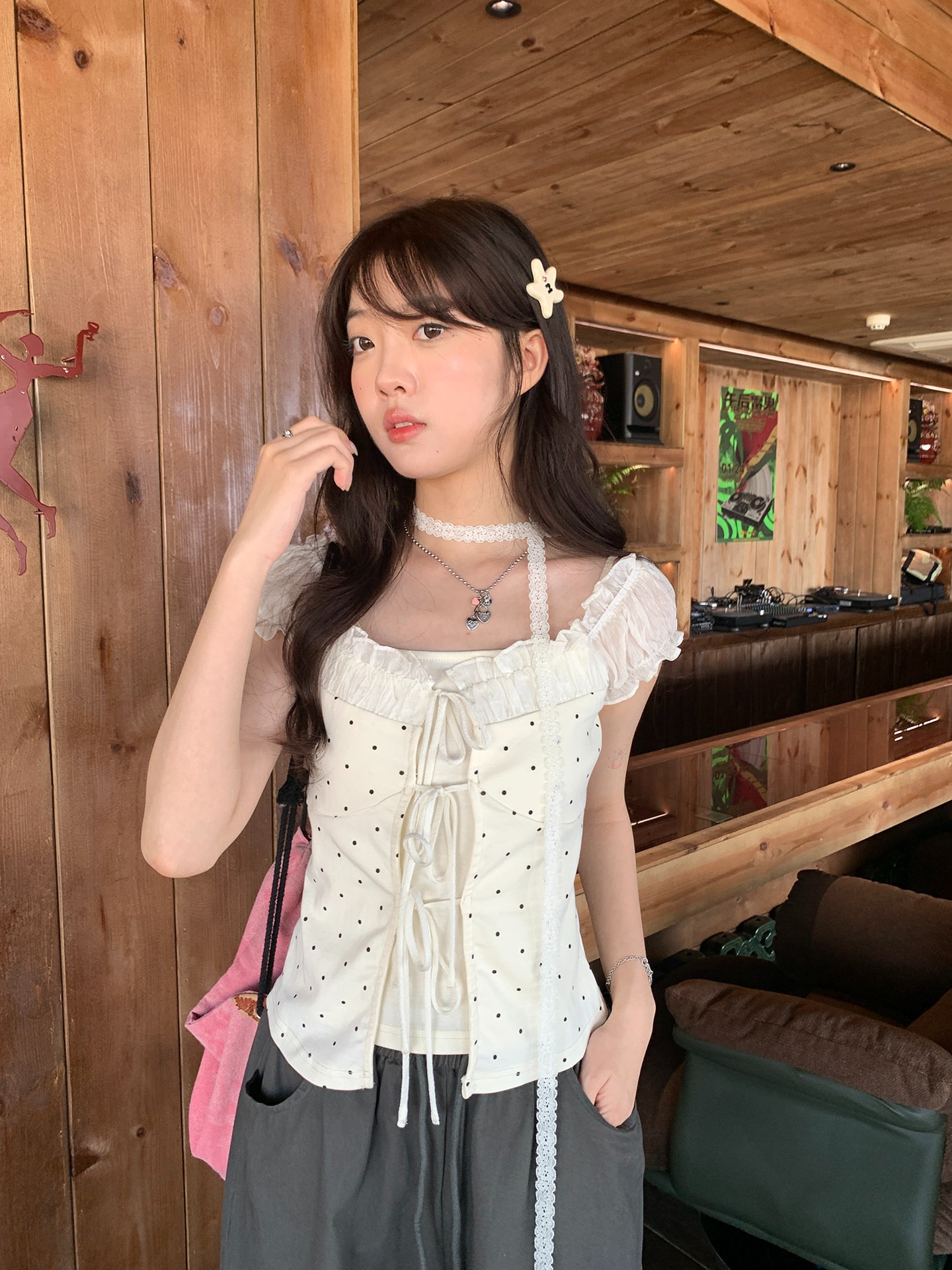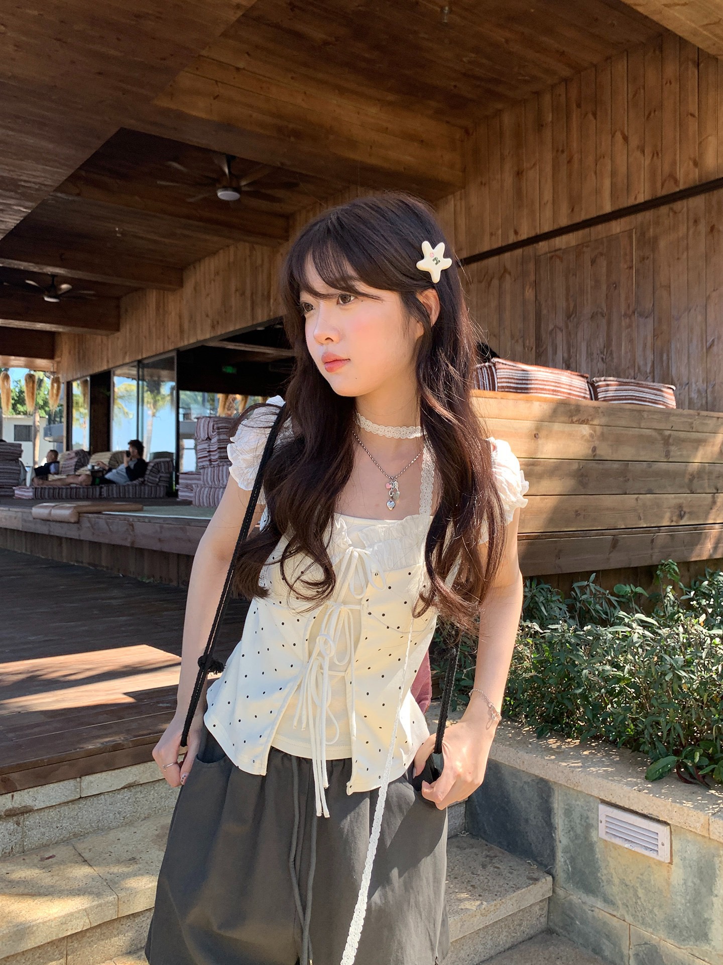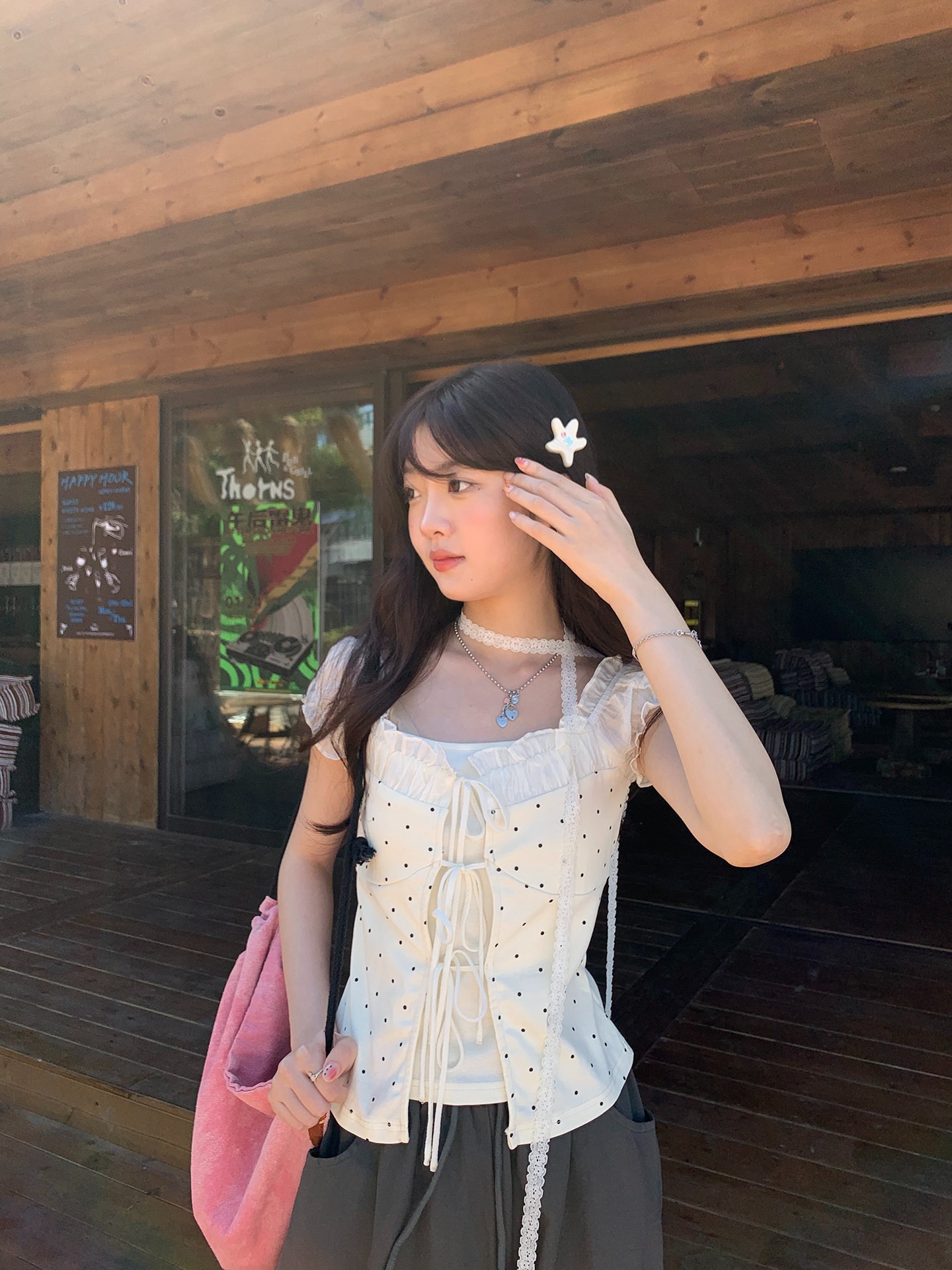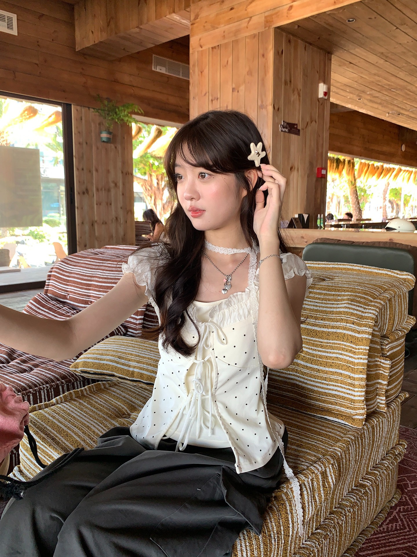 달콤한 스타일 화이트 나비 매듭 스트랩 허리 수축 슬림해 보이는 튜브탑 조끼 여성 여름 프랑스식 프릴 Chic 맨위