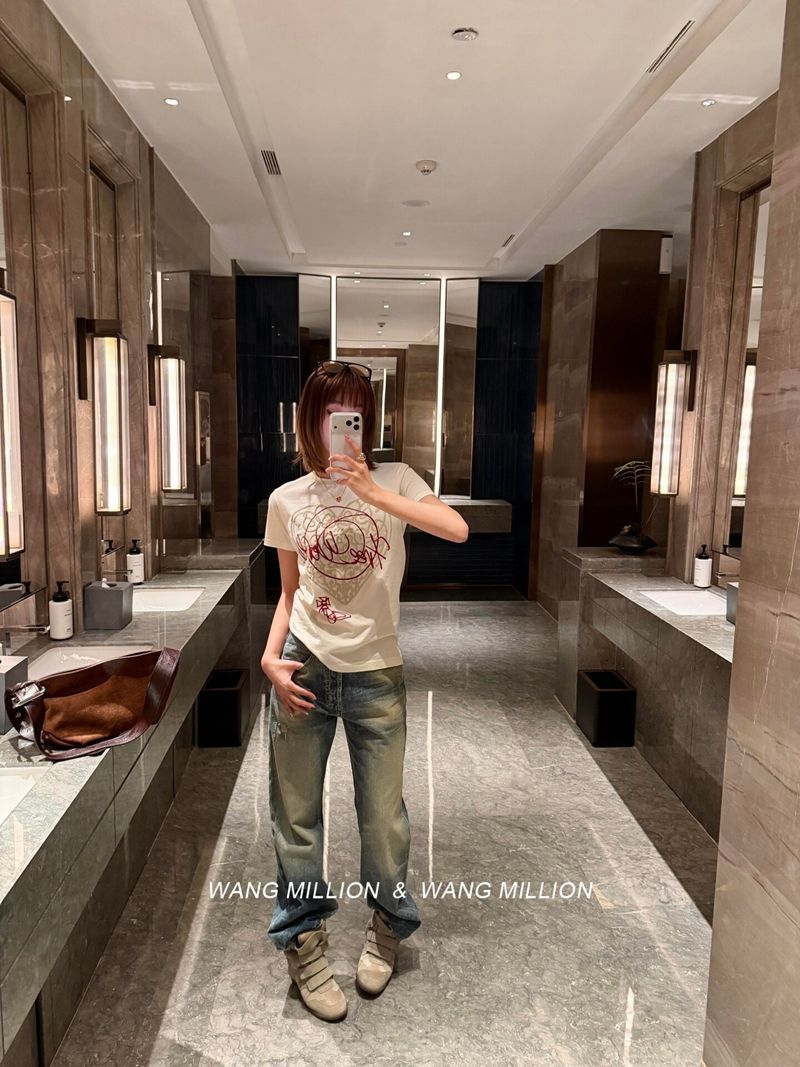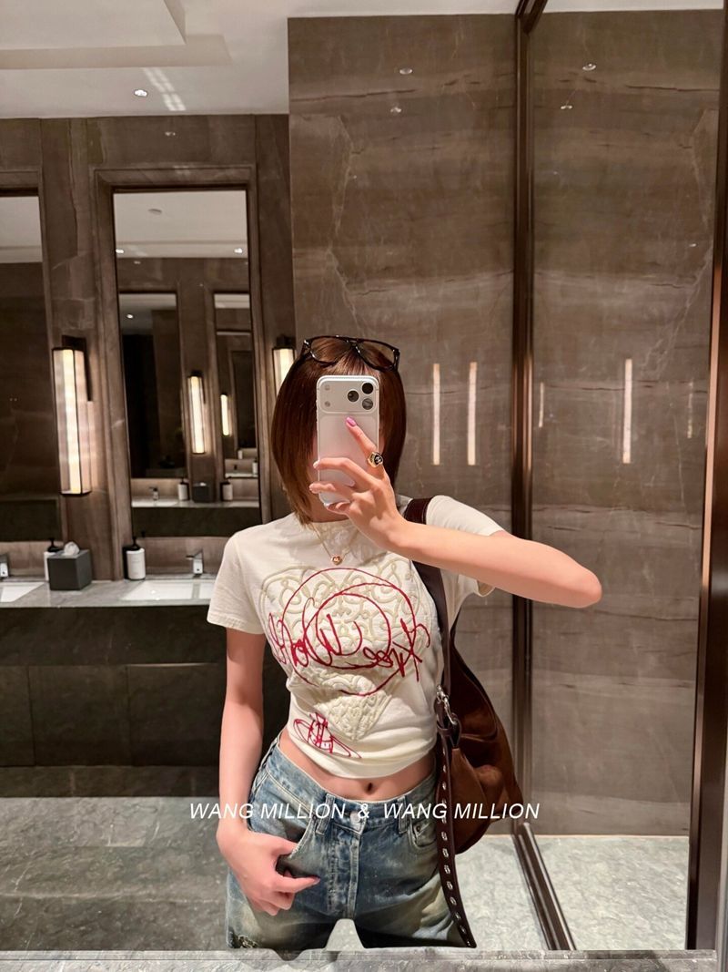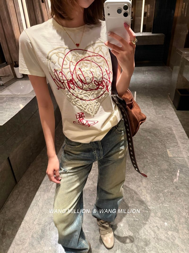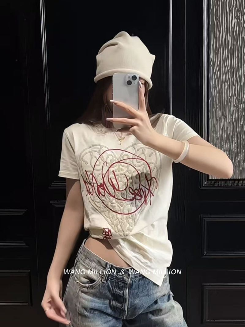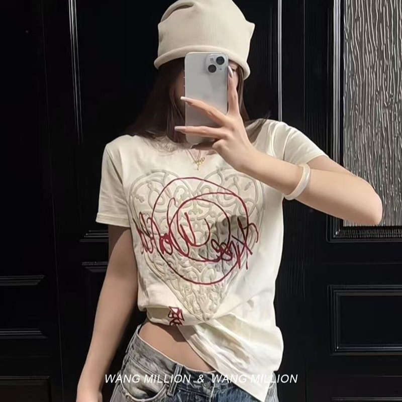 210 그램 40 순면 포밍 인쇄 하트 라운드 넥 티셔츠 여성 작은 대중 디자인 센스 반팔 맨위