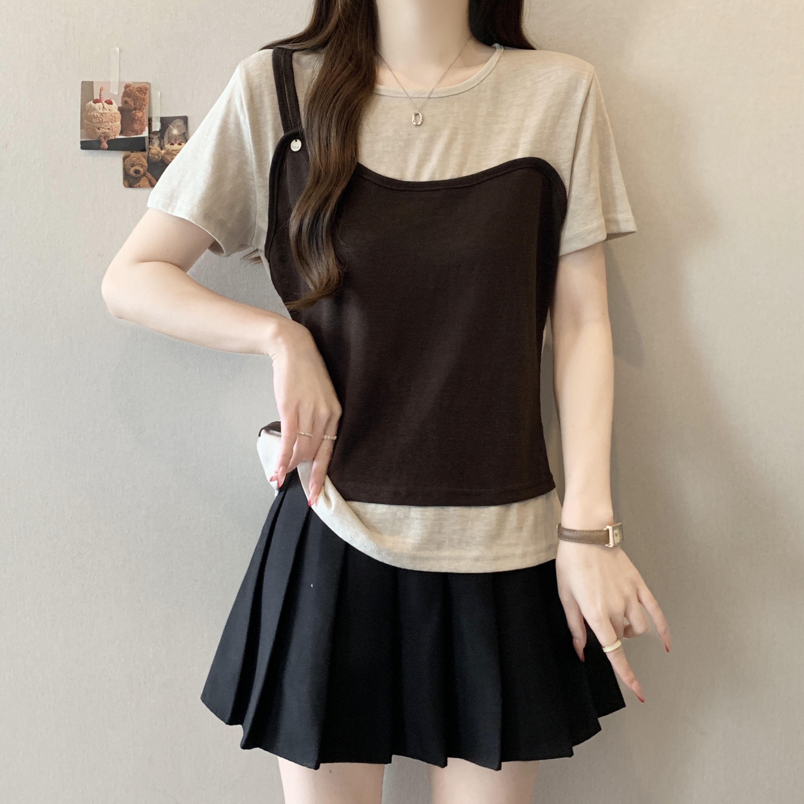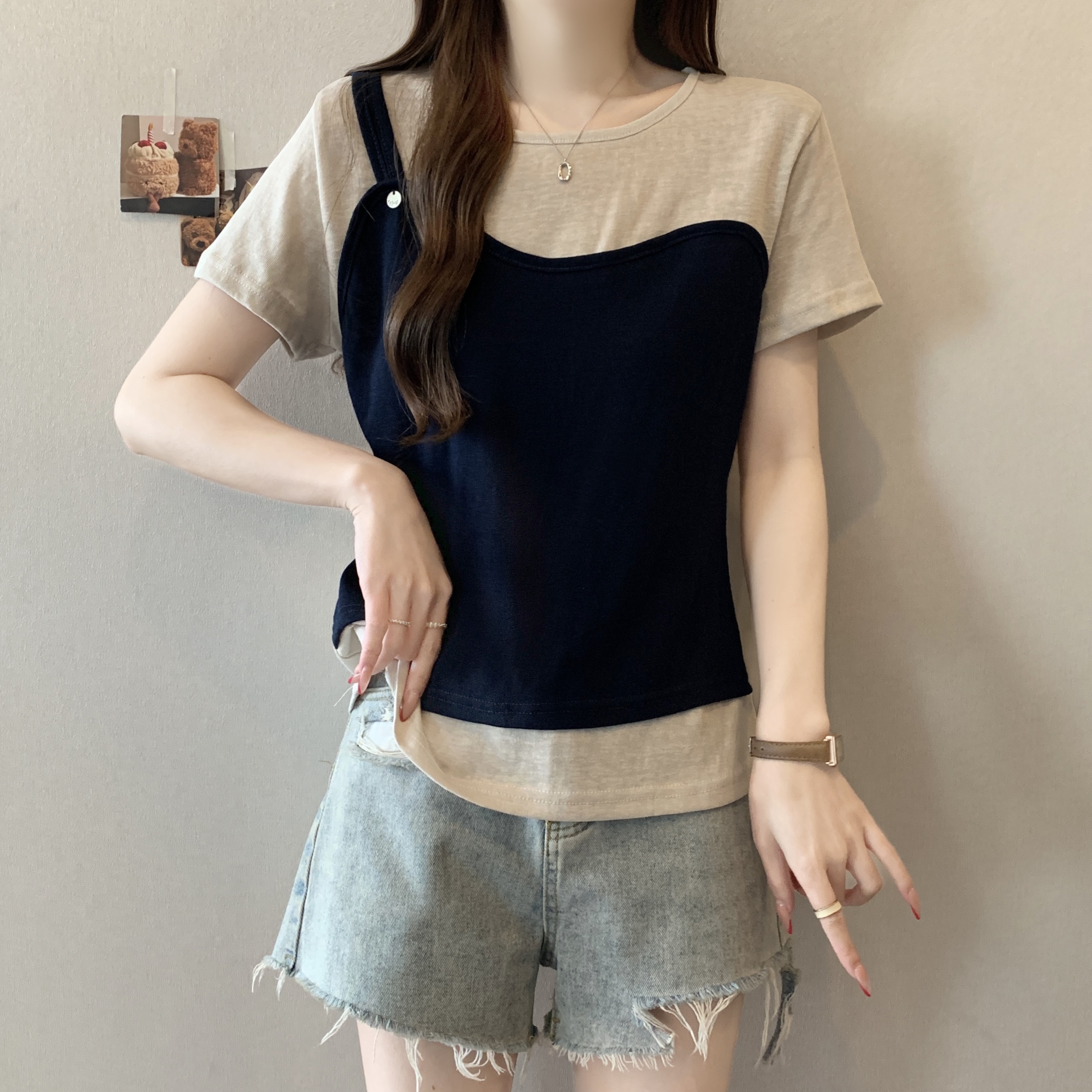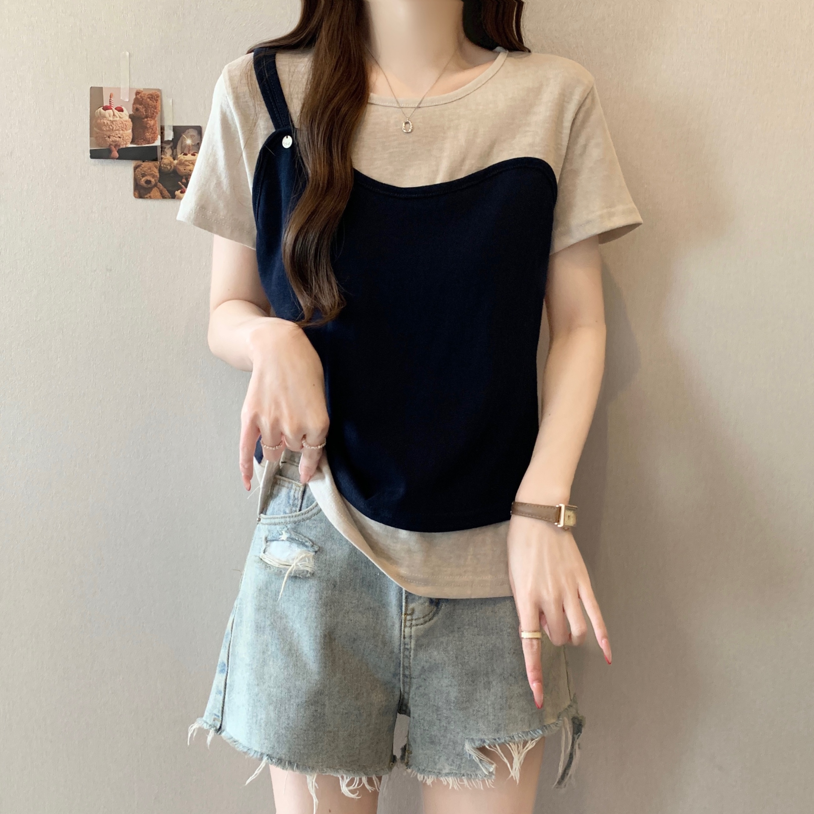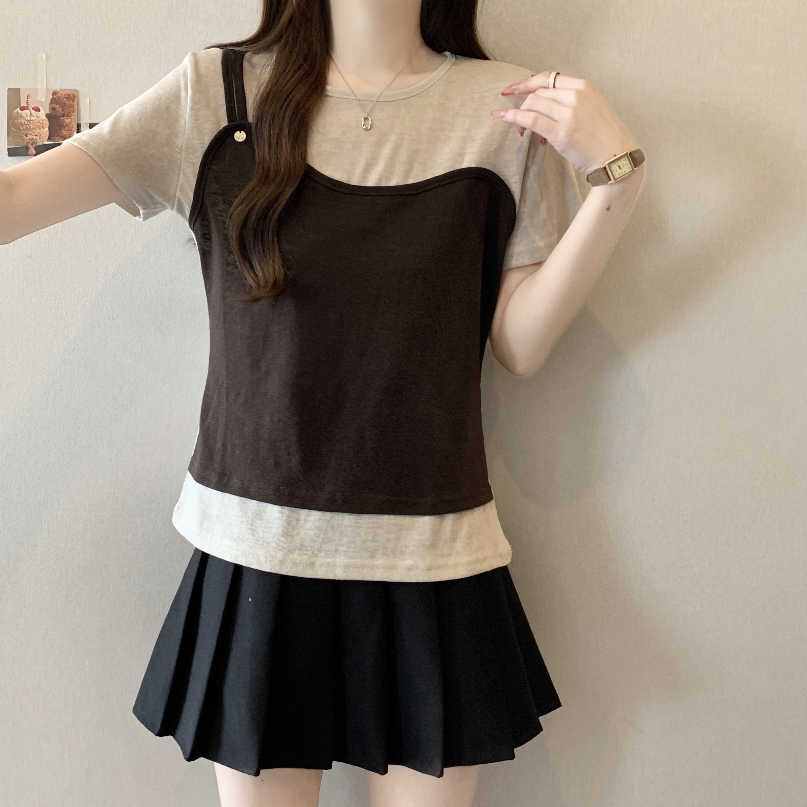 빅 사이즈 불규칙 패치워크 페이크 레이어드 반팔 티셔츠 여성 여름 지방 mm 슬림해 보이는 루즈핏 표지 배 라운드 넥 맨위