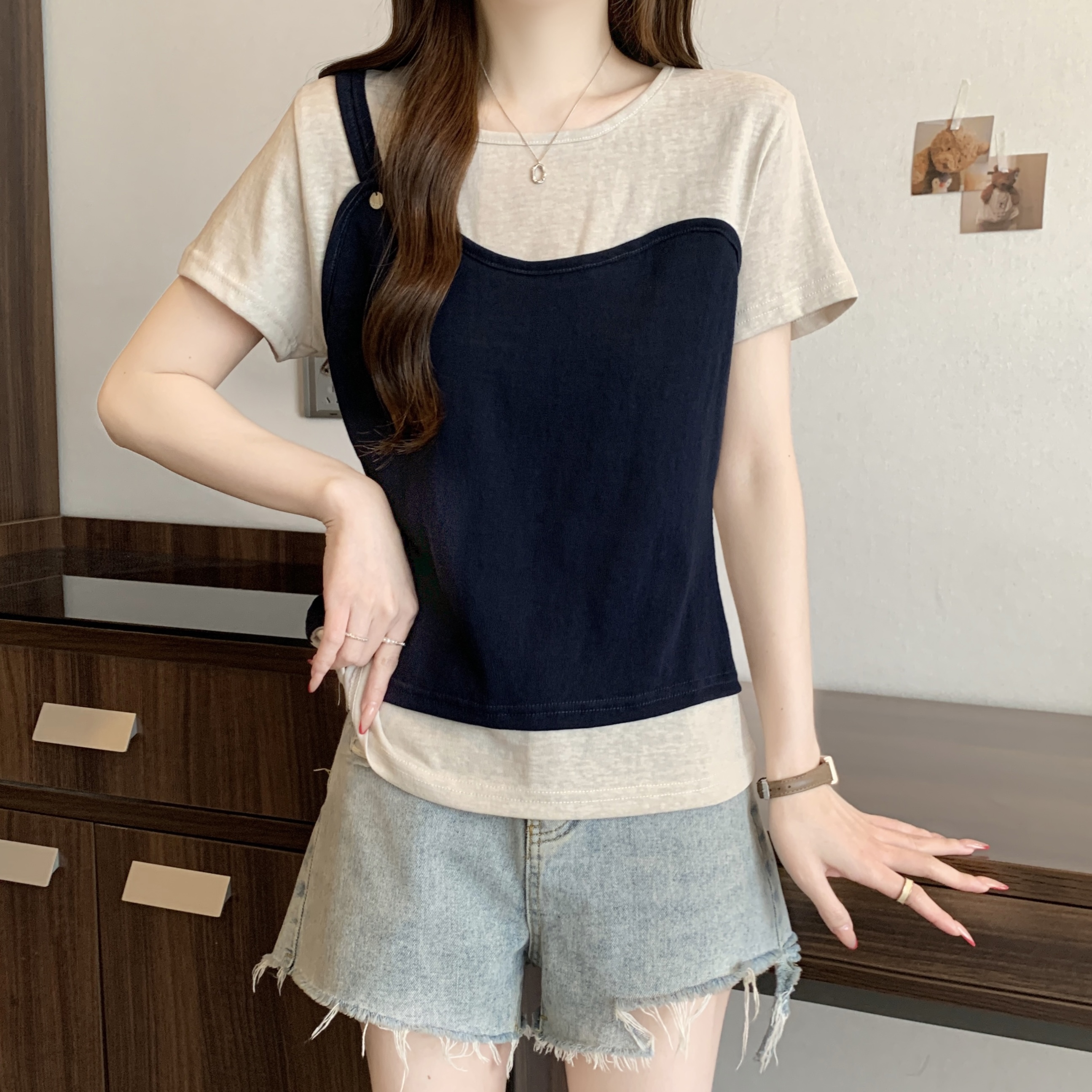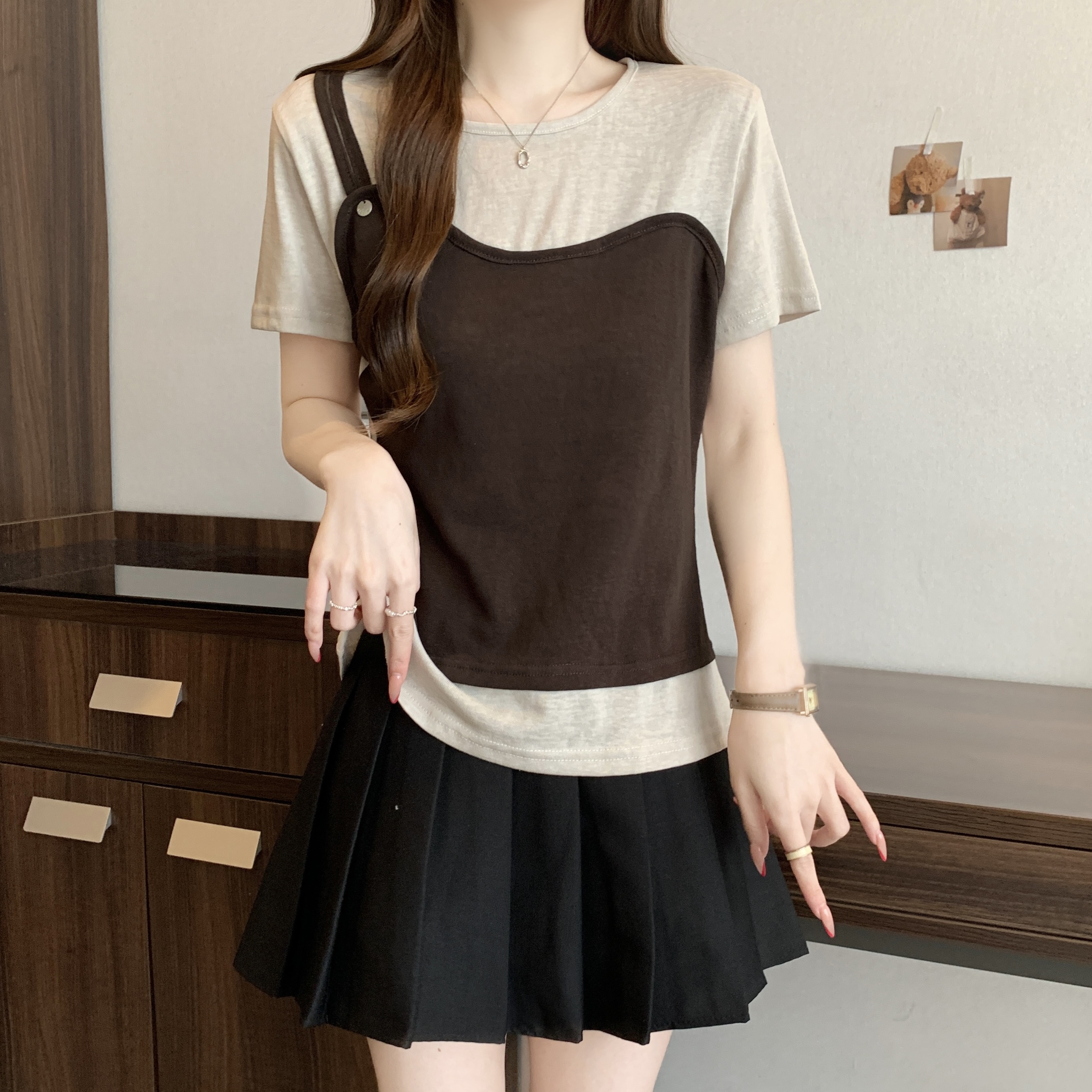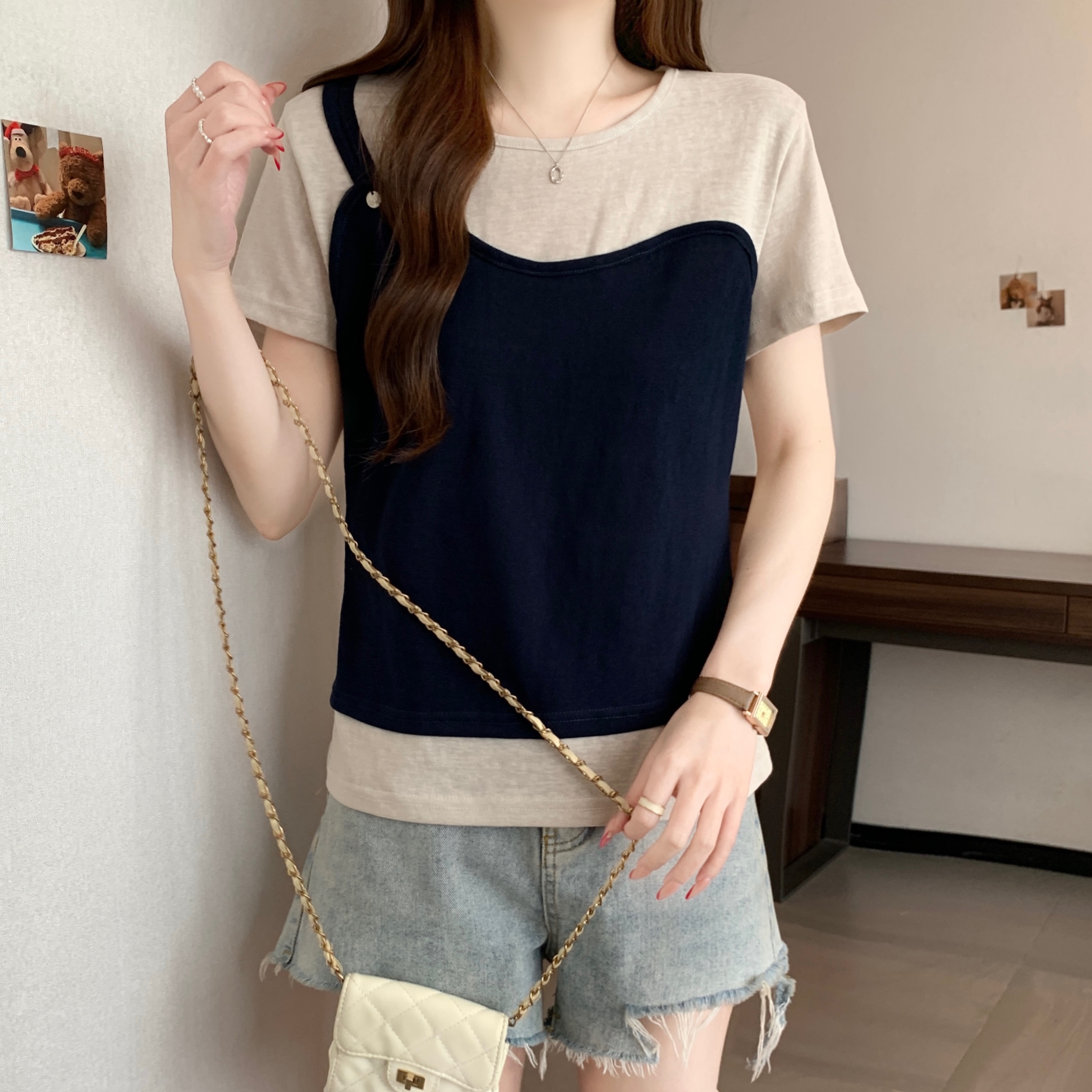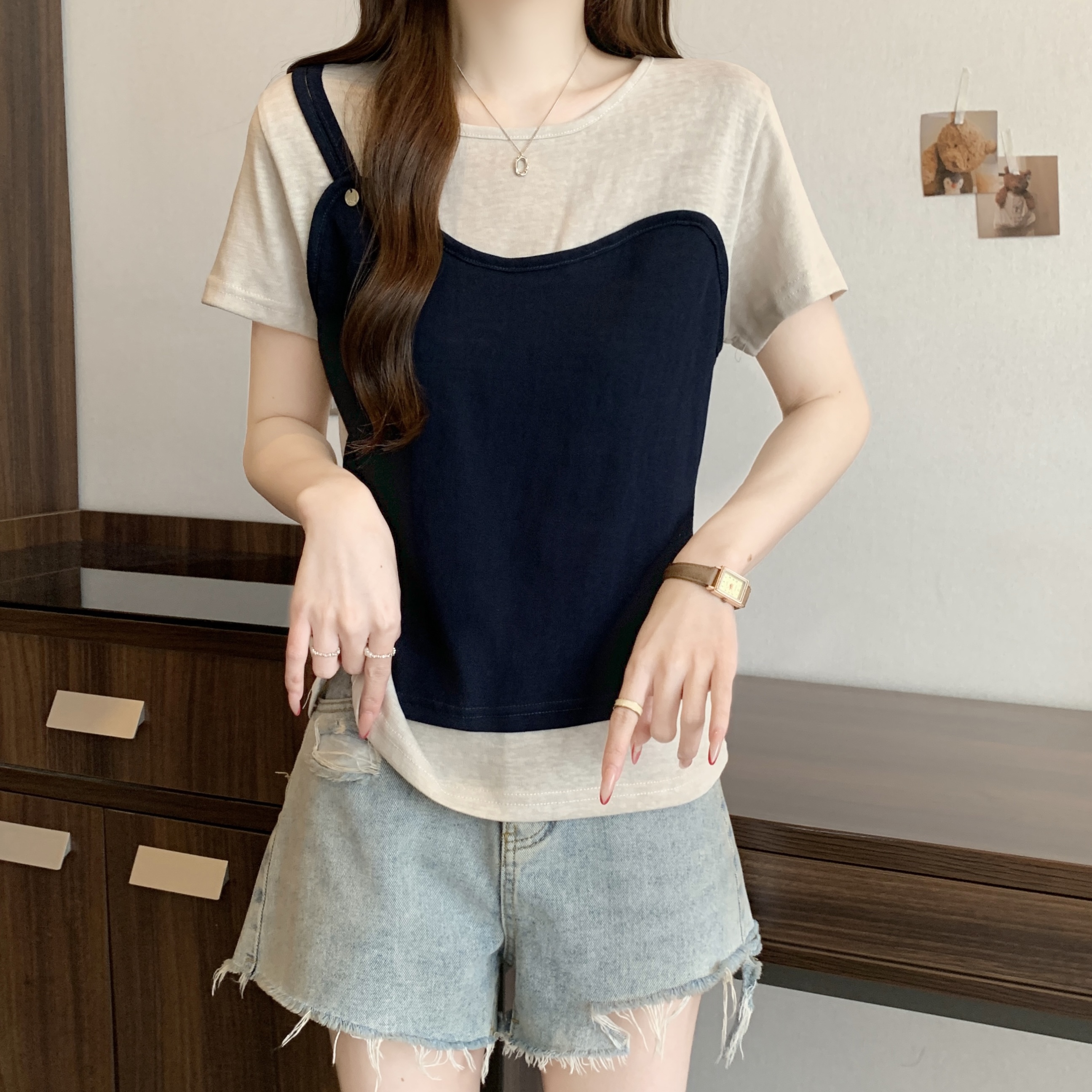 빅 사이즈 불규칙 패치워크 페이크 레이어드 반팔 티셔츠 여성 여름 지방 mm 슬림해 보이는 루즈핏 표지 배 라운드 넥 맨위