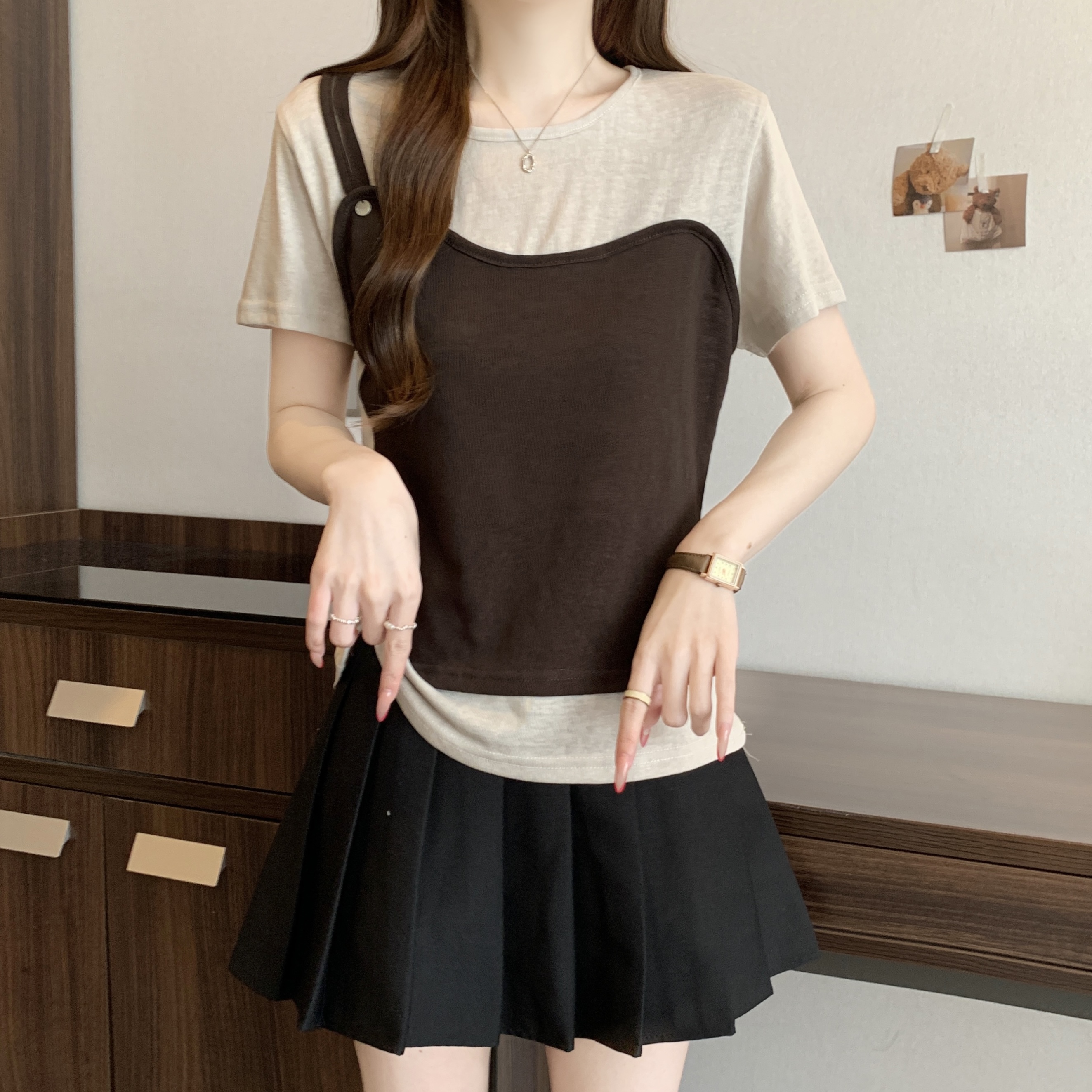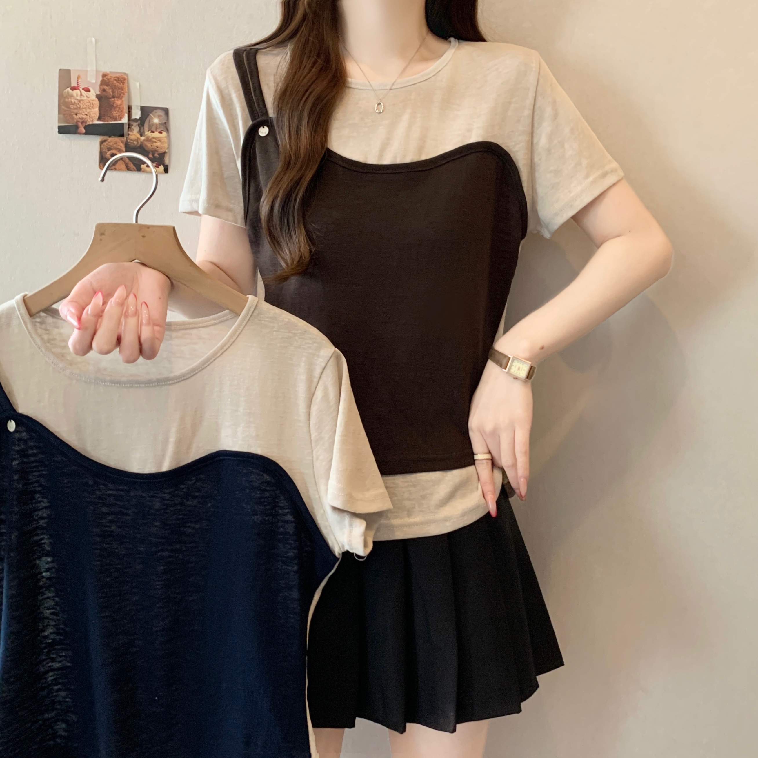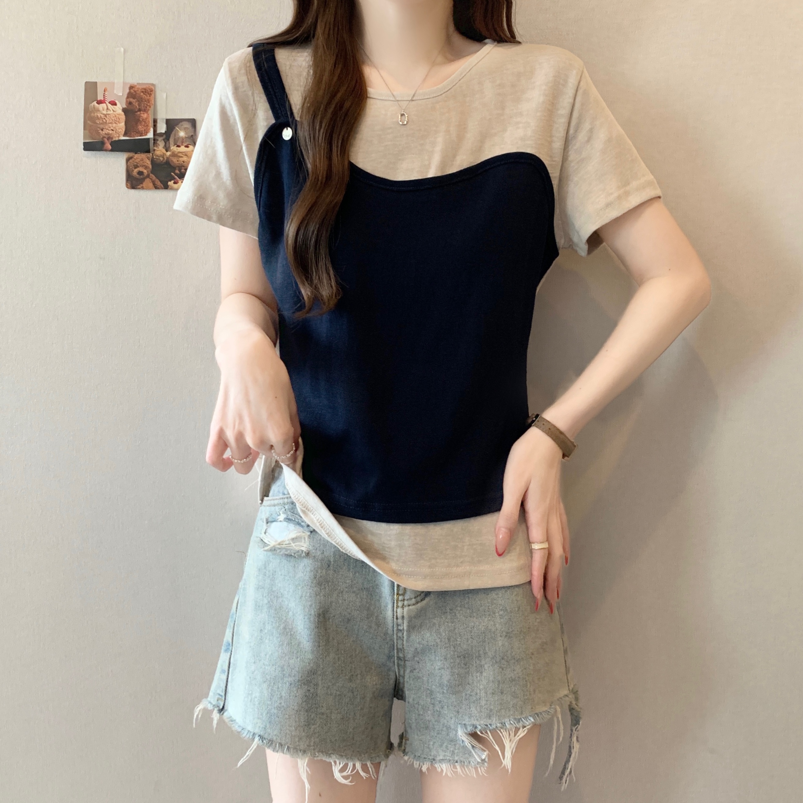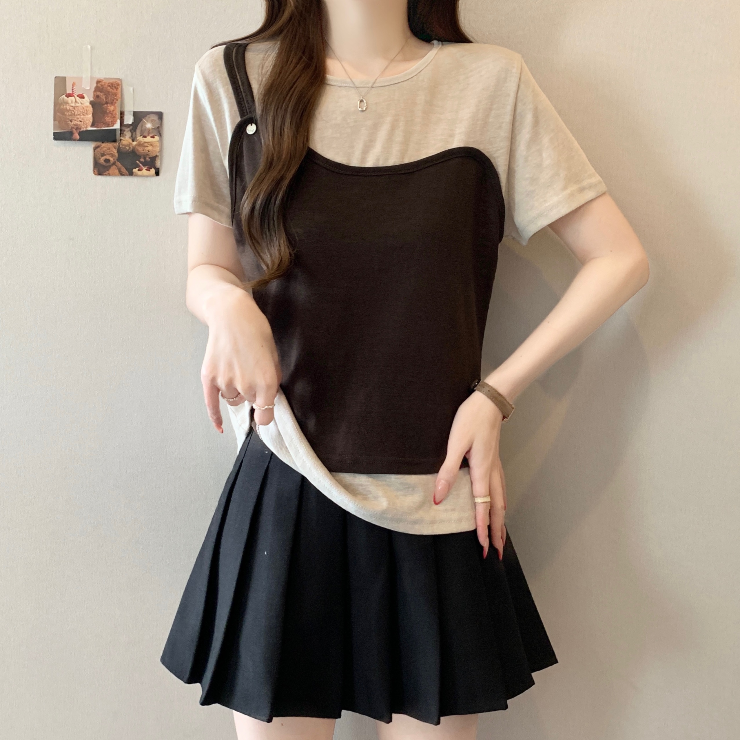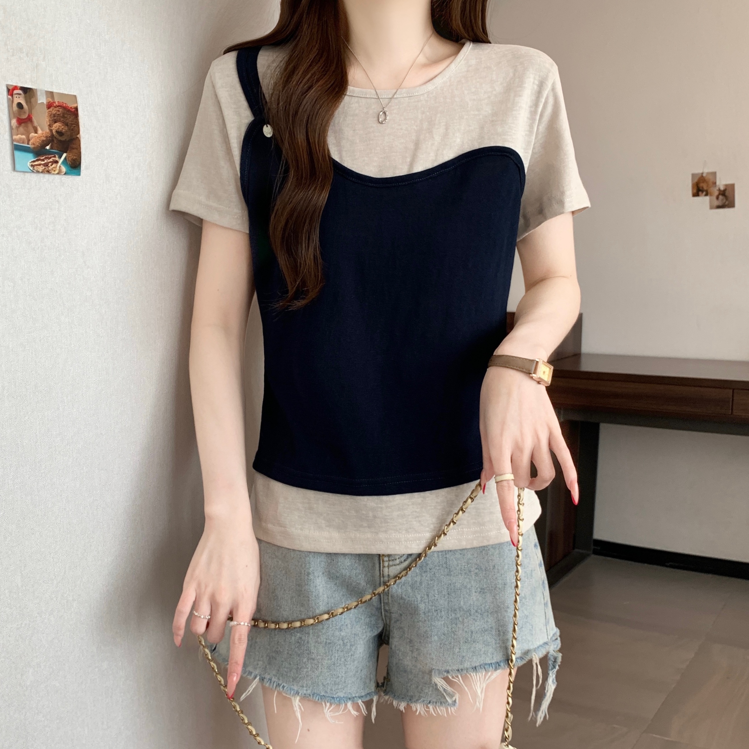 빅 사이즈 불규칙 패치워크 페이크 레이어드 반팔 티셔츠 여성 여름 지방 mm 슬림해 보이는 루즈핏 표지 배 라운드 넥 맨위