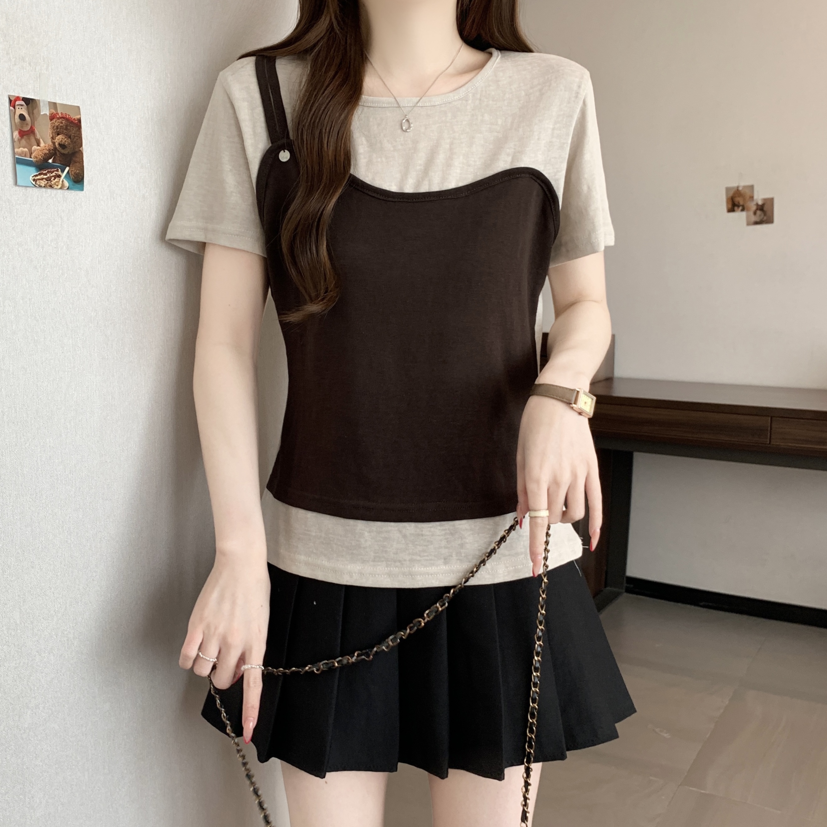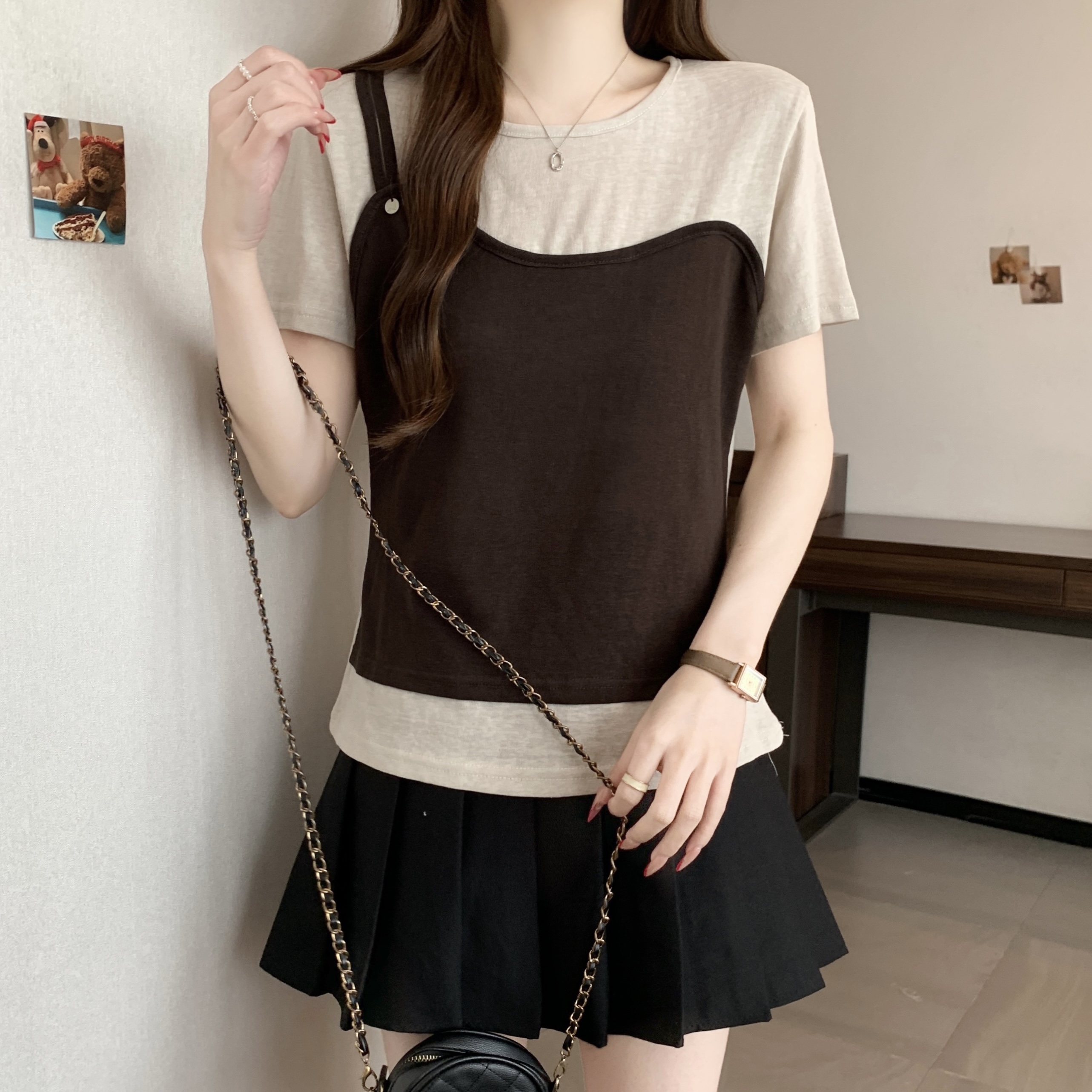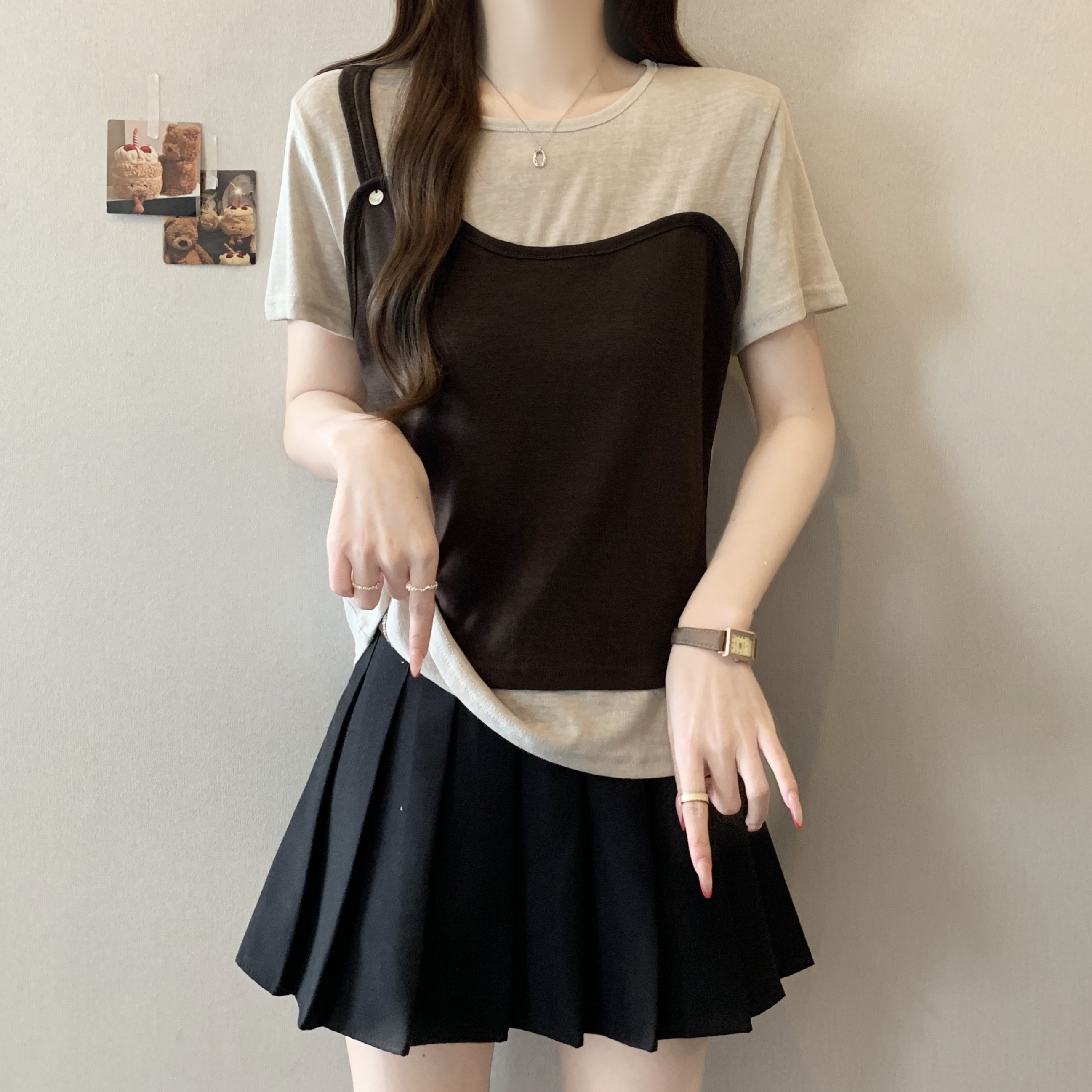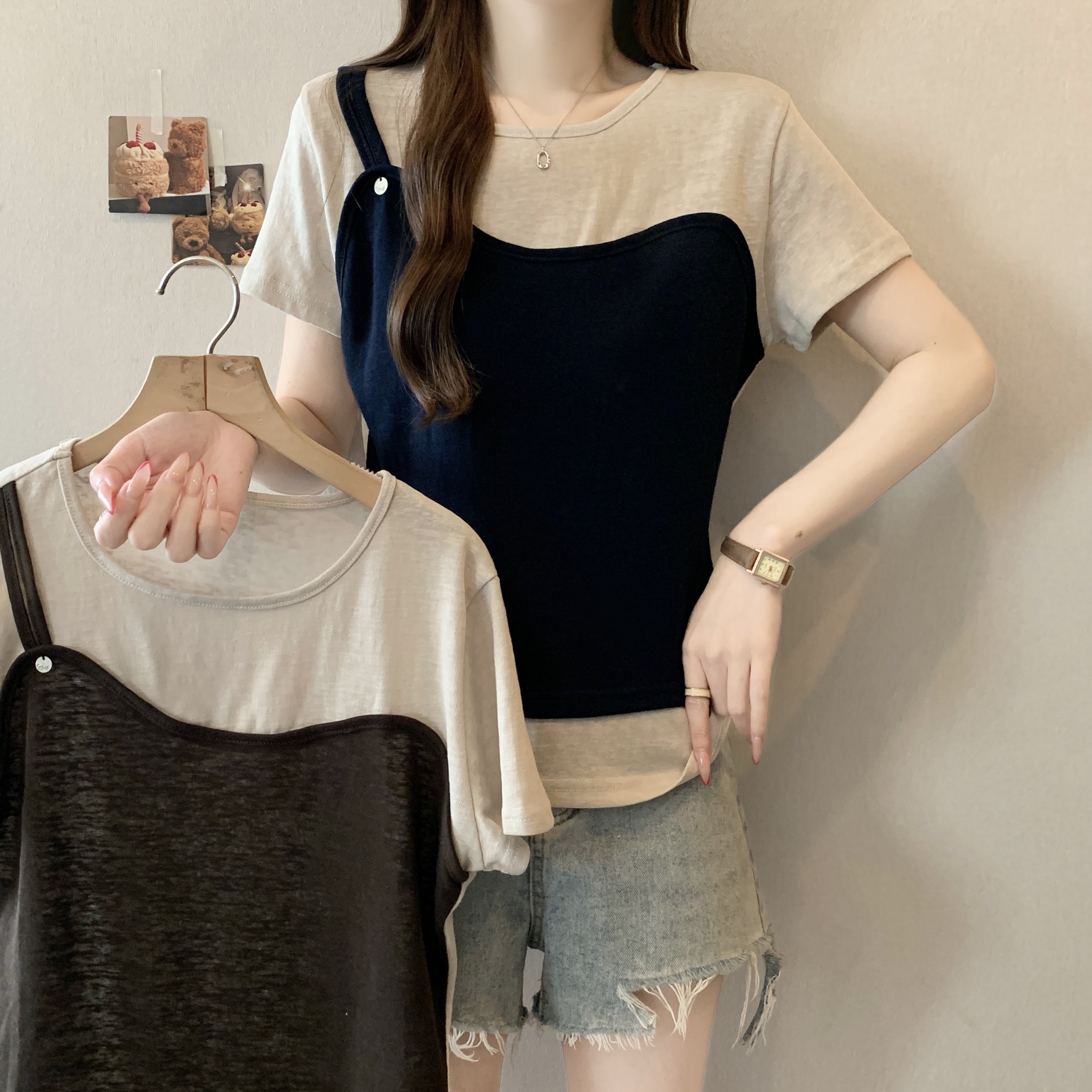 빅 사이즈 불규칙 패치워크 페이크 레이어드 반팔 티셔츠 여성 여름 지방 mm 슬림해 보이는 루즈핏 표지 배 라운드 넥 맨위