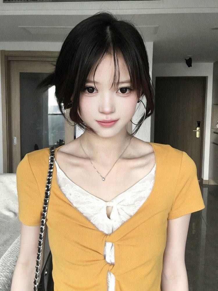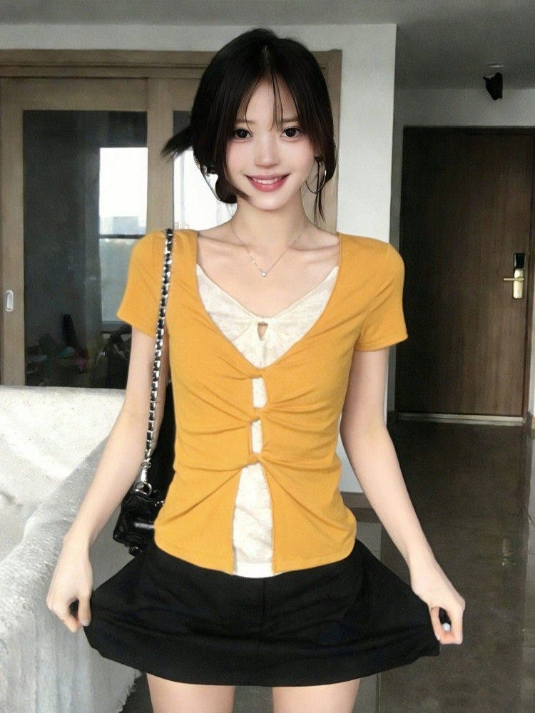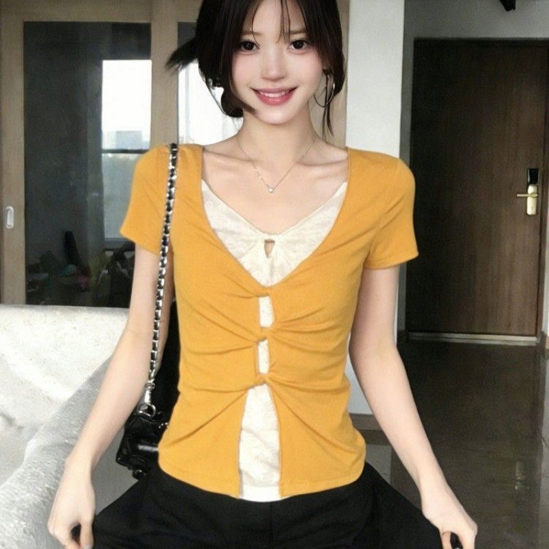 미니멀리즘 한 부서 페이크 레이어드 라운드 넥 반팔 티셔츠 여성 여름 새로운 슬림해 보이는 작은 대중 디자인 센스 숄 맨위 트렌디