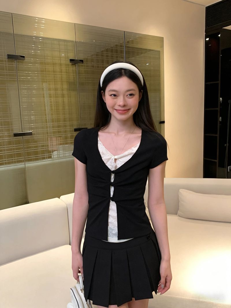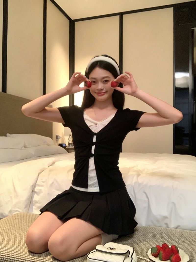해군 칼라 맨위 학원 스타일 세트 여성 여름 디자인 센스 꼬집기 허리 반팔 티셔츠 하이웨이스트 슬림해 보이는 플리츠 미니 스커트