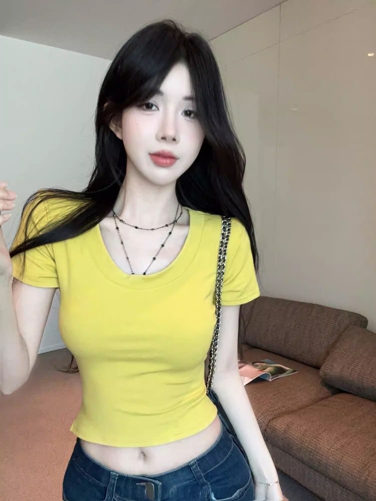 미니멀리즘 한 부서 페이크 레이어드 라운드 넥 반팔 티셔츠 여성 여름 새로운 슬림해 보이는 작은 대중 디자인 센스 숄 맨위 트렌디