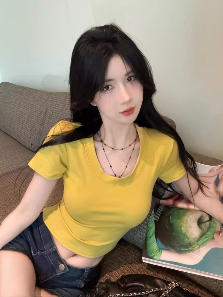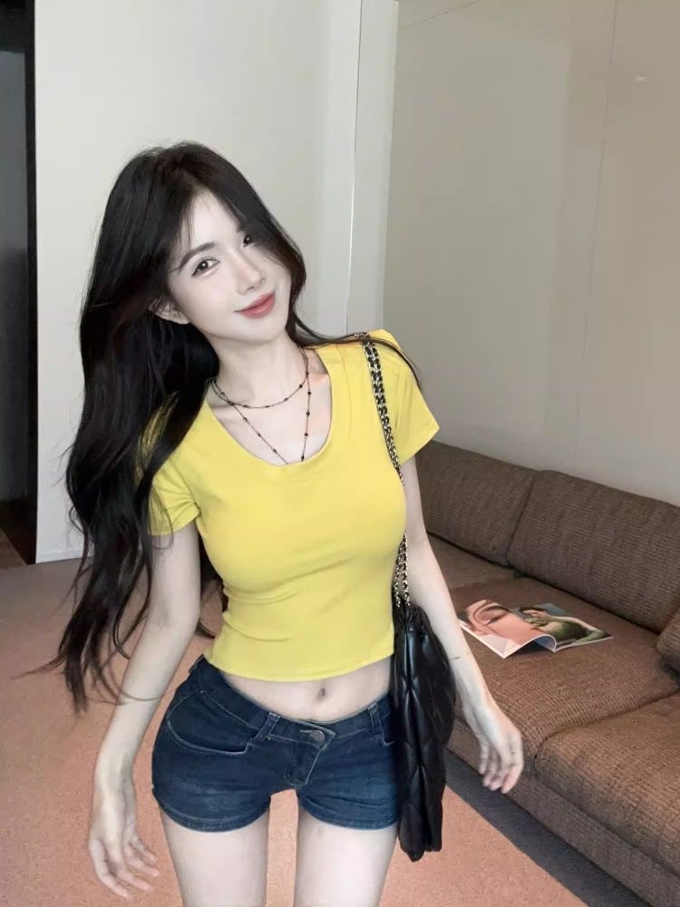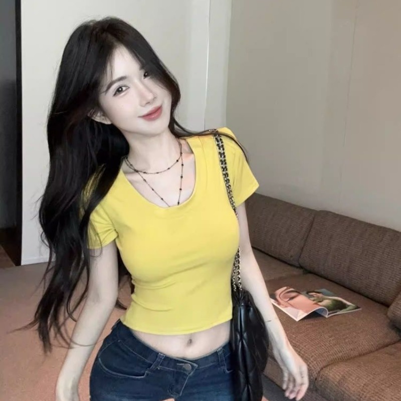 210 그램 40 순면 V넥 스트랩 반팔 티셔츠 여성 긍정적 인 어깨 쇼트 스타일 몸매 가꾸기 맨위