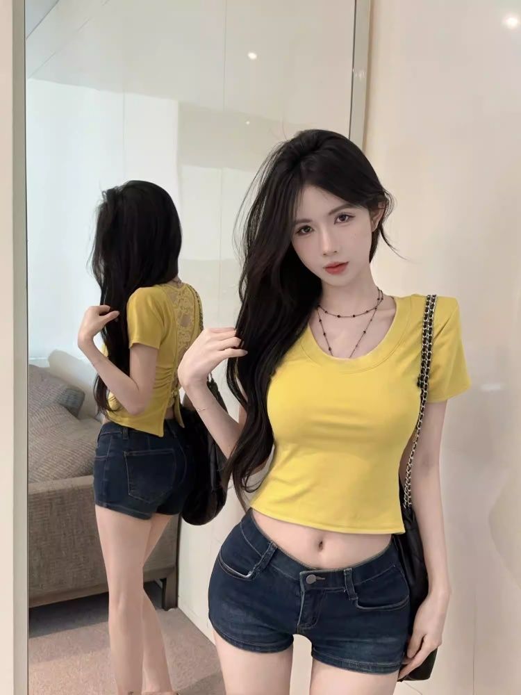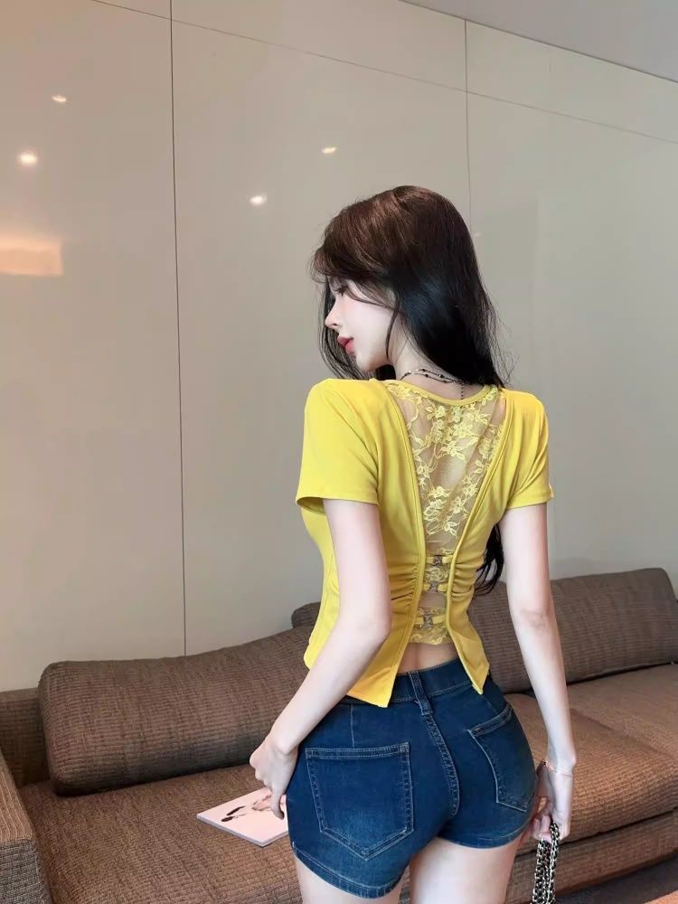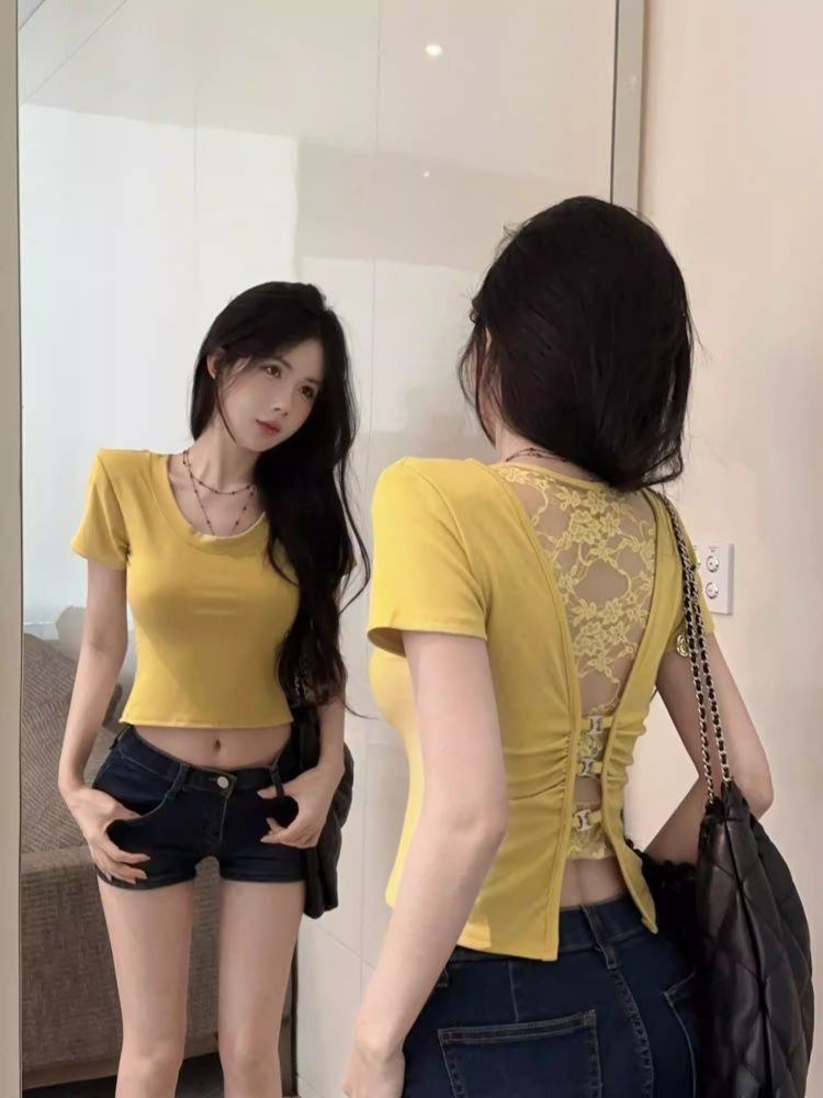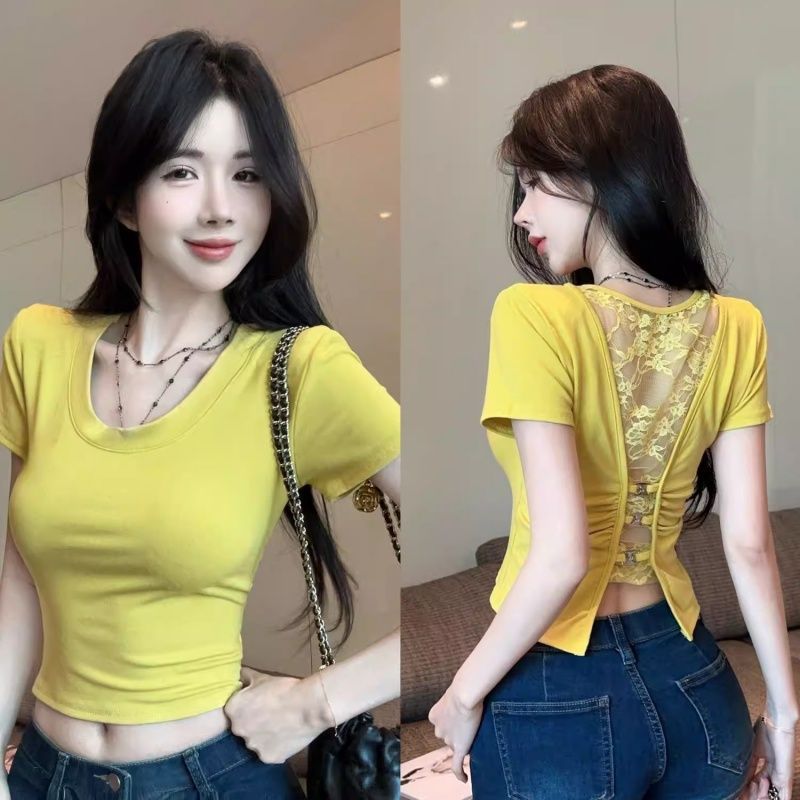 260 그램 사람들 면 모달 레이스 홀로우 아웃 백리스 반팔 티셔츠 여성 몸매 가꾸기 맨위