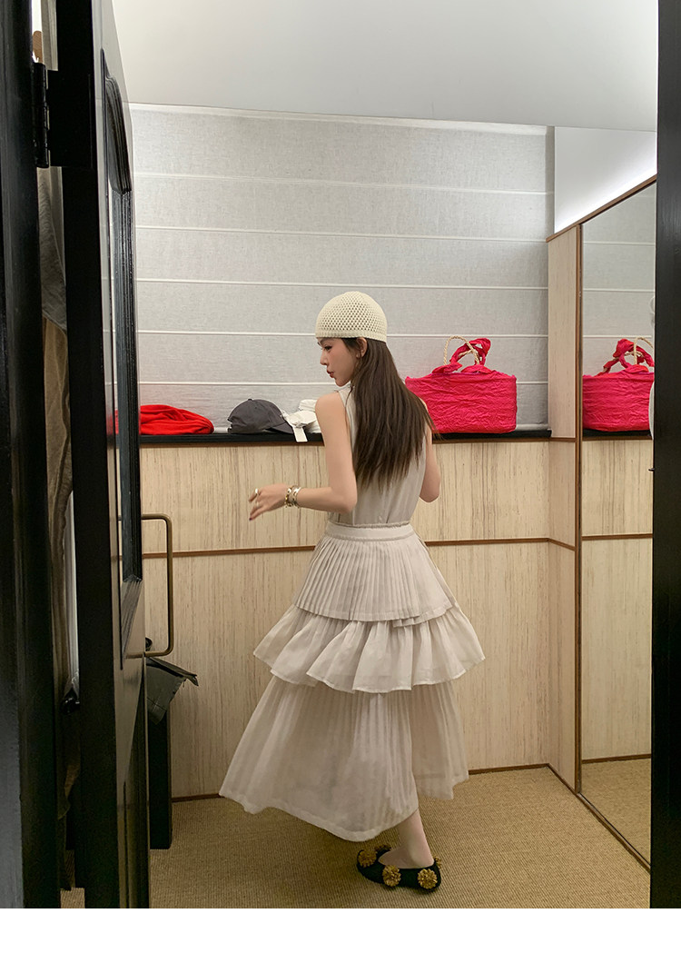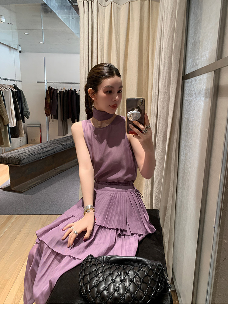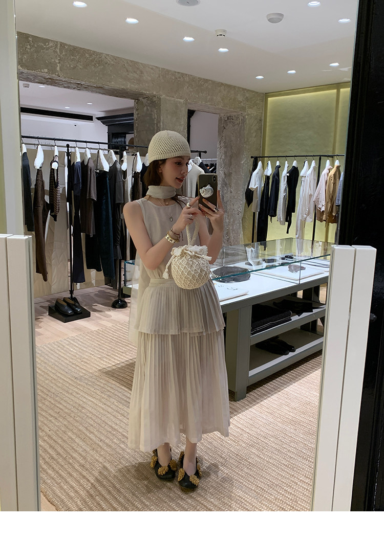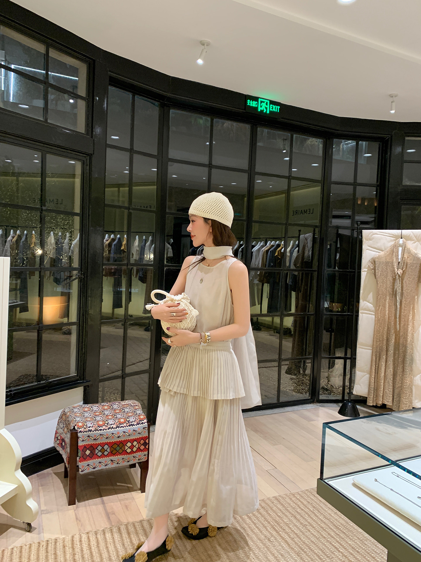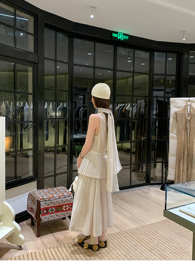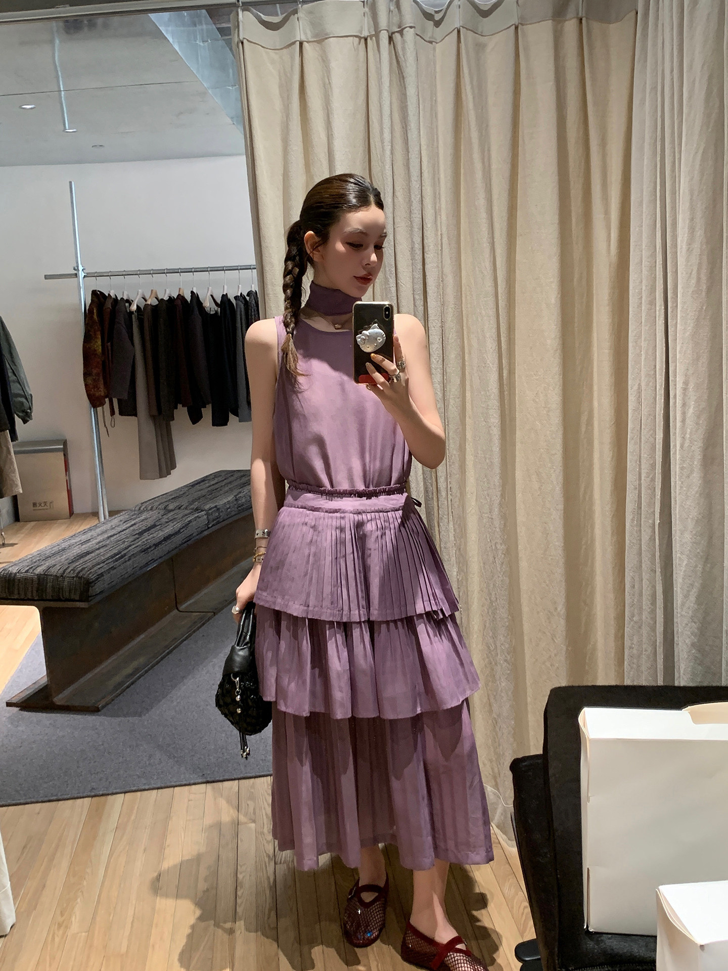 le rouge 주 아름다움 27 번호 늦게 8시 신제품 민소매 드레스 플리츠 반 스커트 앞치마 스카프